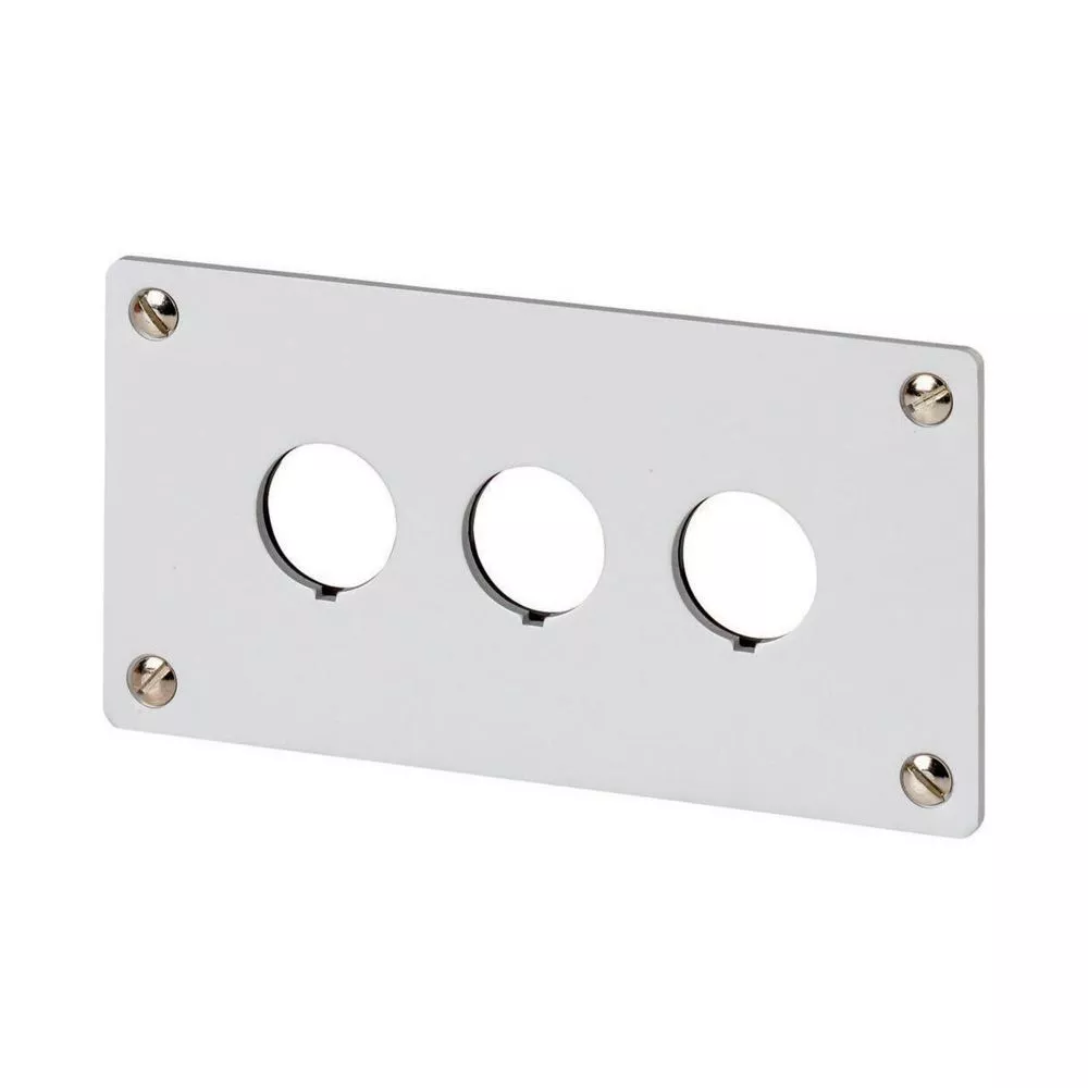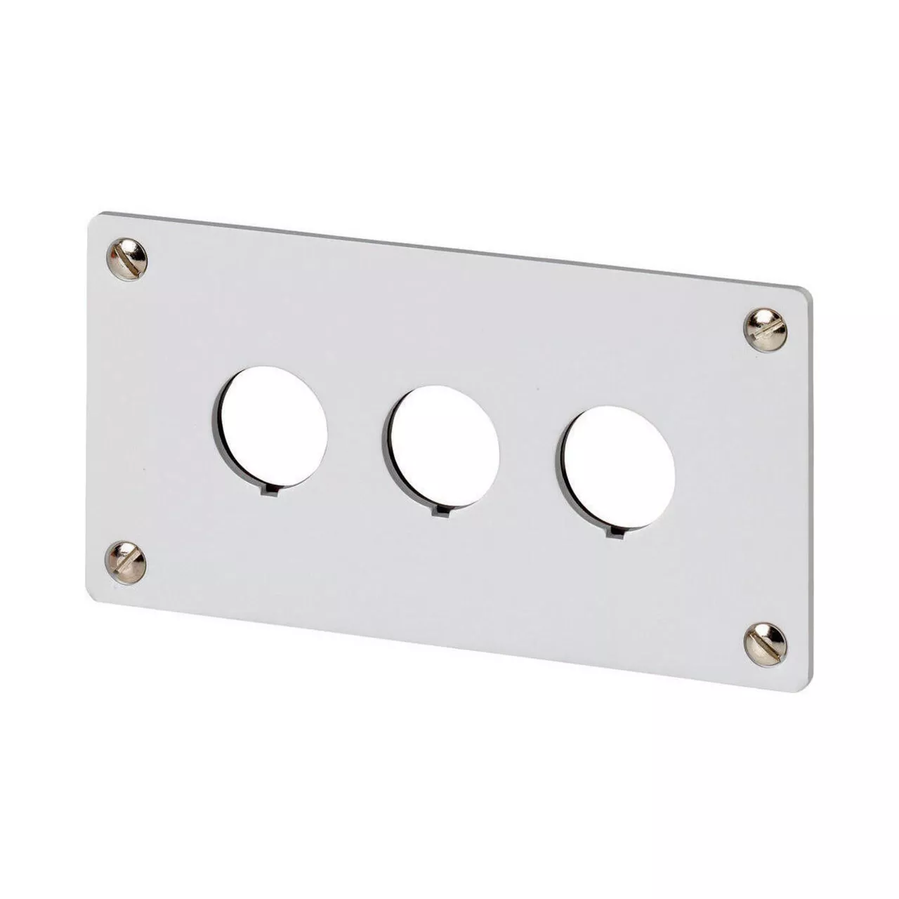 Płyta czołowa, Liczba lokalizacji: 3, Stopień ochrony: IP65, Kolor szary, Wartość koloru RAL: RAL 7035, Podłączanie do SmartWire-DT: nie, Przy rozmieszczeniu prostopadłym nie można stosować dodatkowych tabliczek, Stopień ochrony tylko w połączeniu z odpowiednią obudową i przy prawidłowym montażu., Aluminium jasne anodowane, z M22-XE...