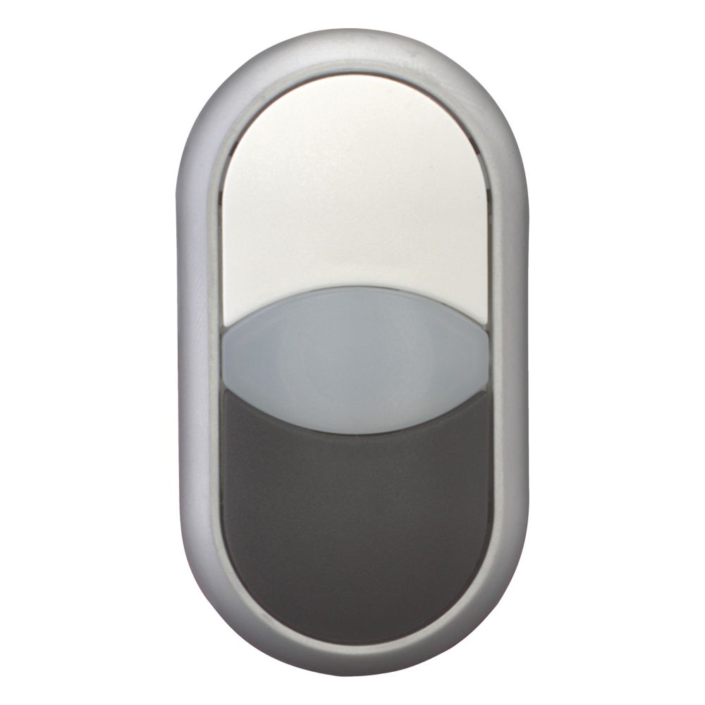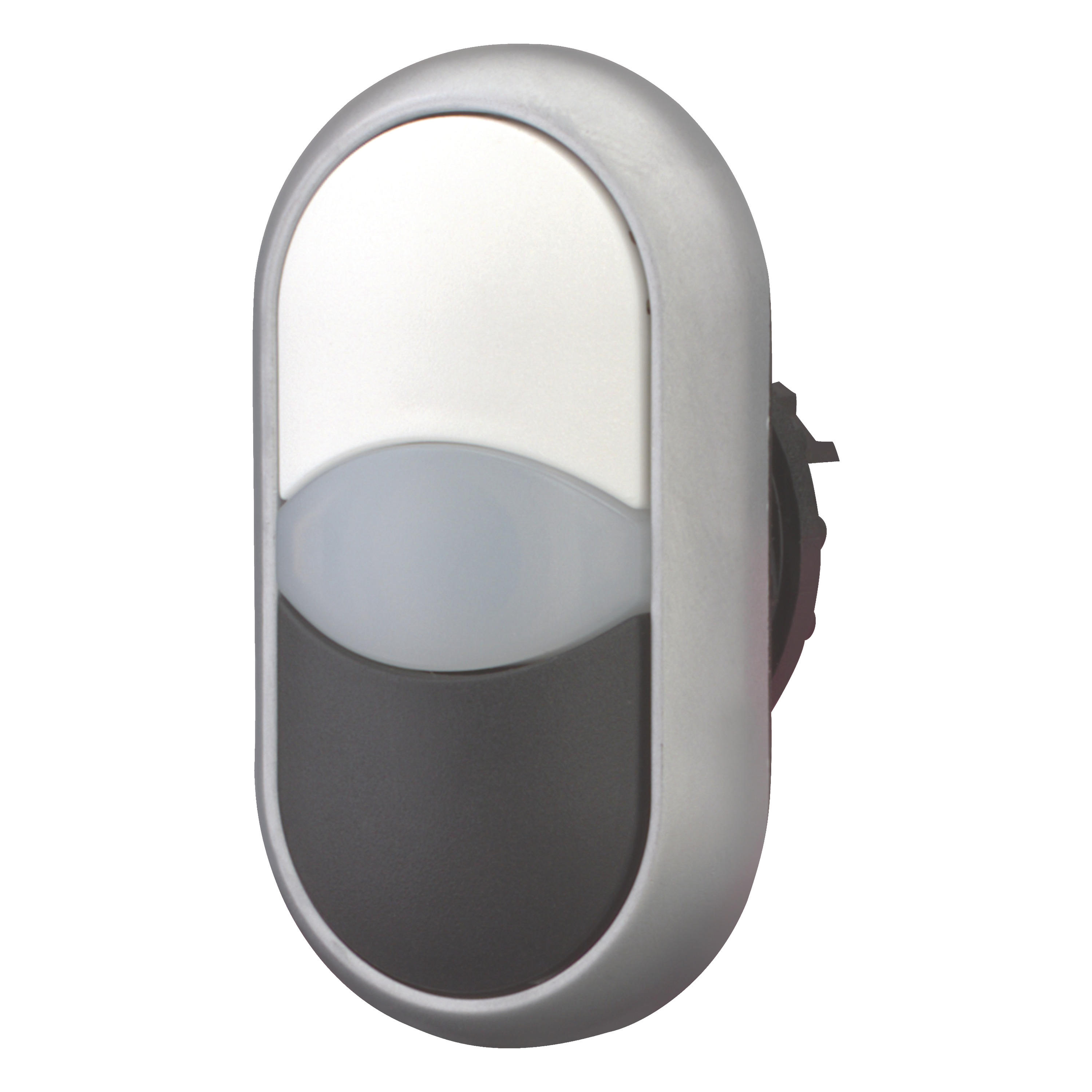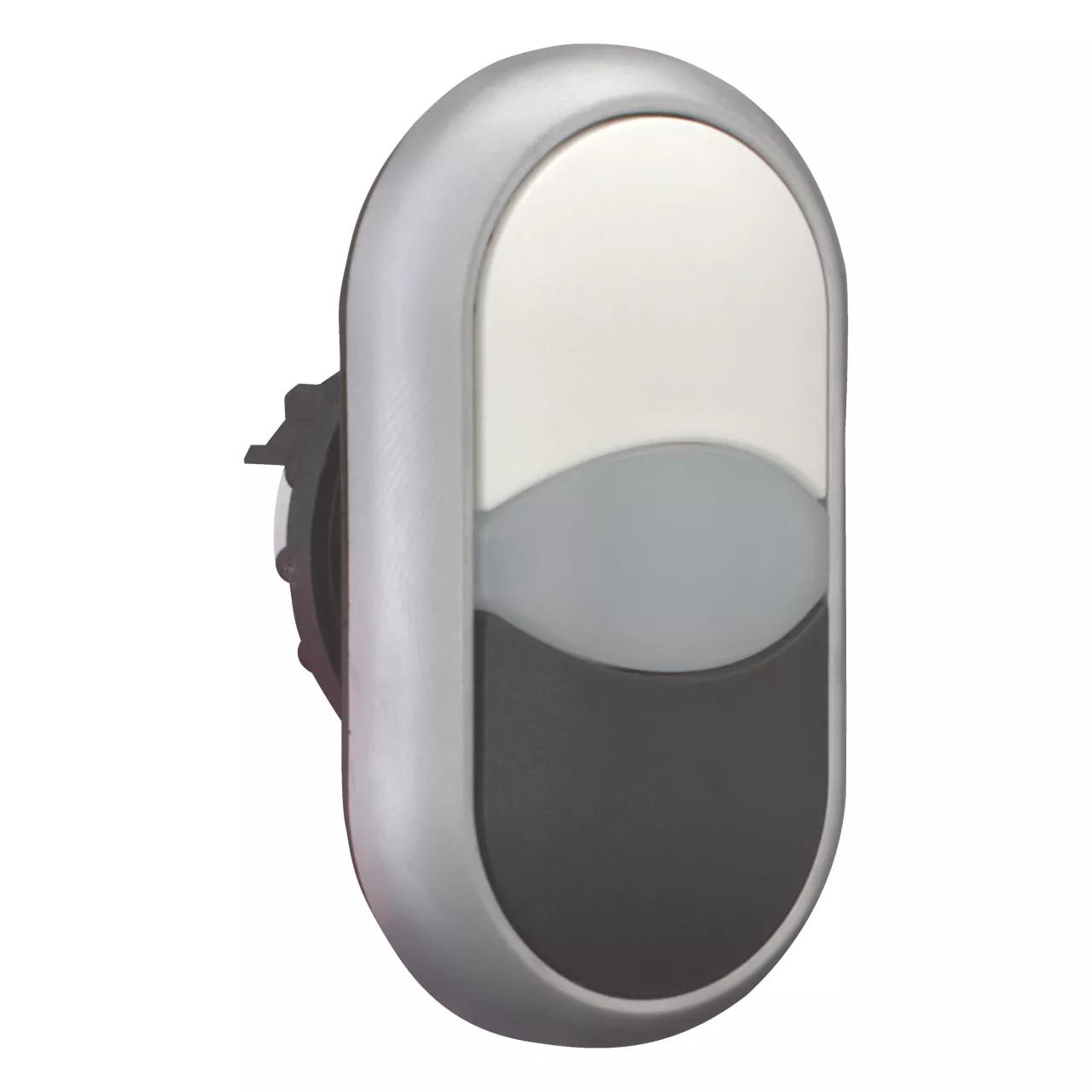 Przycisk podwójny, Zacisk śrubowy: RMQ-Titan, Urządzenie pojedyncze, Projekt: Elementy uruchamiające i lampki sygnalizacyjne niezlicowane, z samopowrotem, Opis: Biała soczewka, wkładka przycisku: biały, czarny, Wkładka przycisku Pusta, Stopień ochrony: IP66, Pierścień czołowy: tytan, Podłączanie do SmartWire-DT: tak, z przyłączami SWD-RMQ, Wymiary przedniej części: 29,7 x 54,7, Normy: IEC/EN 60947, VDE 0660