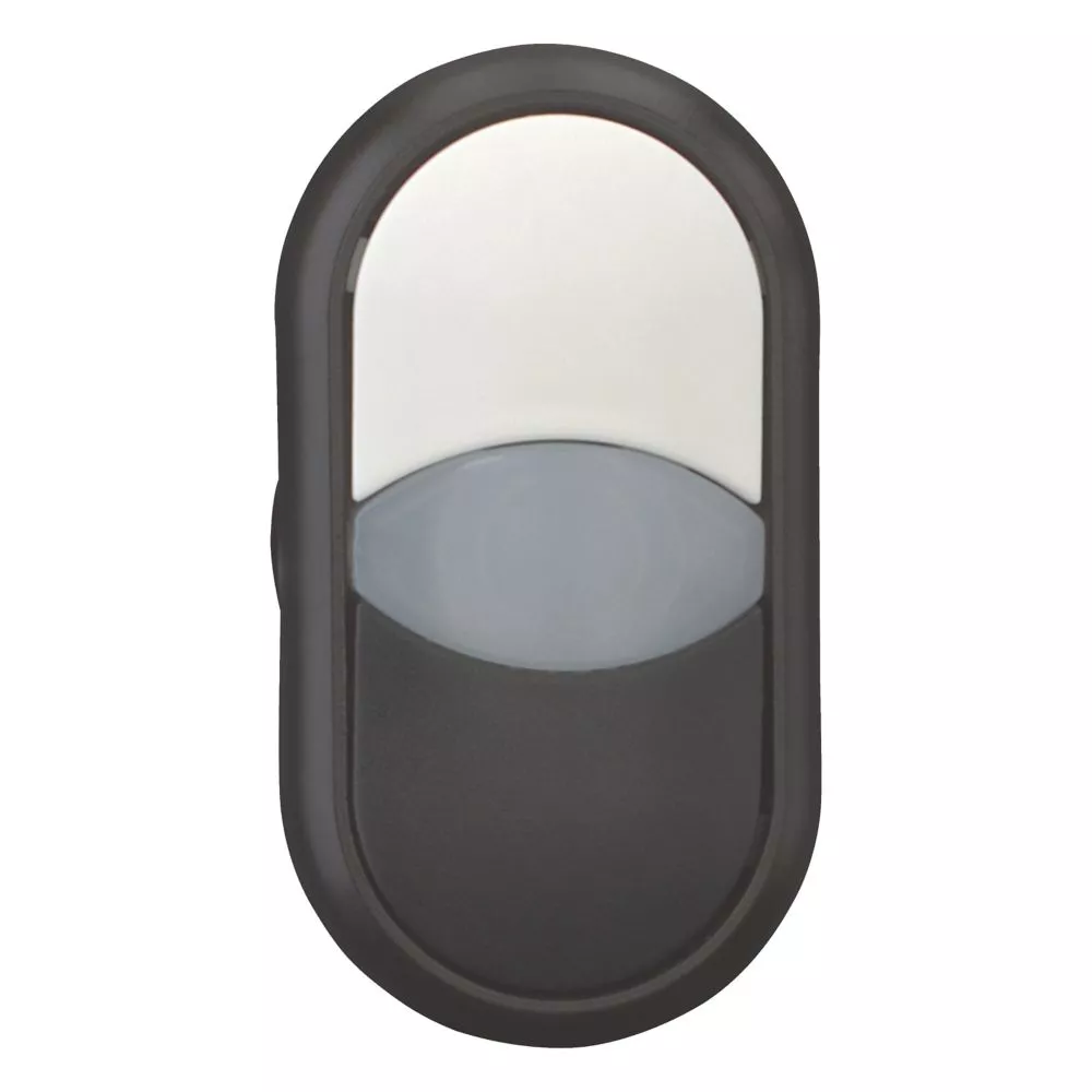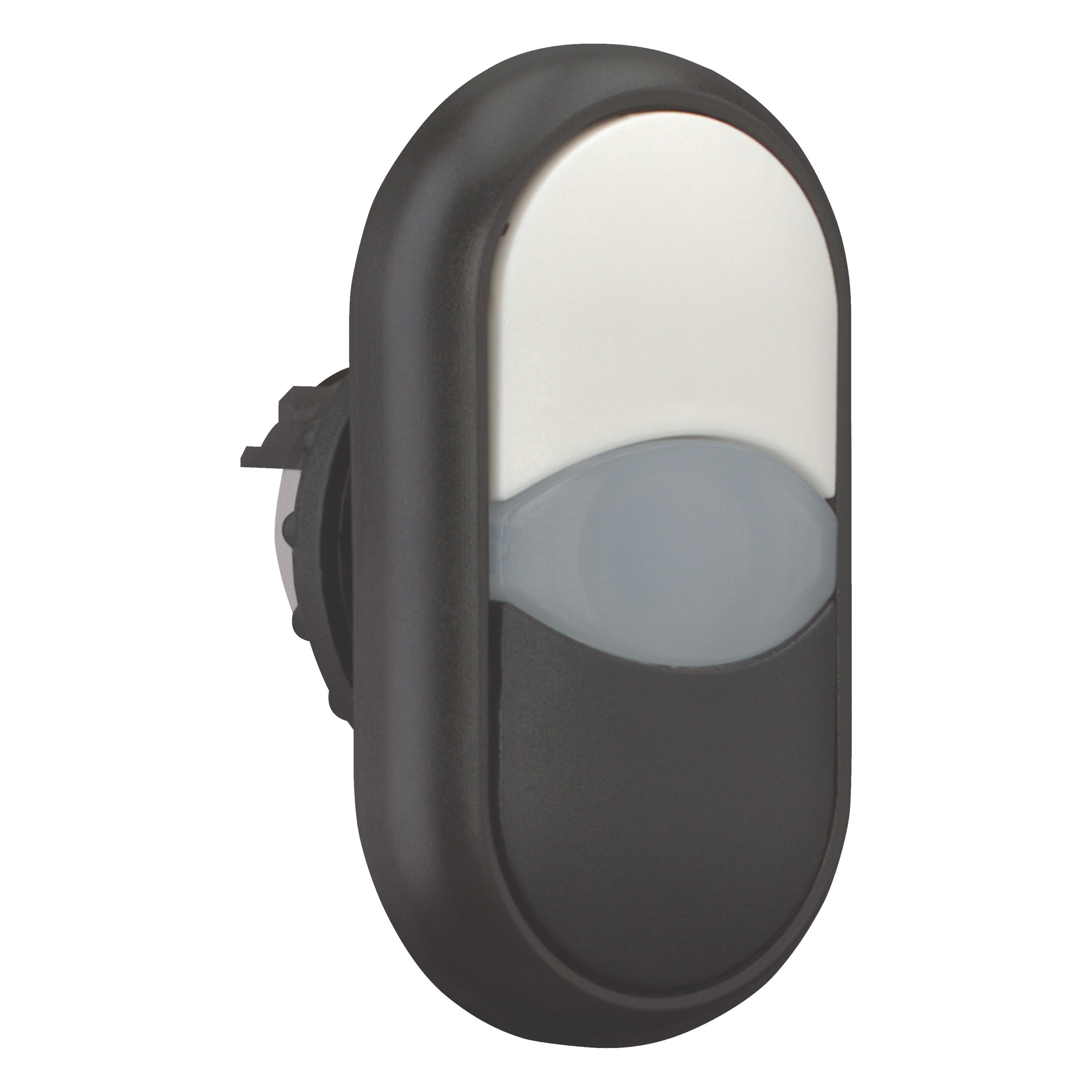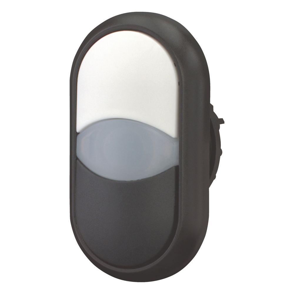 Przycisk podwójny, Zacisk śrubowy: RMQ-Titan, Urządzenie pojedyncze, Projekt: Elementy uruchamiające i lampki sygnalizacyjne niezlicowane, z samopowrotem, Opis: Biała soczewka, wkładka przycisku: biały, czarny, Wkładka przycisku Pusta, Stopień ochrony: IP66, Pierścień czołowy: czarny, Podłączanie do SmartWire-DT: tak, z przyłączami SWD-RMQ, Wymiary przedniej części: 29,7 x 54,7, Normy: IEC/EN 60947, VDE 0660