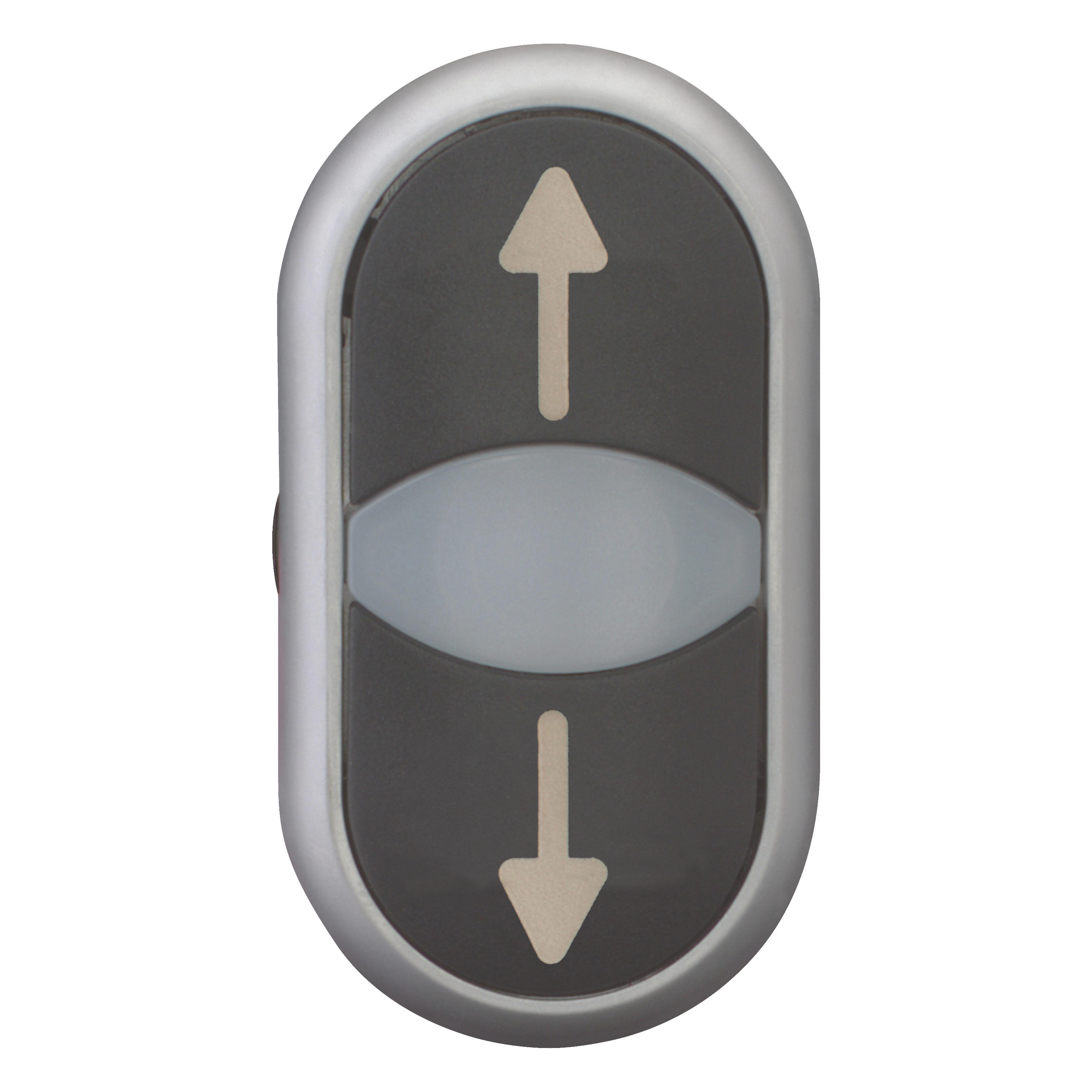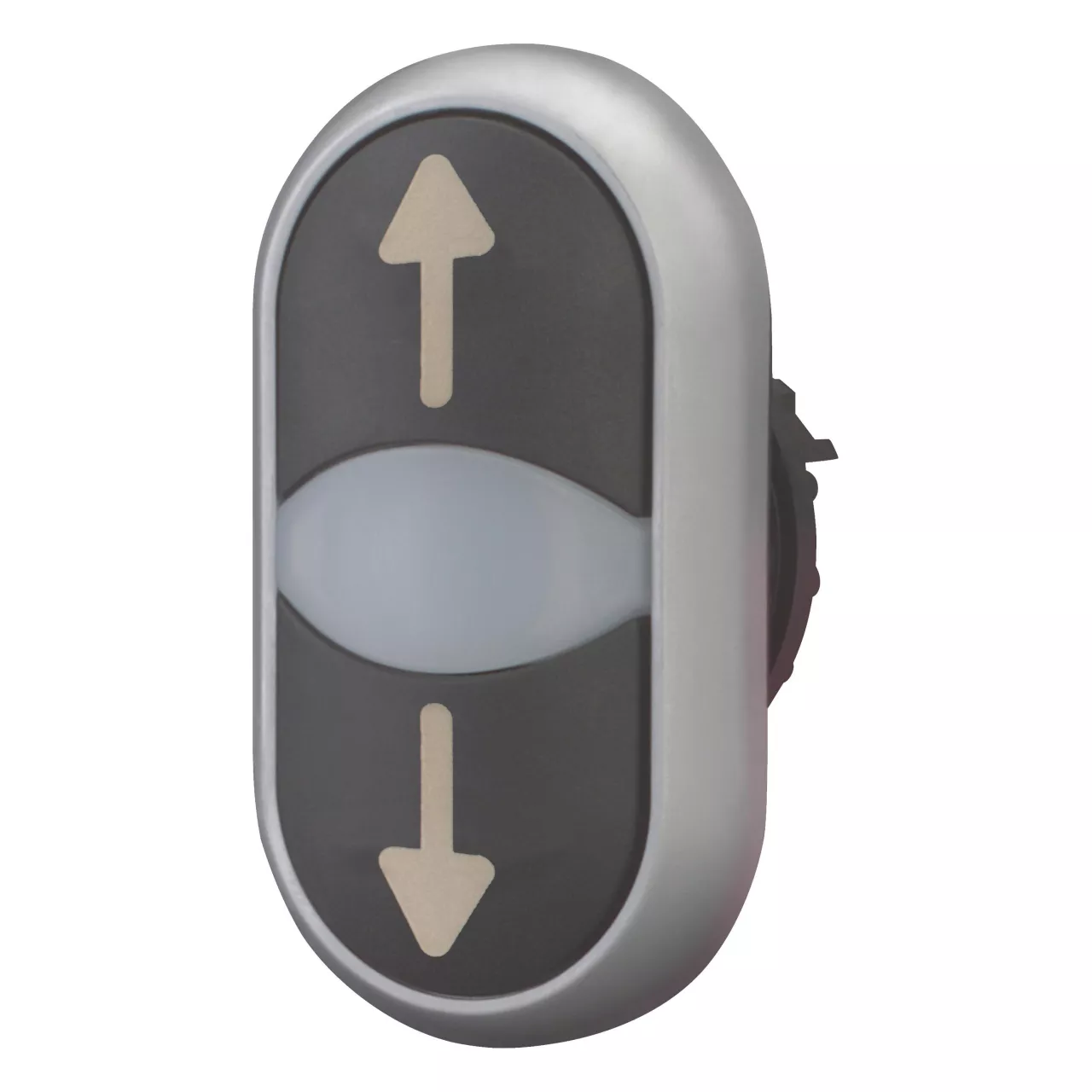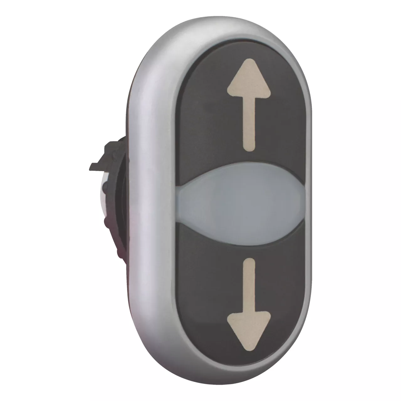 Przycisk podwójny, Zacisk śrubowy: RMQ-Titan, Urządzenie pojedyncze, Projekt: Elementy uruchamiające i lampki sygnalizacyjne niezlicowane, z samopowrotem, Opis: Biała soczewka, wkładka przycisku: czarny, czarny, Wkładka przycisku podpisana, Stopień ochrony: IP66, Pierścień czołowy: tytan, Podłączanie do SmartWire-DT: tak, z przyłączami SWD-RMQ, Wymiary przedniej części: 29,7 x 54,7, Normy: IEC/EN 60947, VDE 0660