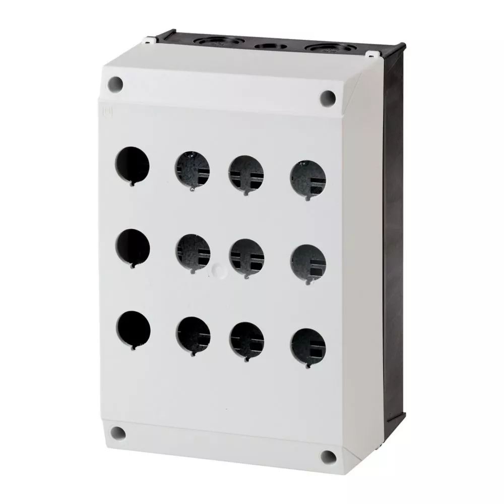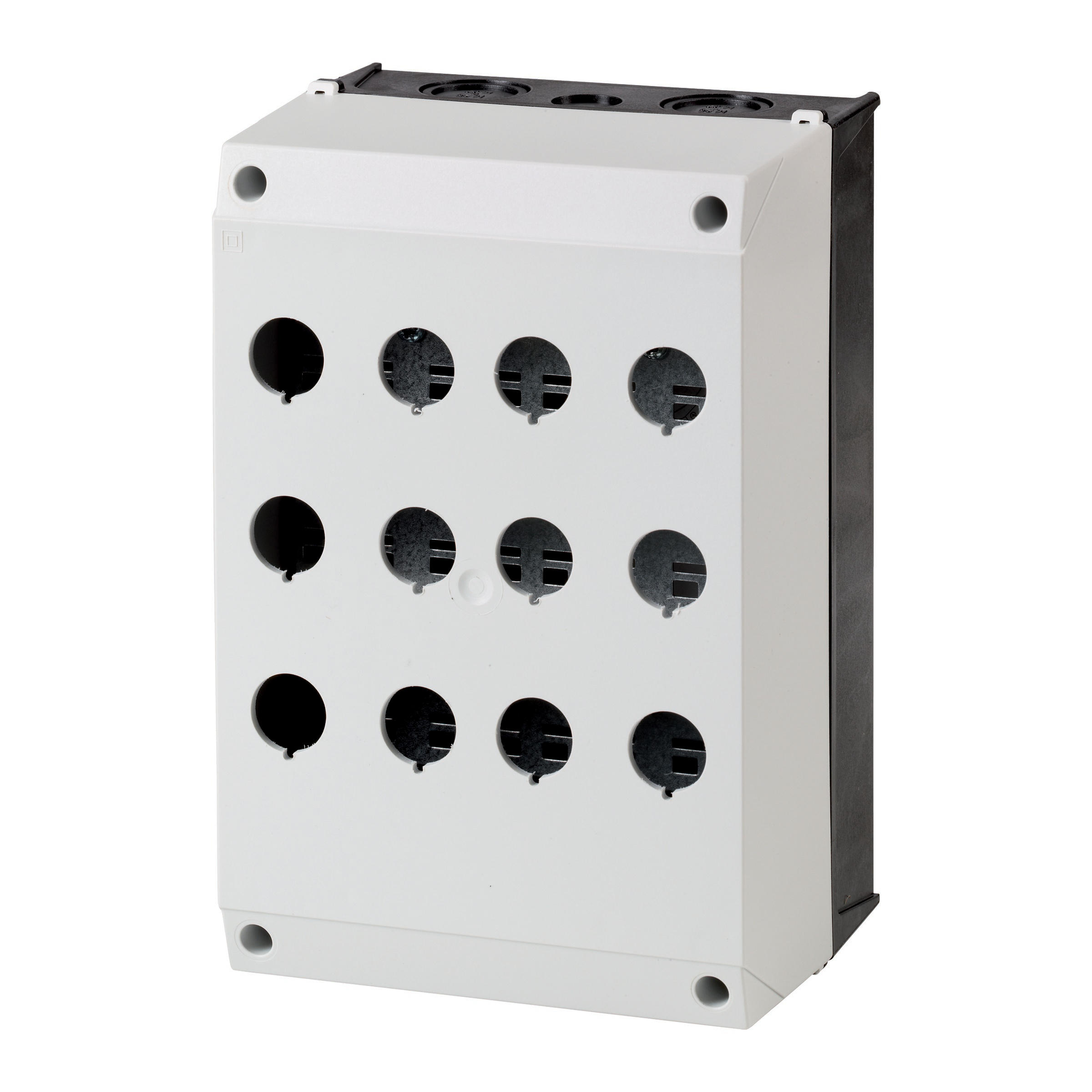 Obudowa do montażu powierzchniowego, Obudowa: Materiał izolowany, ze śrubami ze stali stopowej, Liczba lokalizacji: 12, Stopień ochrony: IP66, Wartość koloru RAL: RAL 7035, Kolor: Dolna część obudowy antracytowa, Podłączanie do SmartWire-DT: nie, Do zastosowania z: 12 x 22,5, Do zastosowania z: Przyciski (z podświetleniem), Przełączniki wybierakowe (z podświetleniem), Przyciski kluczykowe, Lampka sygnalizacyjna, przyciski zatrzymania kontrolowanego/awaryjnego z żółtą tabliczką