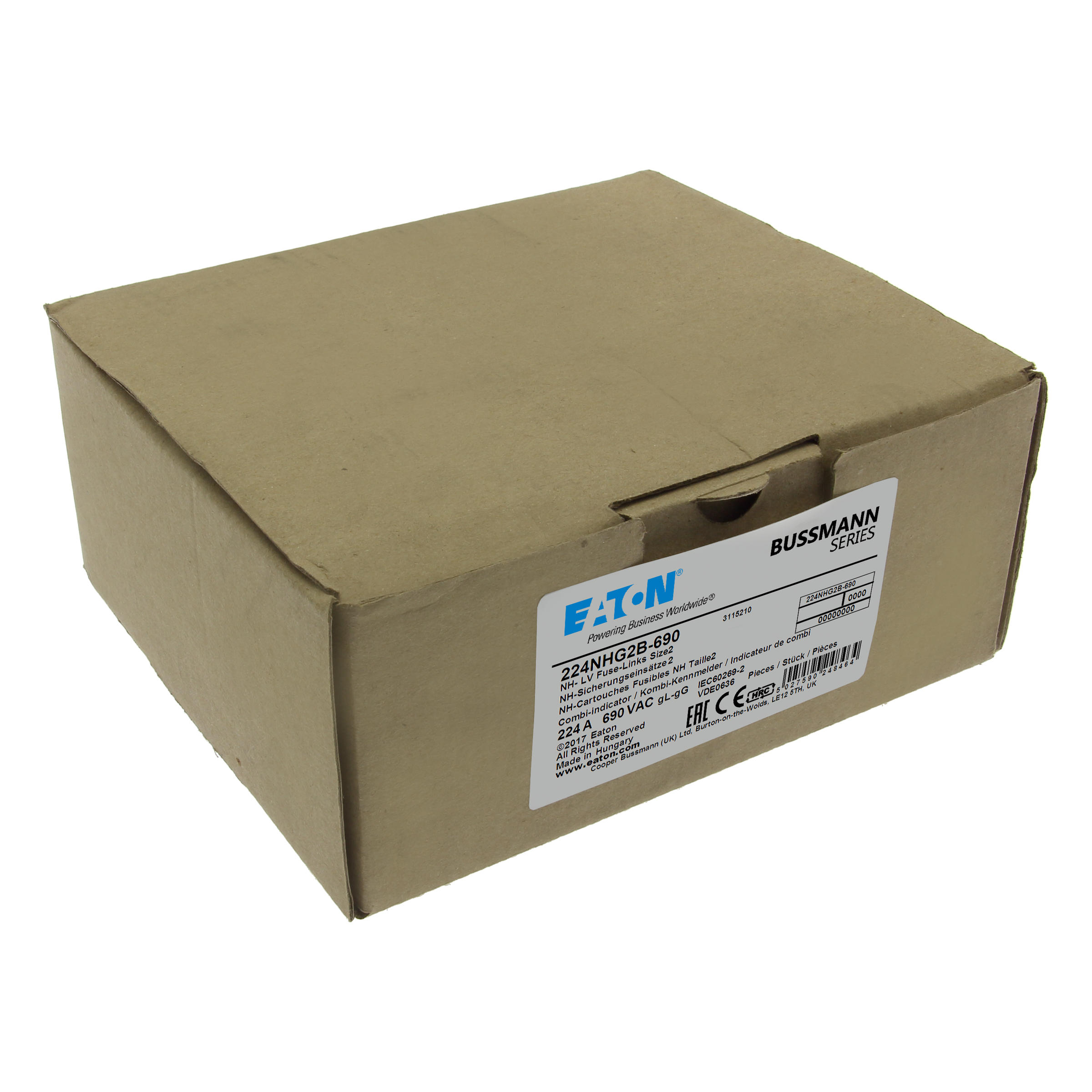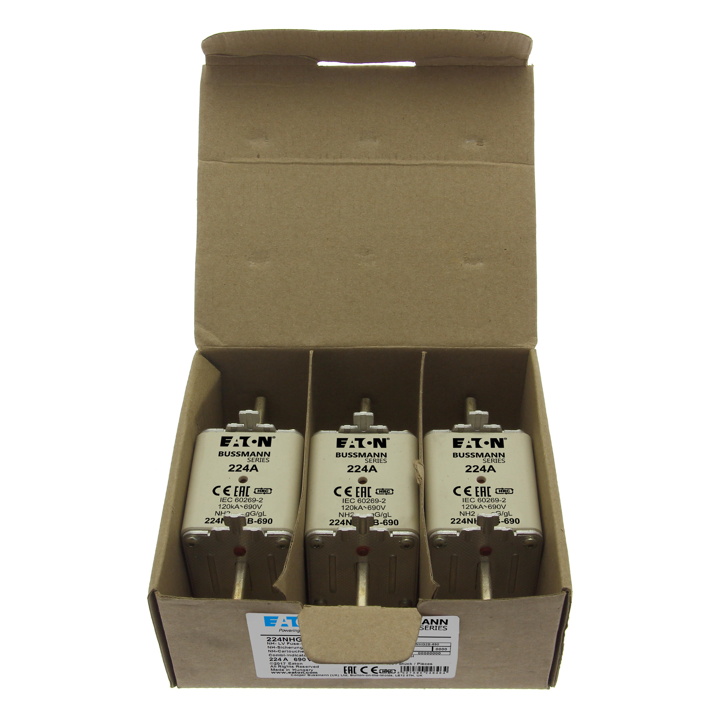 zekering, zekeringelement, Lage spanning, 224 A, AC 690 V, NH2, gL/gG, IEC, dubbel (combinatie-) meldersysteem, vierkant huis met mescontacten, onder spanning staande grepen, IEC 60269-2 zekeringsysteem A, DIN 43620, VDE 0636-2. Uitschakelvermogen 120 kA