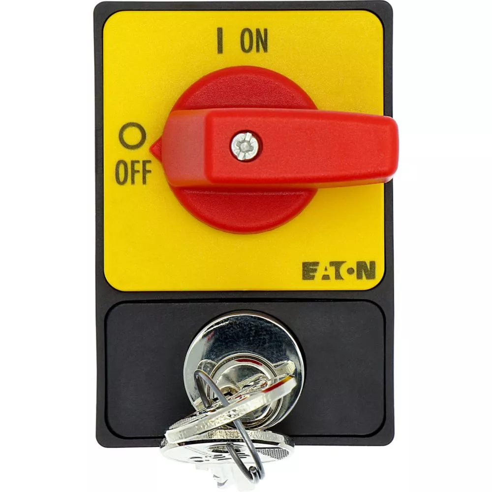 Rozłącznik panikowy, Zacisk śrubowy: Przełącznik z mechanizmem blokującym, Odniesienie grupy części T0, Funkcja zatrzymania: Funkcja wyłączania awaryjnego, z czerwonym pokrętłem z żółtą tabliczką czołową, Informacje dotyczące dostarczonego sprzętu: z dwoma kluczykami, 3-biegunowy, mechanizm blokujący: Zamek cylindryczny SVA, Uwagi: Jeśli kluczyk zostanie wyjęty z wyłącznika zapłonu w położeniu 1, można go wyłączyć, ale nie można ponownie włączyć bez kluczyka., Element blokujący: Możliwość zablokowania w położeniu 0 (Wył.), Stopień ochrony: Przód IP65, Projekt: montaż podtynkowy, Kąt przełączania: 90°, Przebieg łączenia: bez samopowrotu, tabliczka czołowa: 0-1, Moc znamionowa AC-23A, 50 - 60 Hz 400 V: P = 5,5 kW