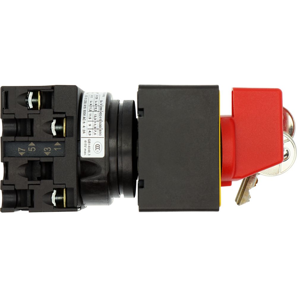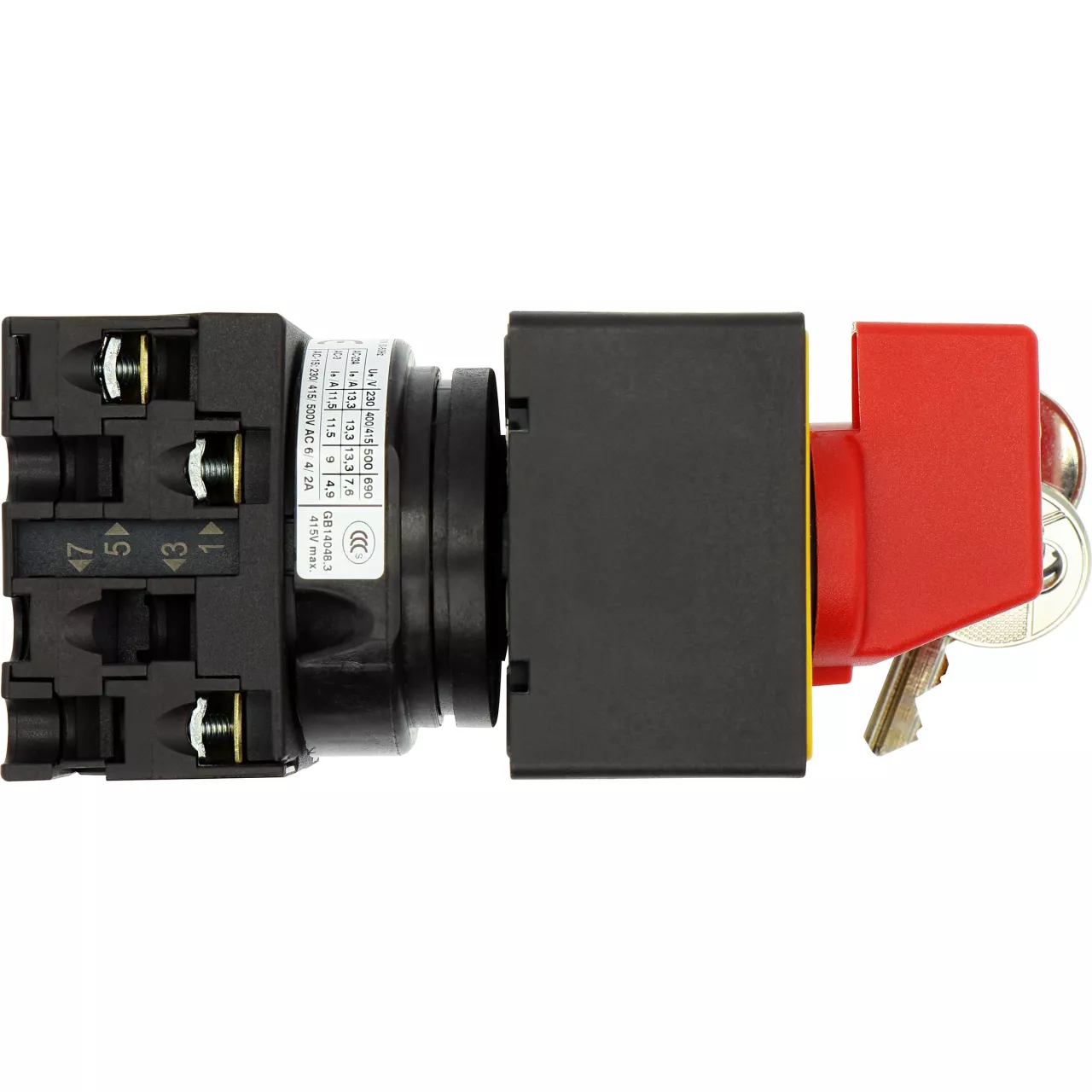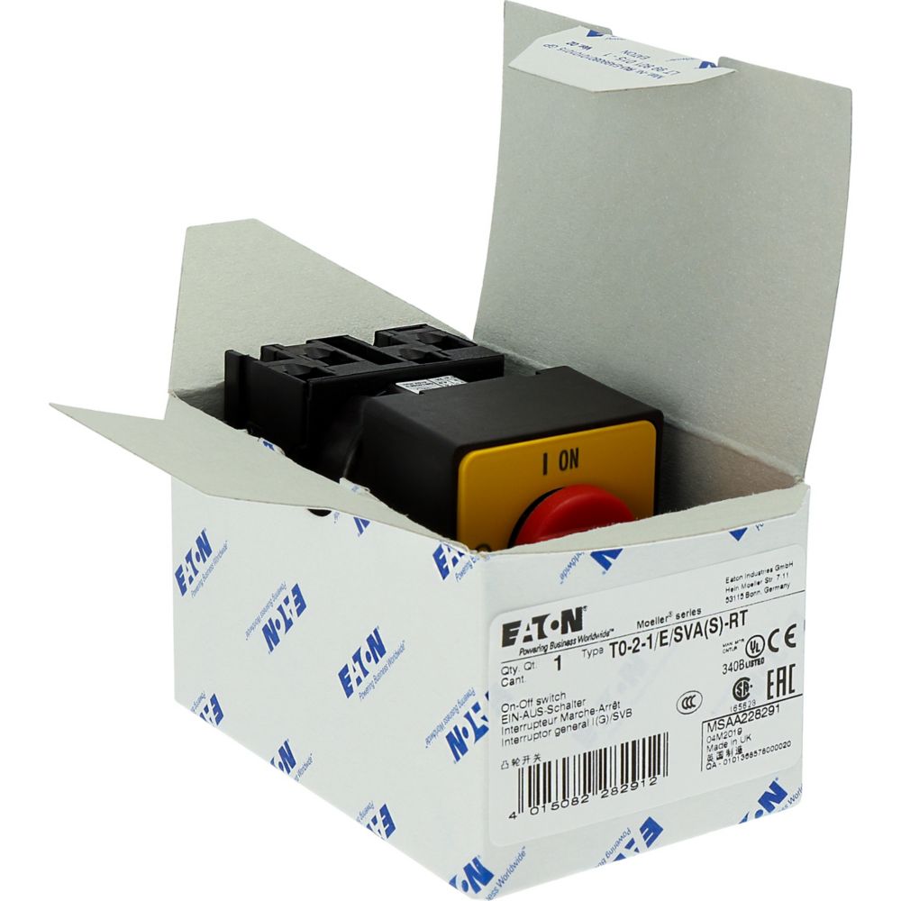 T0-2-1/E/SVA(S)-RT Rozłączniki panikowe, 3 bieg., 20 A, zamek cylindryczny SVA, tabliczka 0-1, 90 °, bez samopowrotu, P, montaż natablicowy, pokrętło czerwono-żółte z zamkiem cylindrycznym