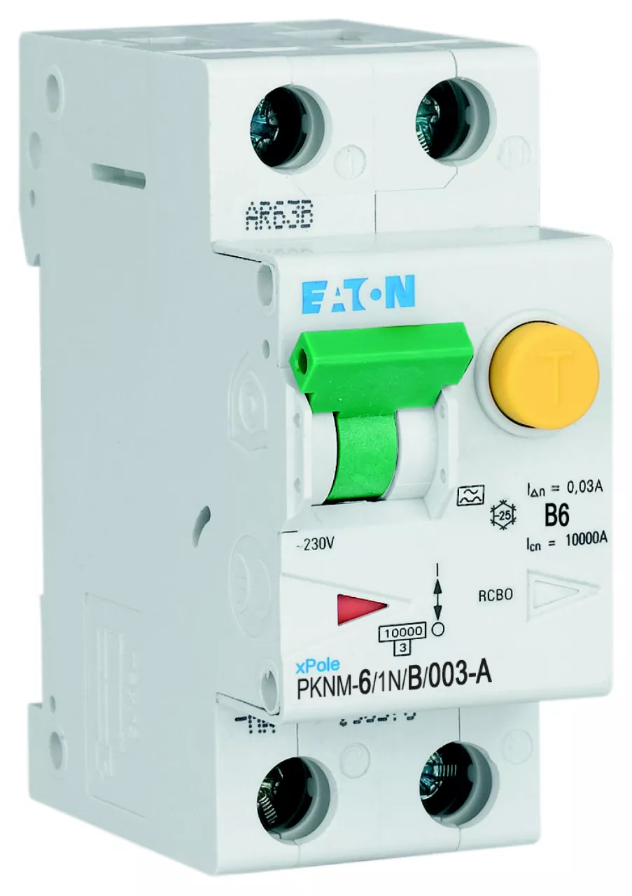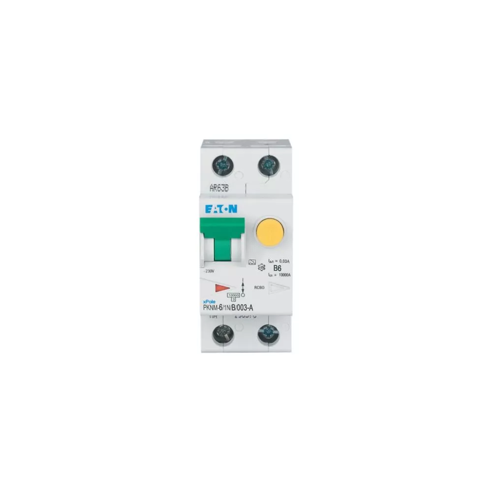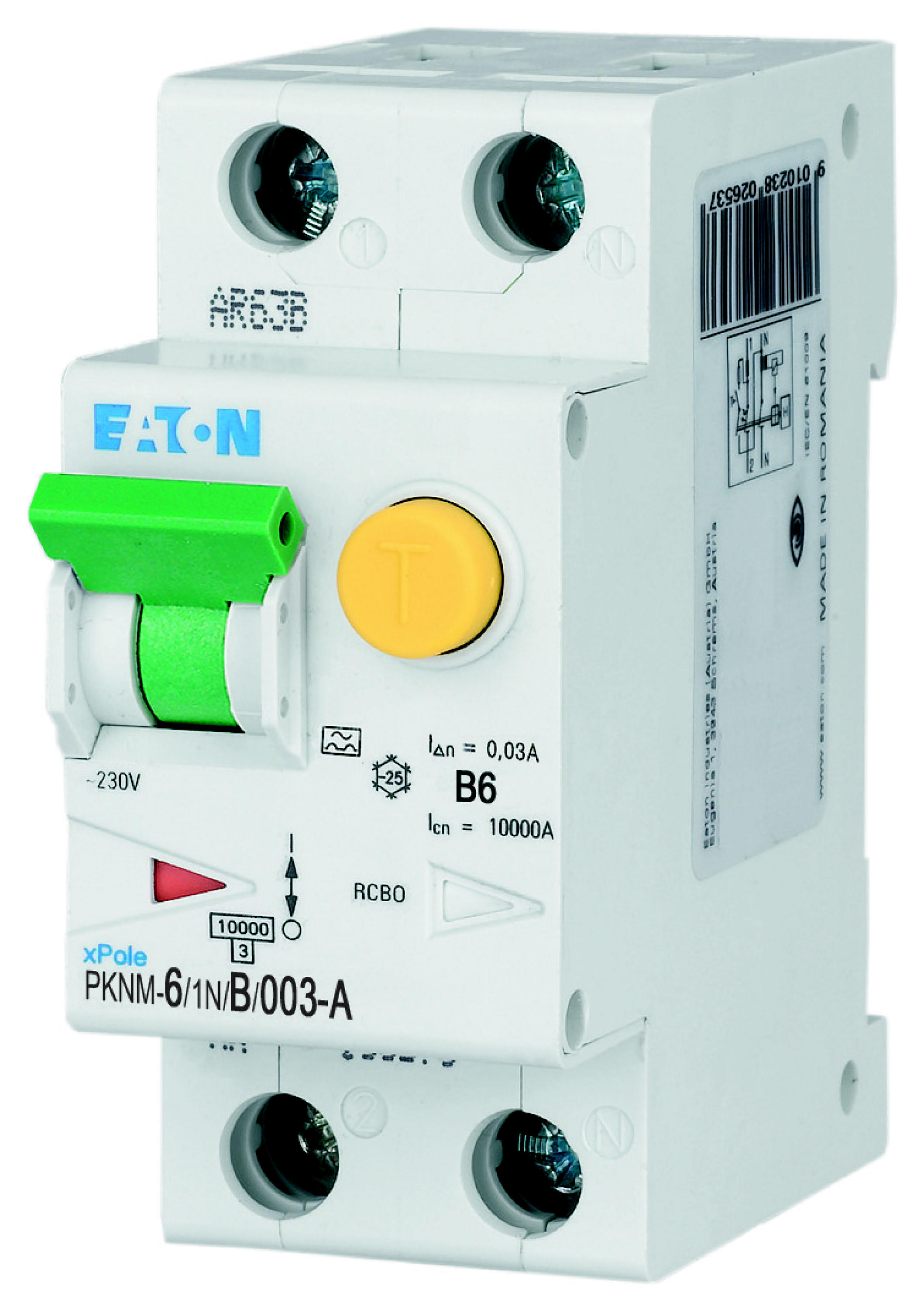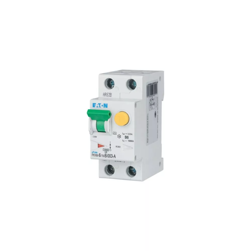 RCBO (wyłącznik różnicowoprądowy z członem nadprądowym) PKNM, 1-biegunowy+N, prąd znamionowy In: 6 A, znamionowy prąd różnicowy IΔN: 0,03 A, znamionowa zdolność łączeniowa zgodnie z normą IEC/EN 61009: 10 kA, Aparatura modułowa do rozdziału energii