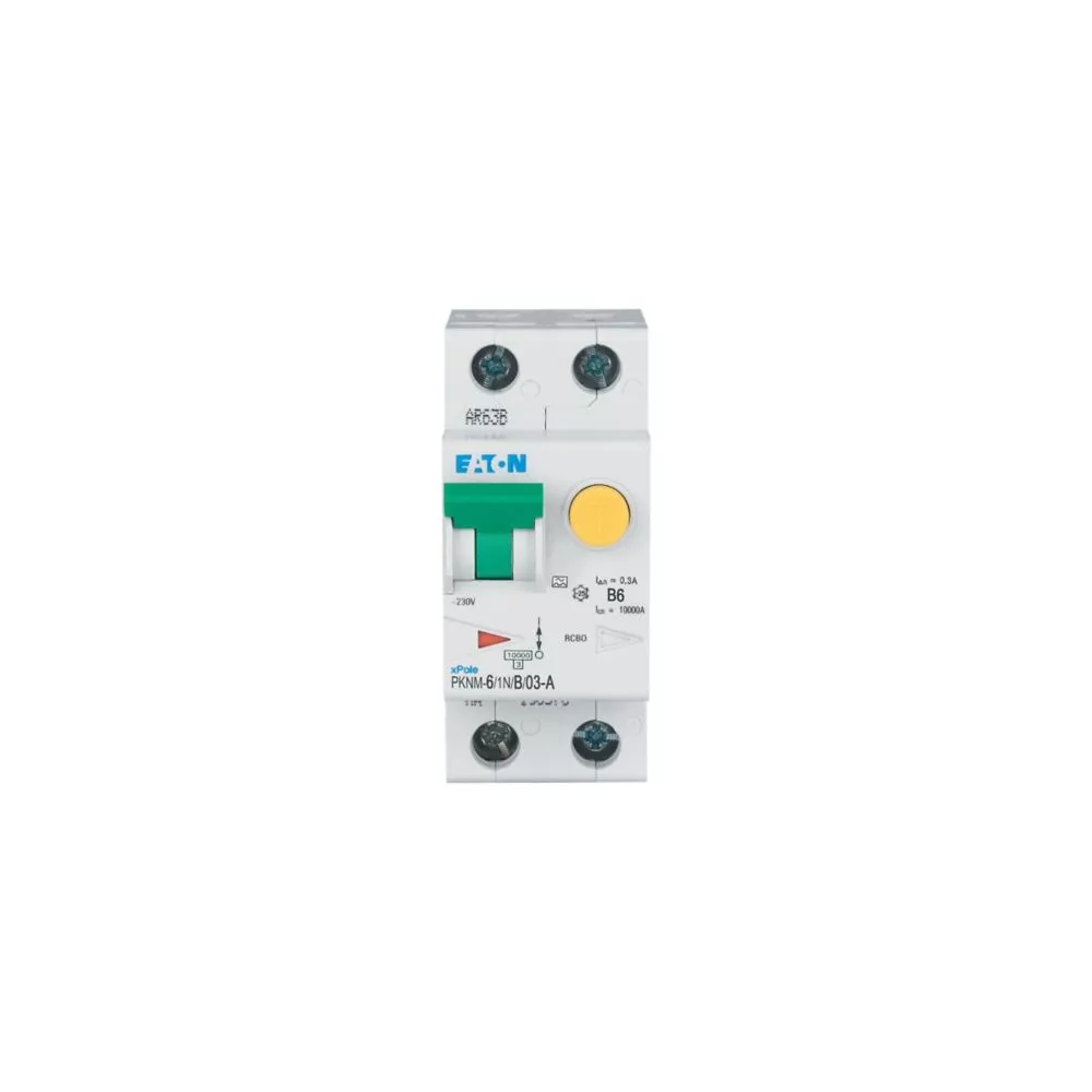 RCBO (wyłącznik różnicowoprądowy z członem nadprądowym) PKNM, 1-biegunowy+N, prąd znamionowy In: 6 A, znamionowy prąd różnicowy IΔN: 0,3 A, znamionowa zdolność łączeniowa zgodnie z normą IEC/EN 61009: 10 kA, aparatura modułowa do rozdziału energii