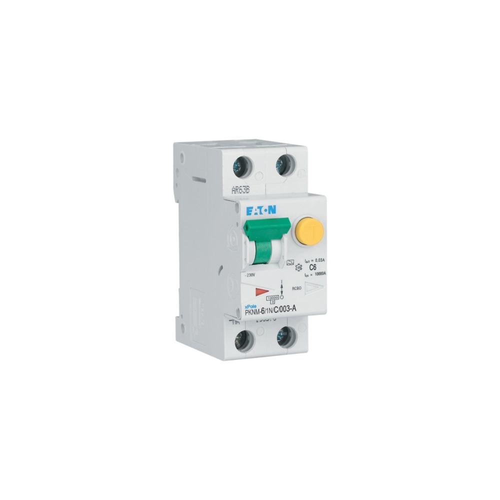 RCBO (wyłącznik różnicowoprądowy z członem nadprądowym) PKNM, 1-biegunowy+N, prąd znamionowy In: 6 A, wartość znamionowa prądu zakłóceniowego IΔN: 0,03 A, znamionowa zdolność łączeniowa zgodnie z normą IEC/EN 61009: 10 kA, Aparatura rozdzielcza do budynków mieszkalnych i funkcjonalnych