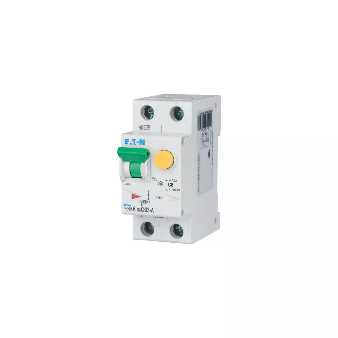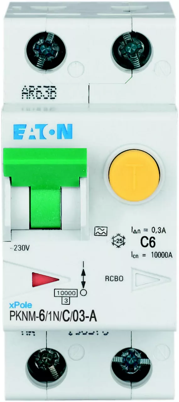 RCBO (wyłącznik różnicowoprądowy z członem nadprądowym) PKNM, 1-biegunowy+N, prąd znamionowy In: 6 A, znamionowy prąd różnicowy IΔN: 0,3 A, znamionowa zdolność łączeniowa zgodnie z normą IEC/EN 61009: 10 kA, aparatura modułowa do rozdziału energii