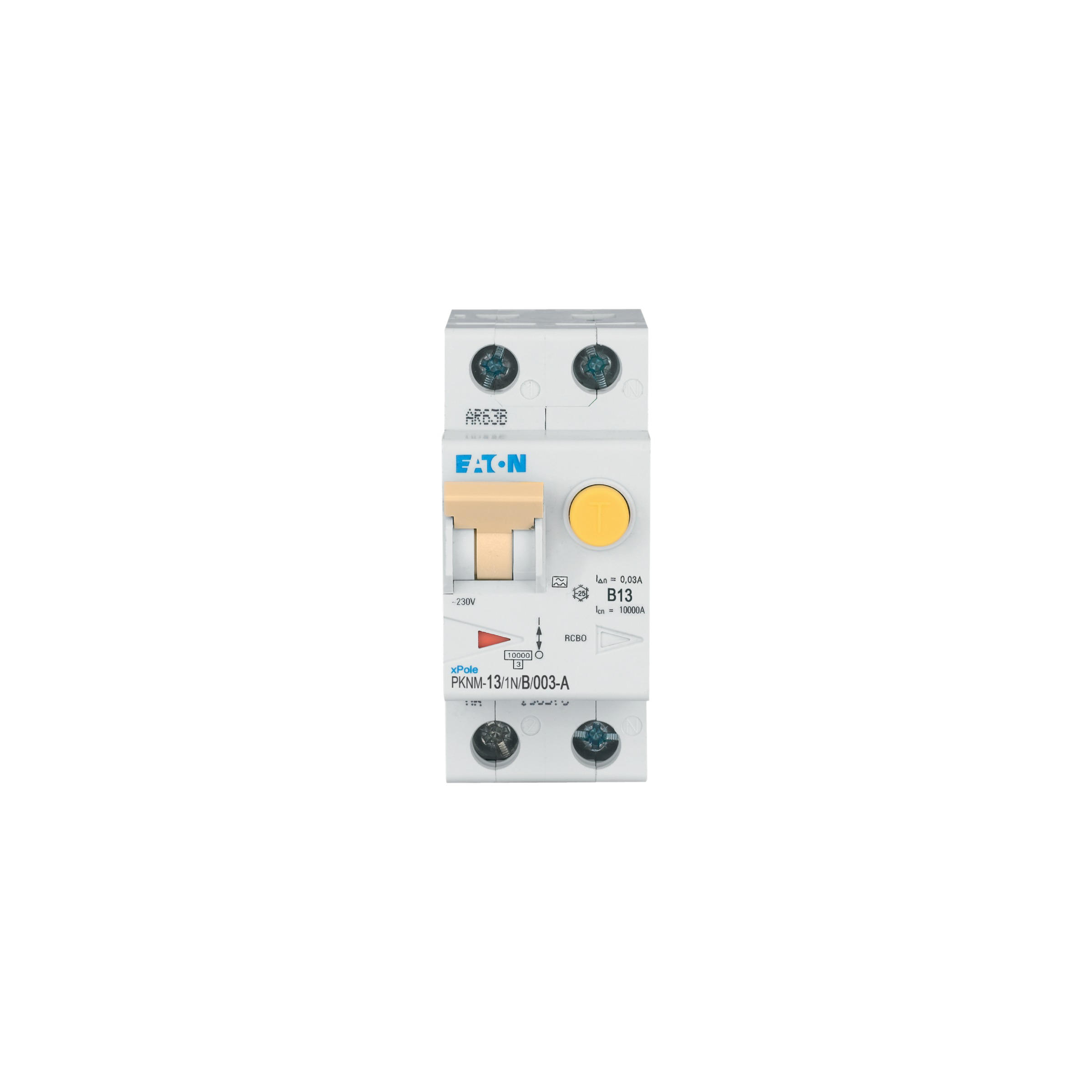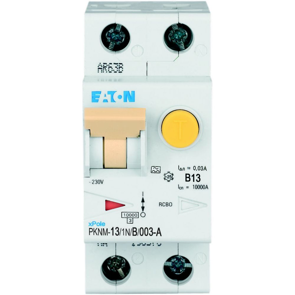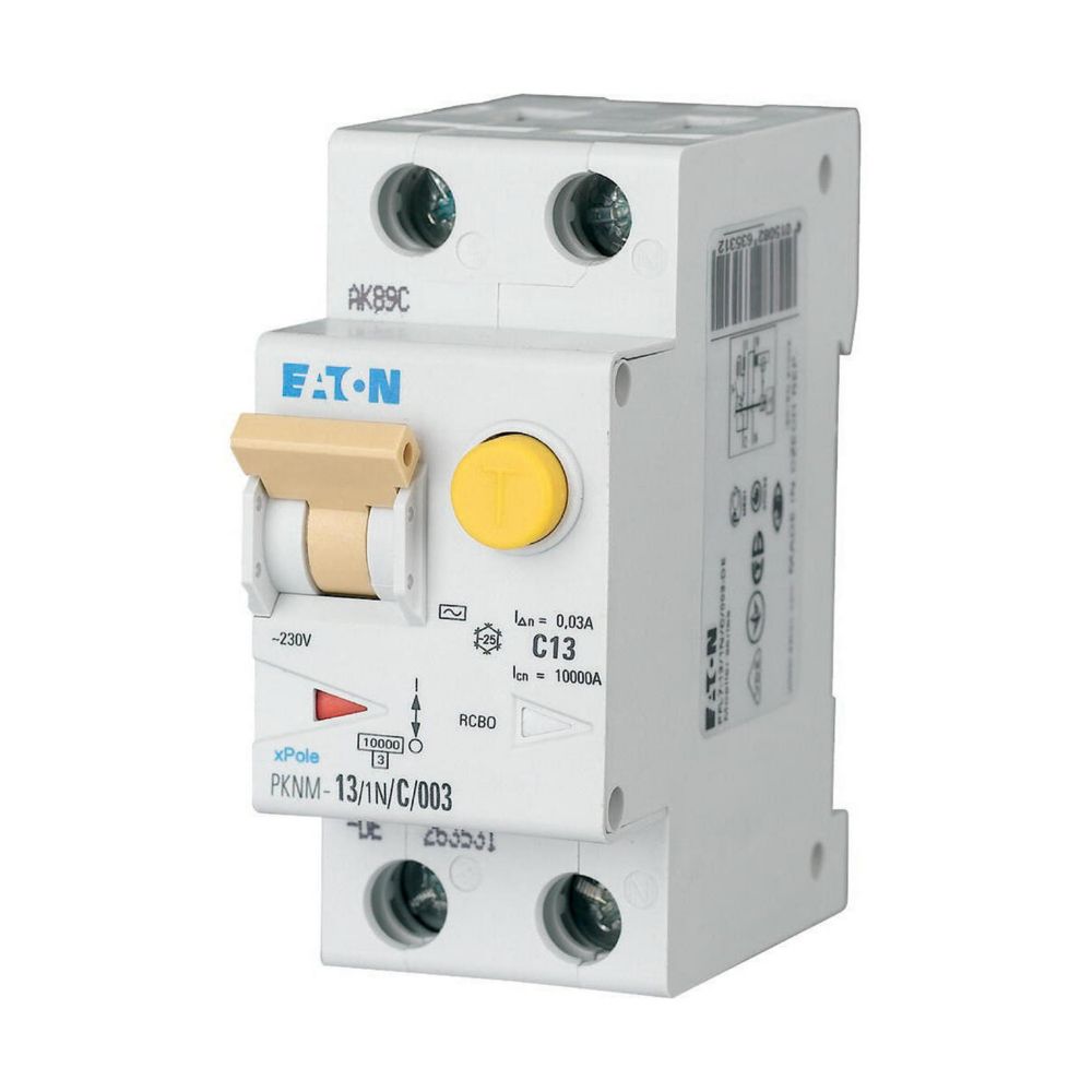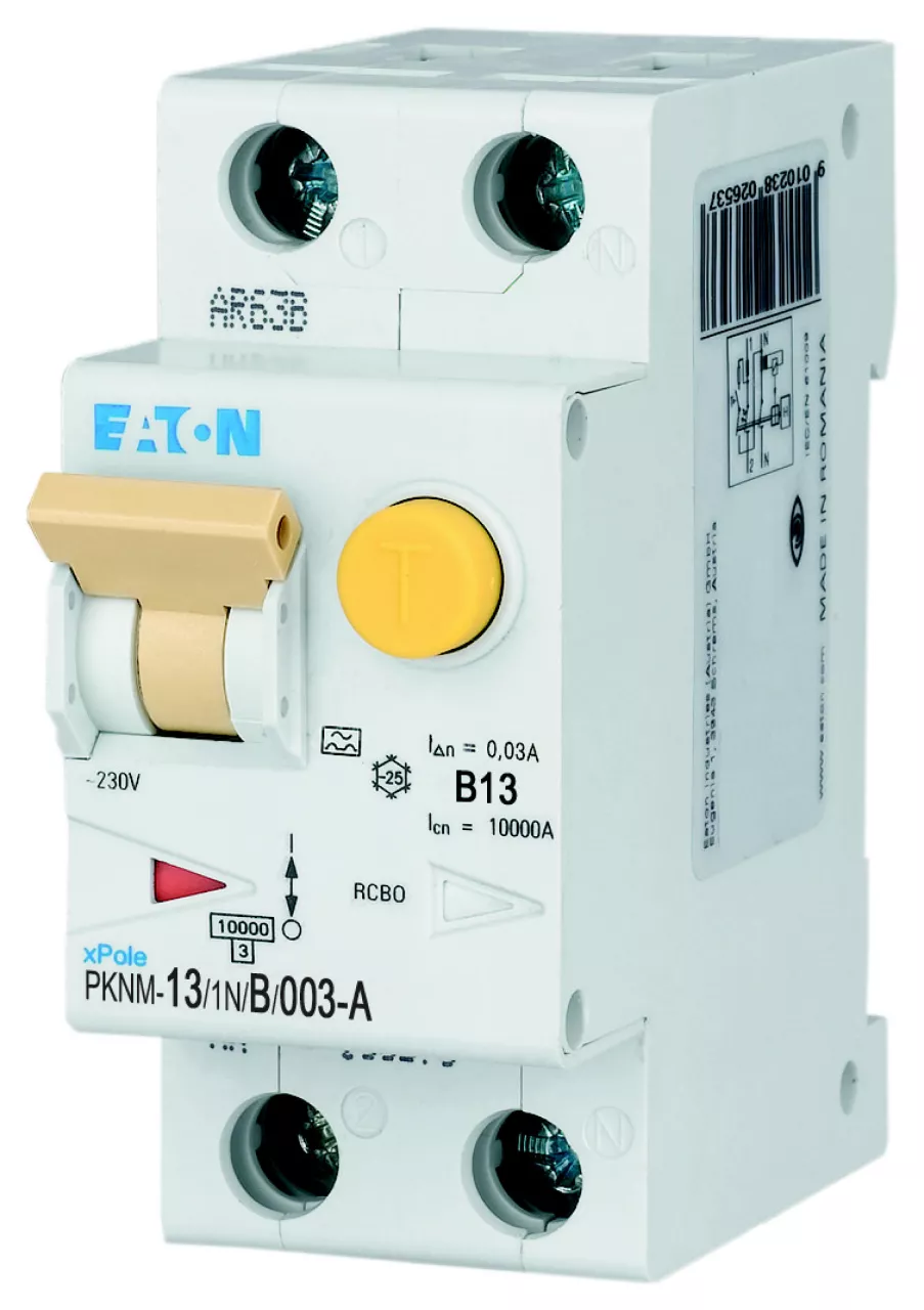 RCBO (wyłącznik różnicowoprądowy z członem nadprądowym) PKNM, 1-biegunowy+N, prąd znamionowy In: 13 A, znamionowy prąd różnicowy IΔN: 0,03 A, znamionowa zdolność łączeniowa zgodnie z normą IEC/EN 61009: 10 kA, Aparatura modułowa do rozdziału energii