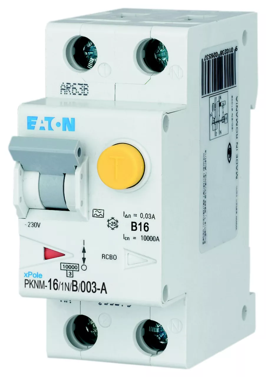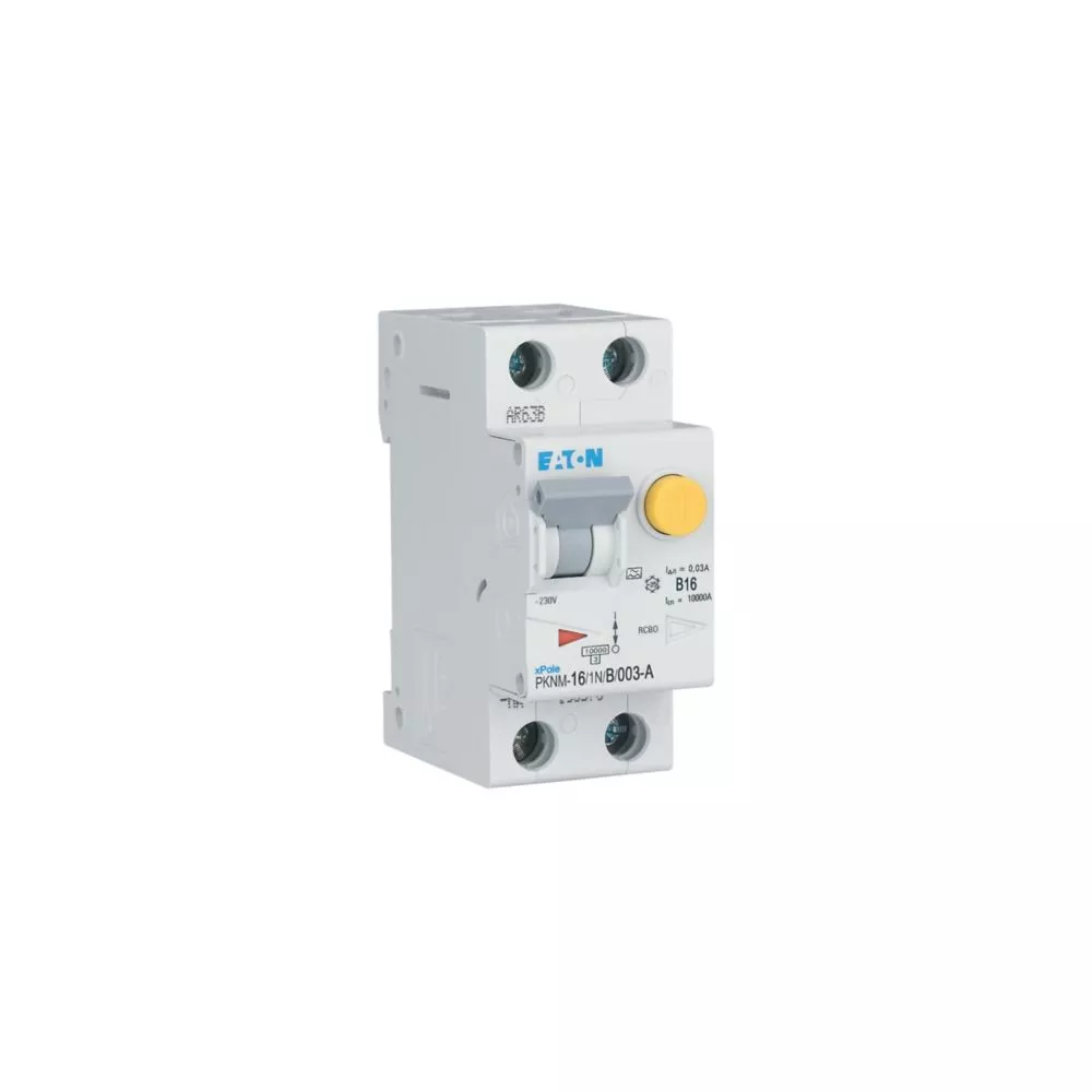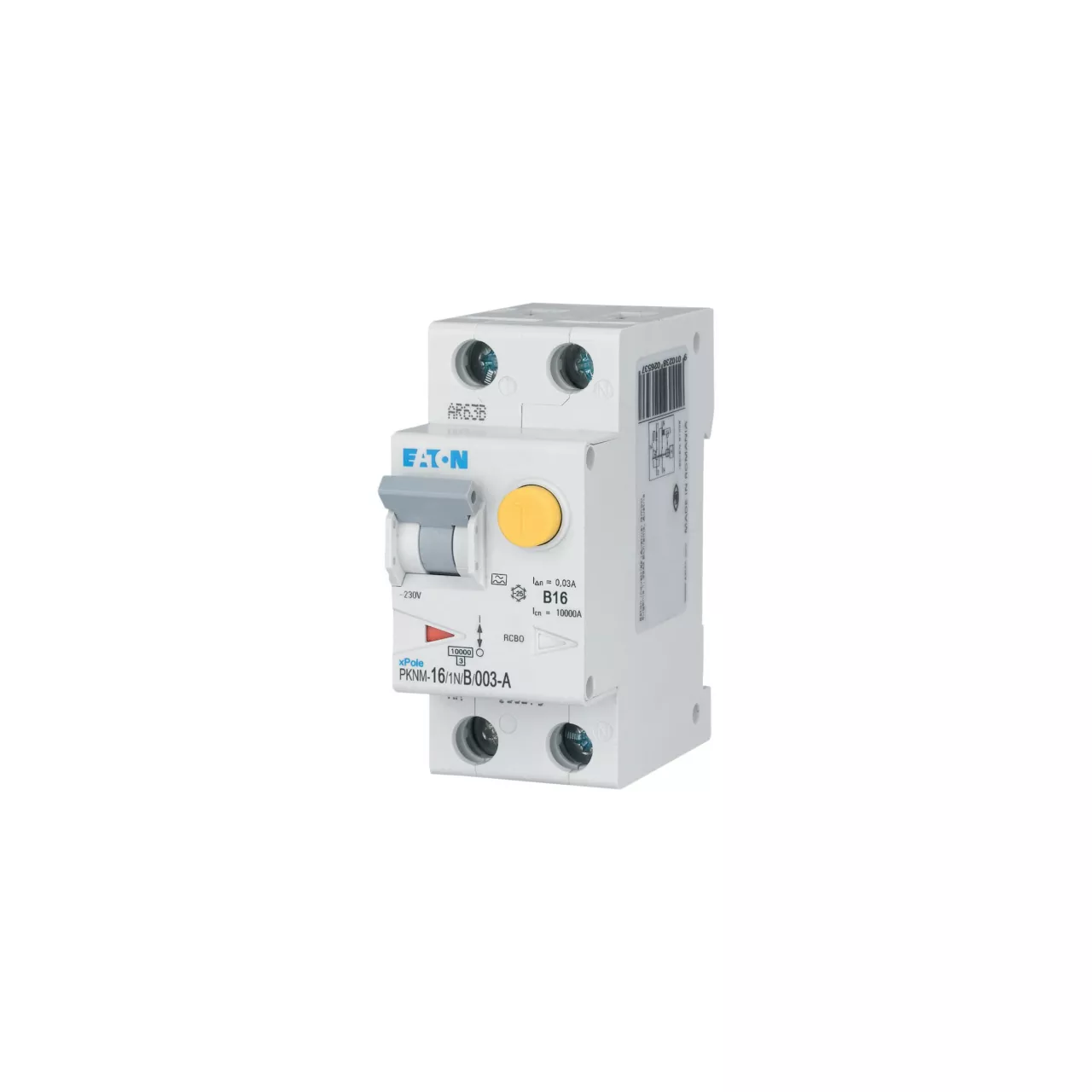 RCBO (wyłącznik różnicowoprądowy z członem nadprądowym) PKNM, 1-biegunowy+N, prąd znamionowy In: 16 A, znamionowy prąd różnicowy IΔN: 0,03 A, znamionowa zdolność łączeniowa zgodnie z normą IEC/EN 61009: 10 kA, Aparatura modułowa do rozdziału energii
