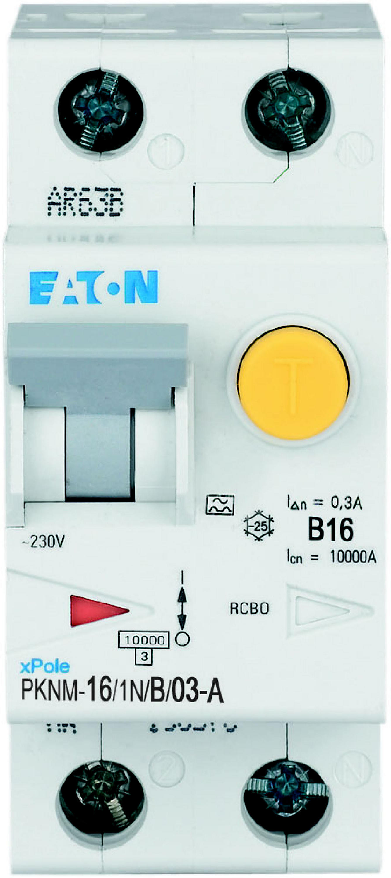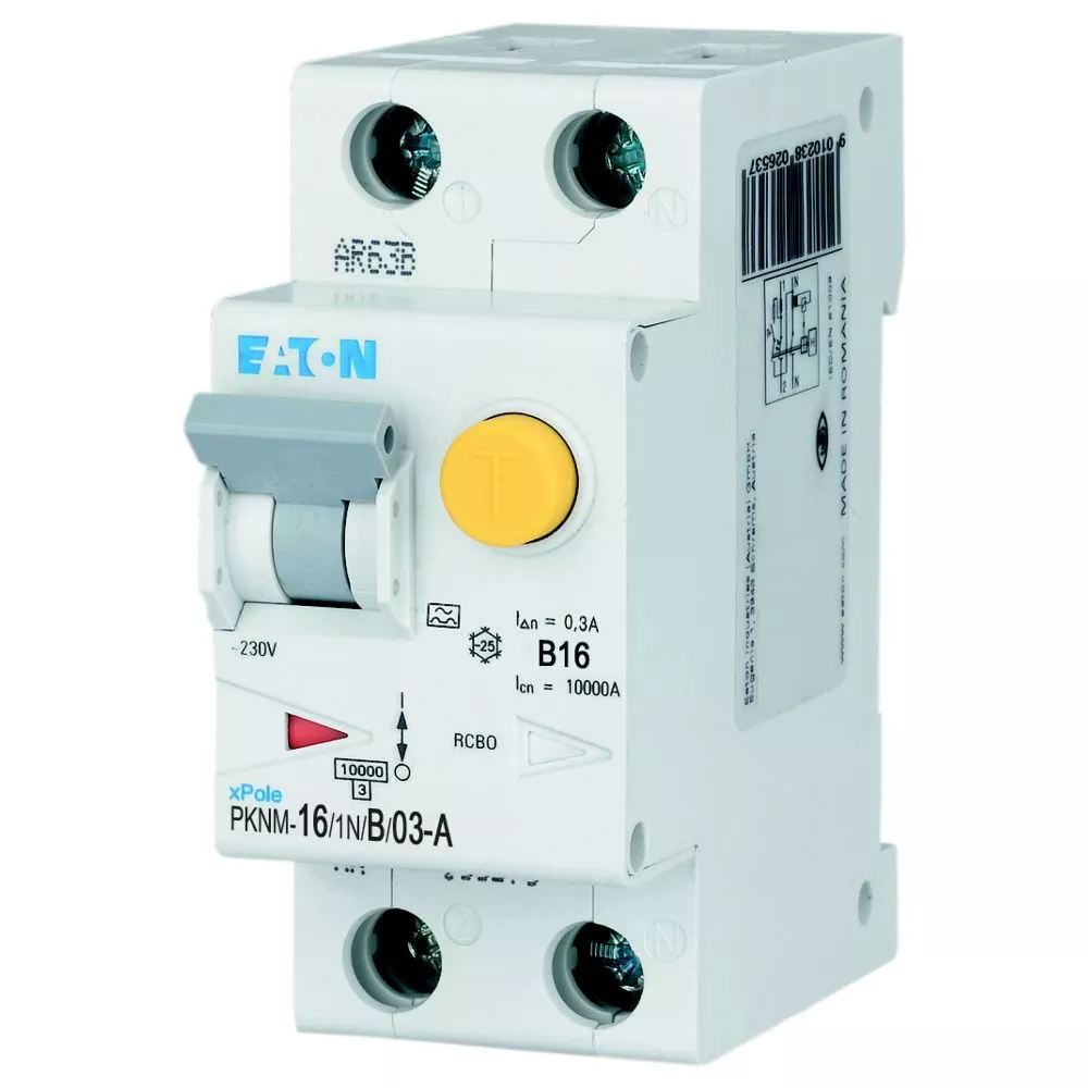 RCBO (wyłącznik różnicowoprądowy z członem nadprądowym) PKNM, 1-biegunowy+N, prąd znamionowy In: 16 A, wartość znamionowa prądu zakłóceniowego IΔN: 0,3 A, znamionowa zdolność łączeniowa zgodnie z normą IEC/EN 61009: 10 kA, aparatura rozdzielcza do budynków mieszkalnych i komercyjnych