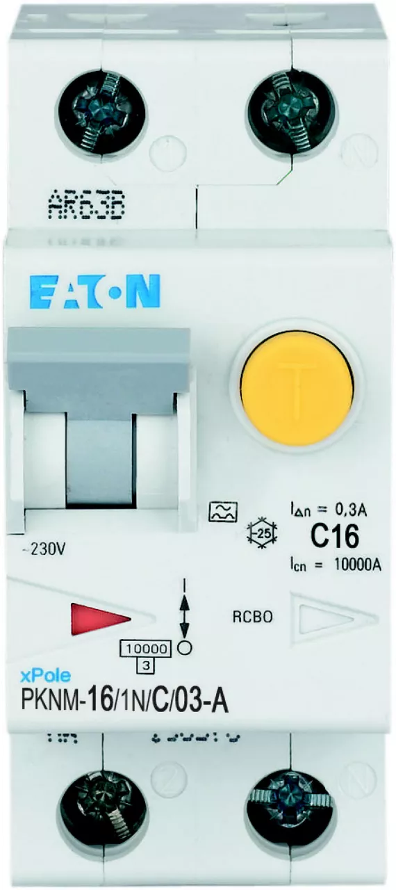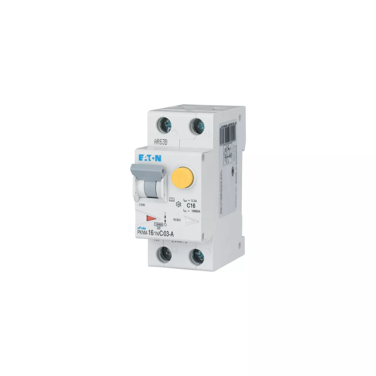 RCBO (wyłącznik różnicowoprądowy z członem nadprądowym) PKNM, 1-biegunowy+N, prąd znamionowy In: 16 A, znamionowy prąd różnicowy IΔN: 0,3 A, znamionowa zdolność łączeniowa zgodnie z normą IEC/EN 61009: 10 kA, aparatura modułowa do rozdziału energii