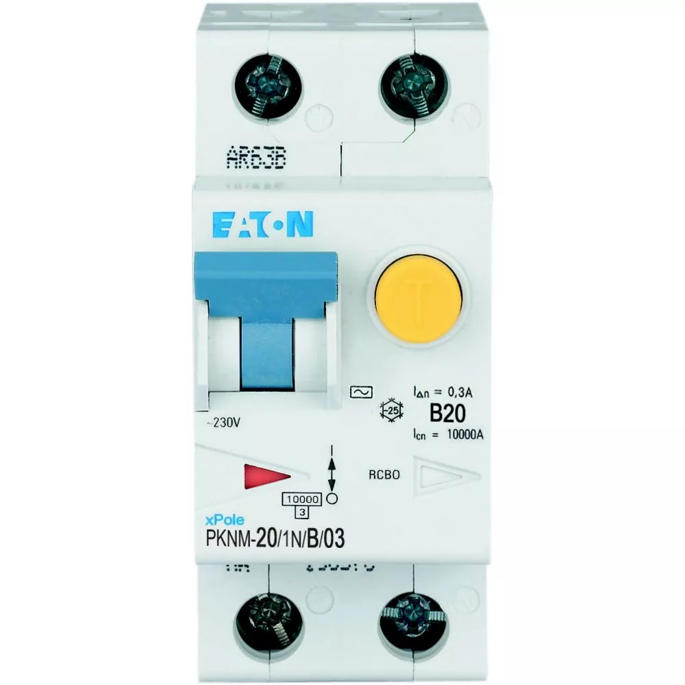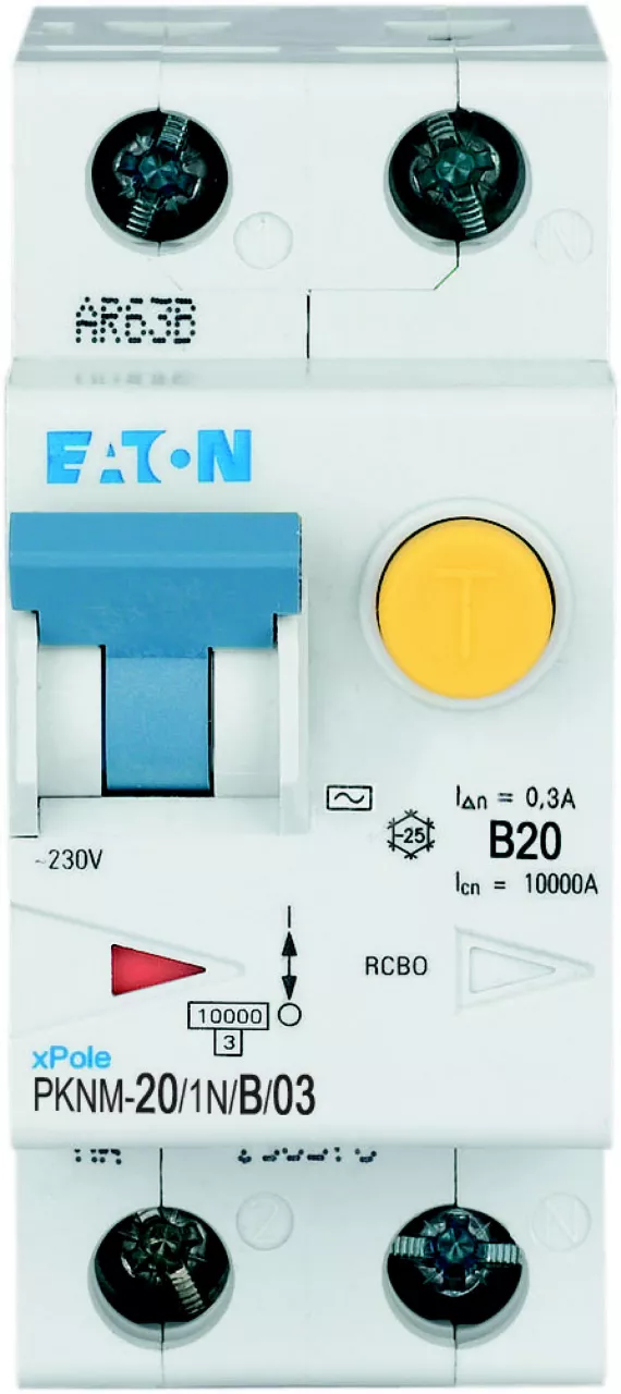 PKNM-20/1N/B/03-MW Wyłącznik kombinowany 10kA, In=20A, IΔN=0,3A, char. B, Typ AC, 1+N bieg. Seria PKNM
