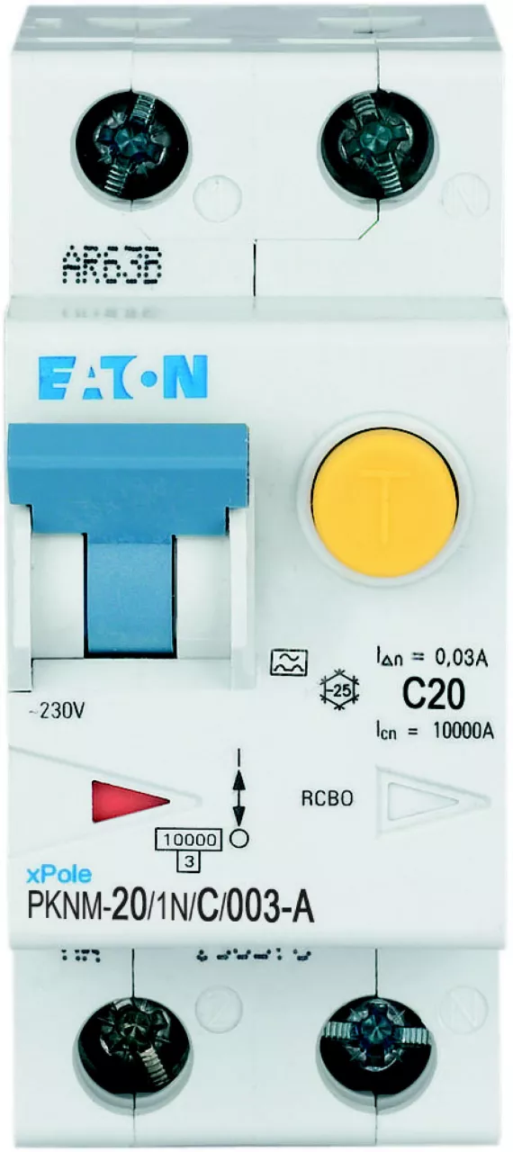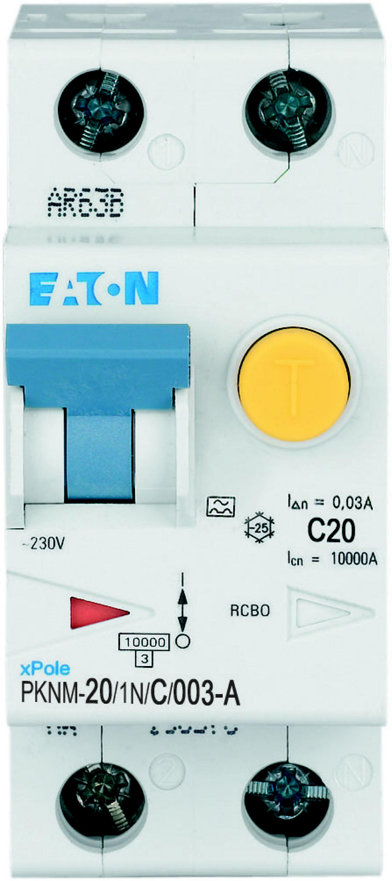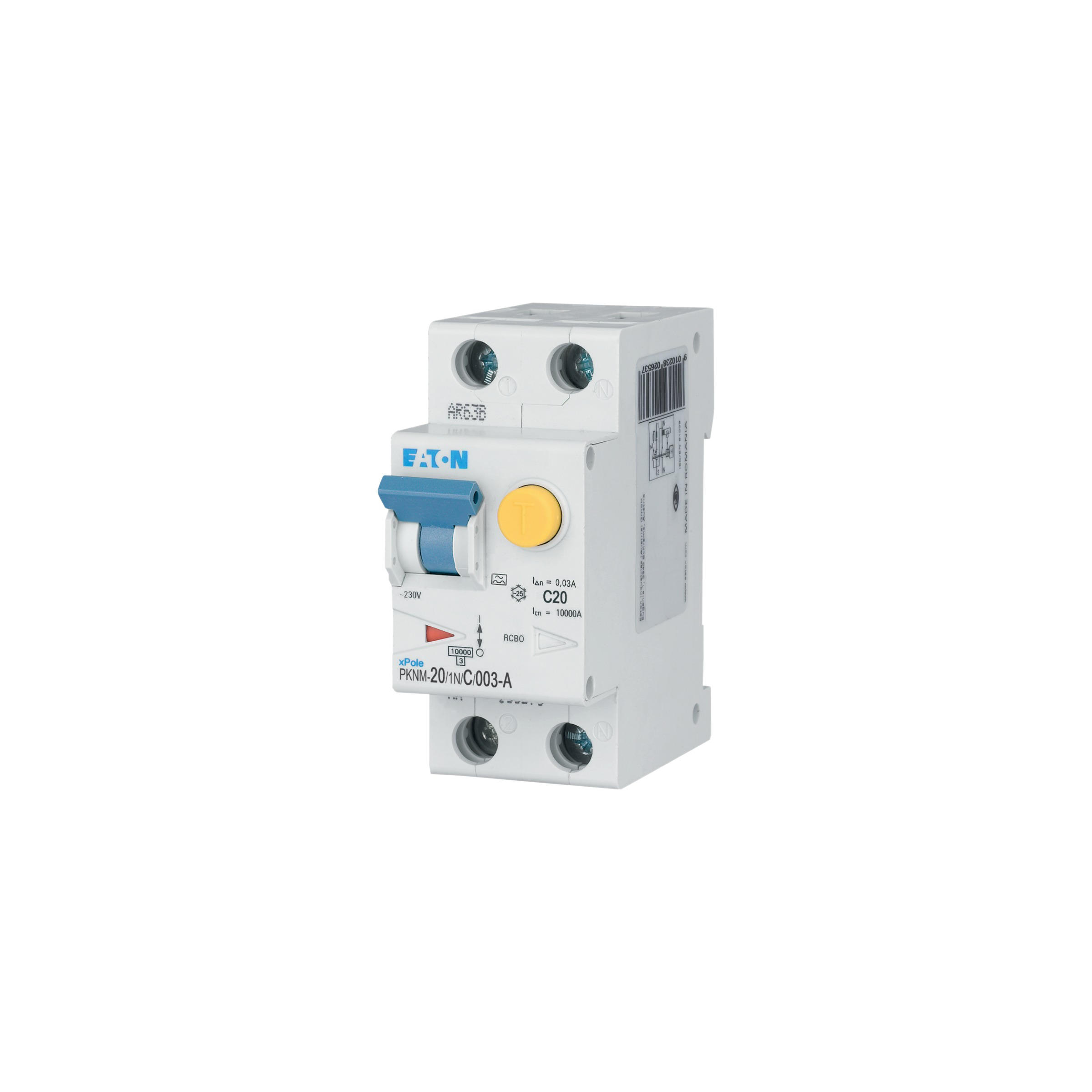 RCBO (výkonový jistič při reziduálním proudu s ochranou proti přetížení) PKNM, 1pólový+N, jmenovitý proud In: 20 A, jmenovitý reziduální proud IΔN: 0,03 A, jmenovitá vypínací schopnost dle ČSN EN 61009: 10 kA, spínač pro domovní a komerční aplikace