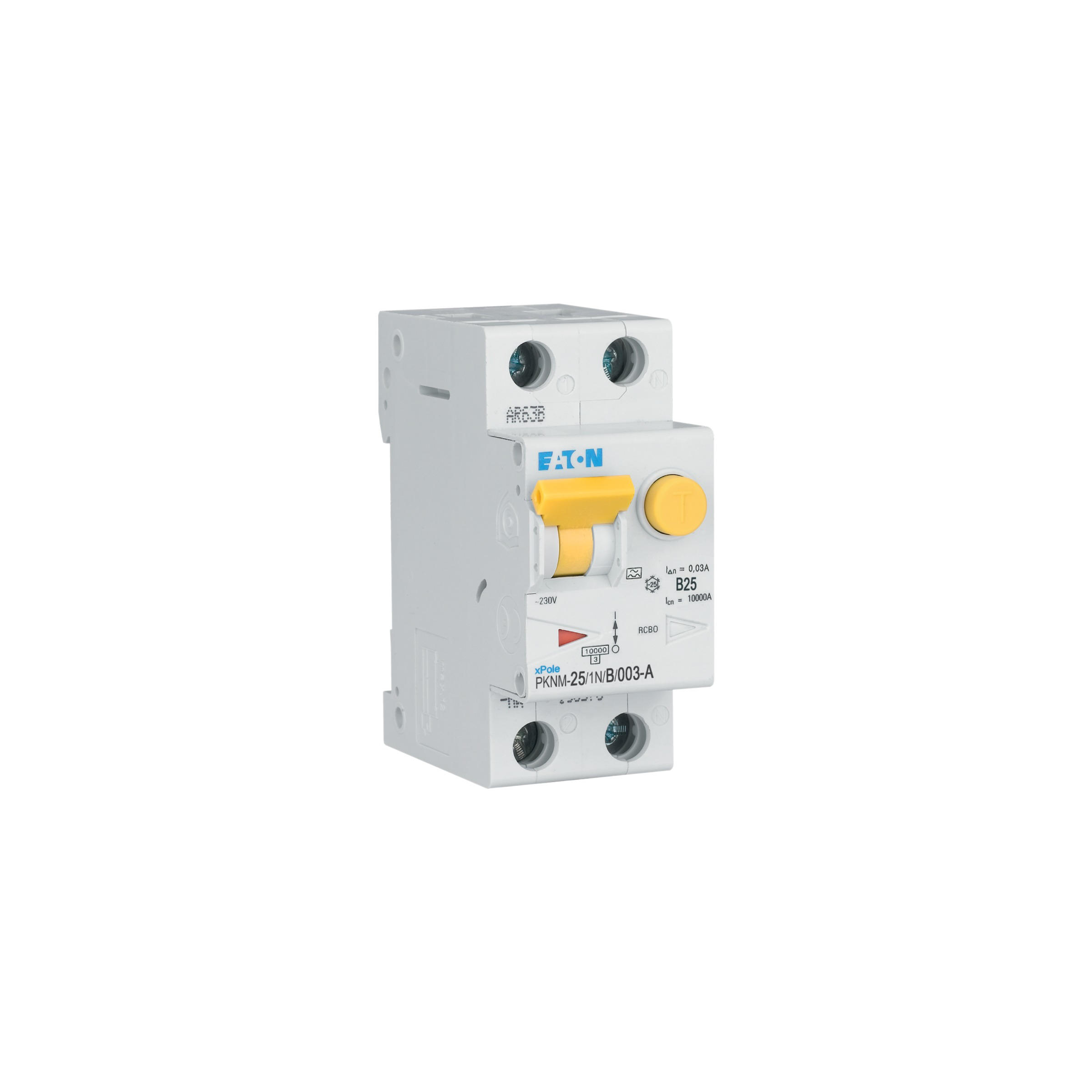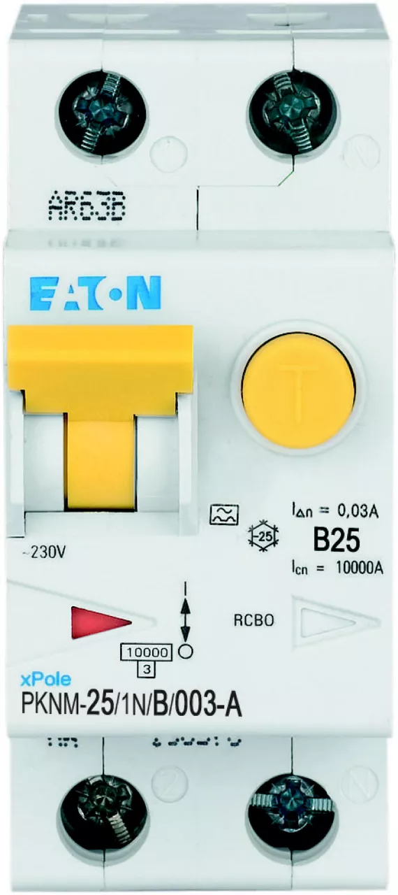 RCBO (wyłącznik różnicowoprądowy z członem nadprądowym) PKNM, 1-biegunowy+N, prąd znamionowy In: 25 A, znamionowy prąd różnicowy IΔN: 0,03 A, znamionowa zdolność łączeniowa zgodnie z normą IEC/EN 61009: 10 kA, Aparatura modułowa do rozdziału energii