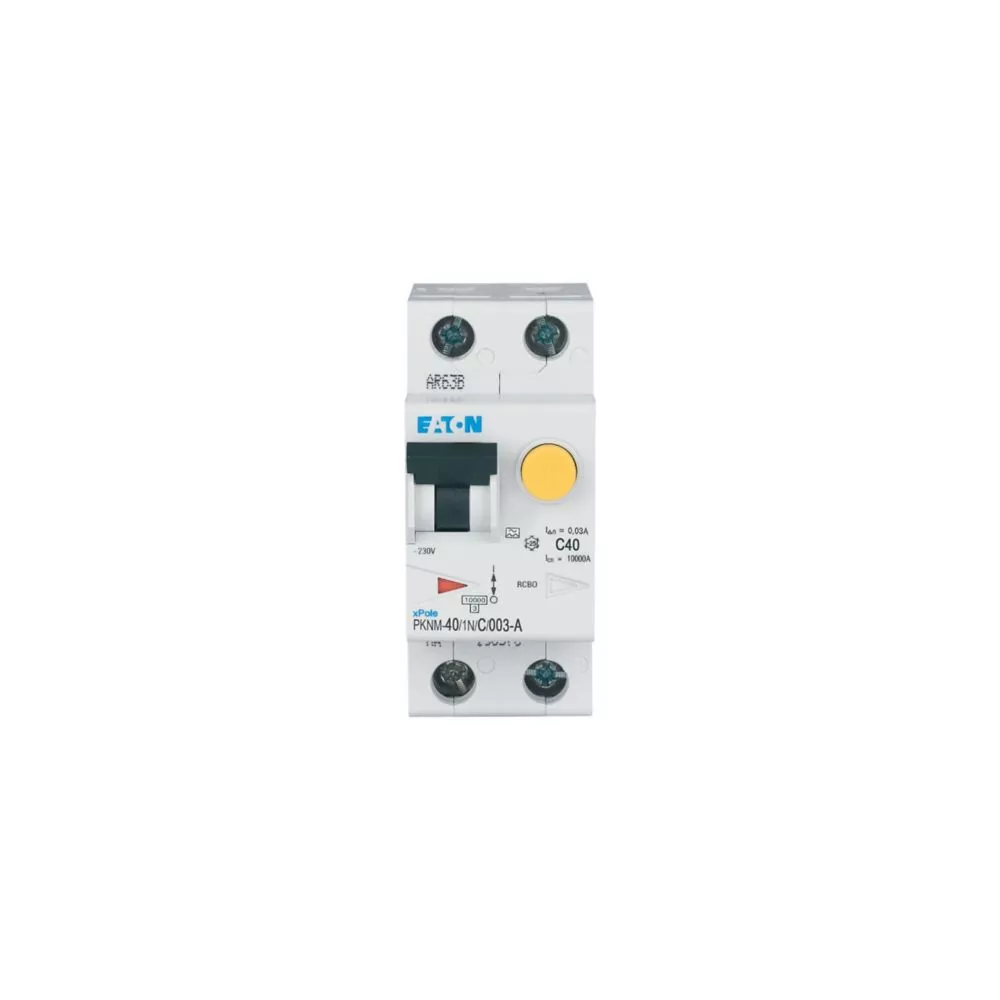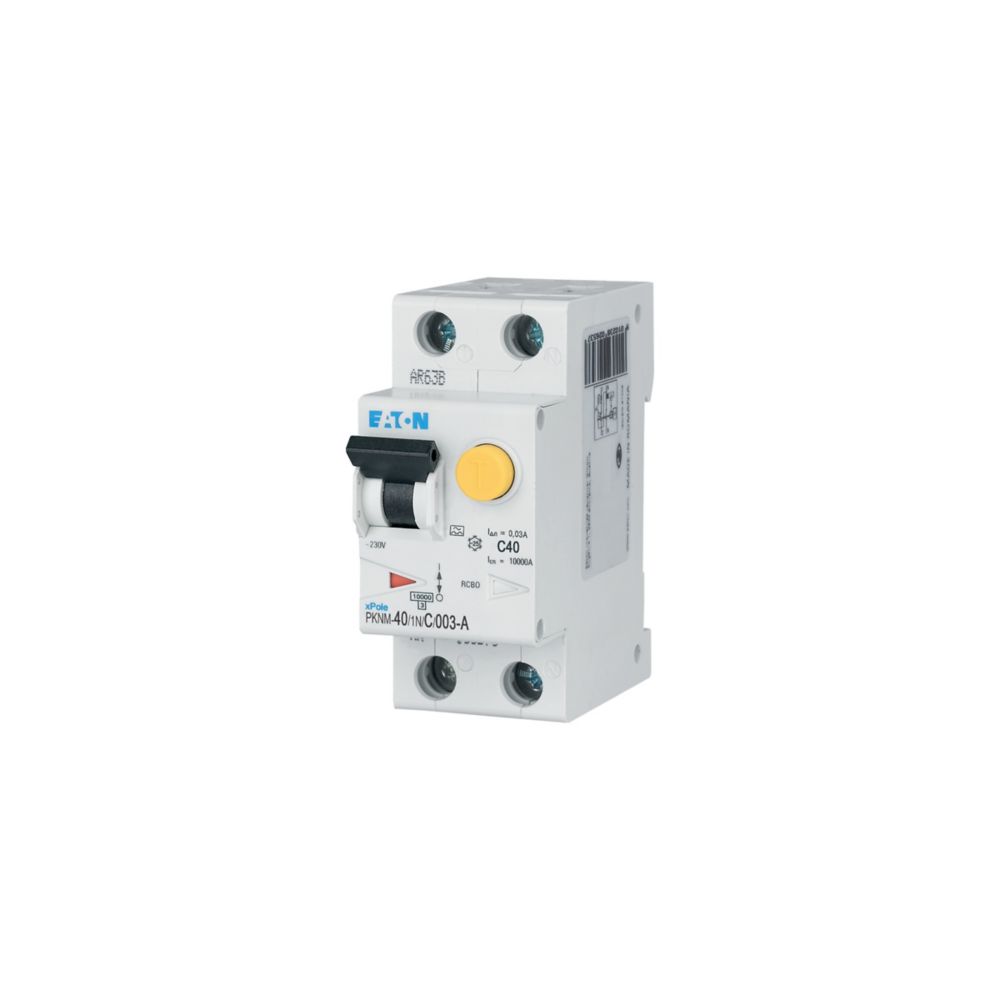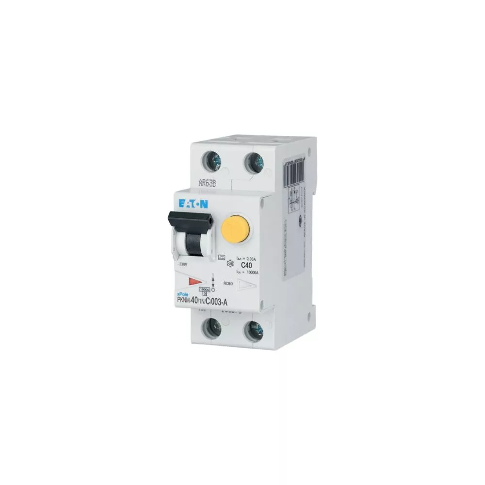 RCBO (wyłącznik różnicowoprądowy z członem nadprądowym) PKNM, 1-biegunowy+N, prąd znamionowy In: 40 A, wartość znamionowa prądu zakłóceniowego IΔN: 0,03 A, znamionowa zdolność łączeniowa zgodnie z normą IEC/EN 61009: 10 kA, Aparatura rozdzielcza do budynków mieszkalnych i funkcjonalnych