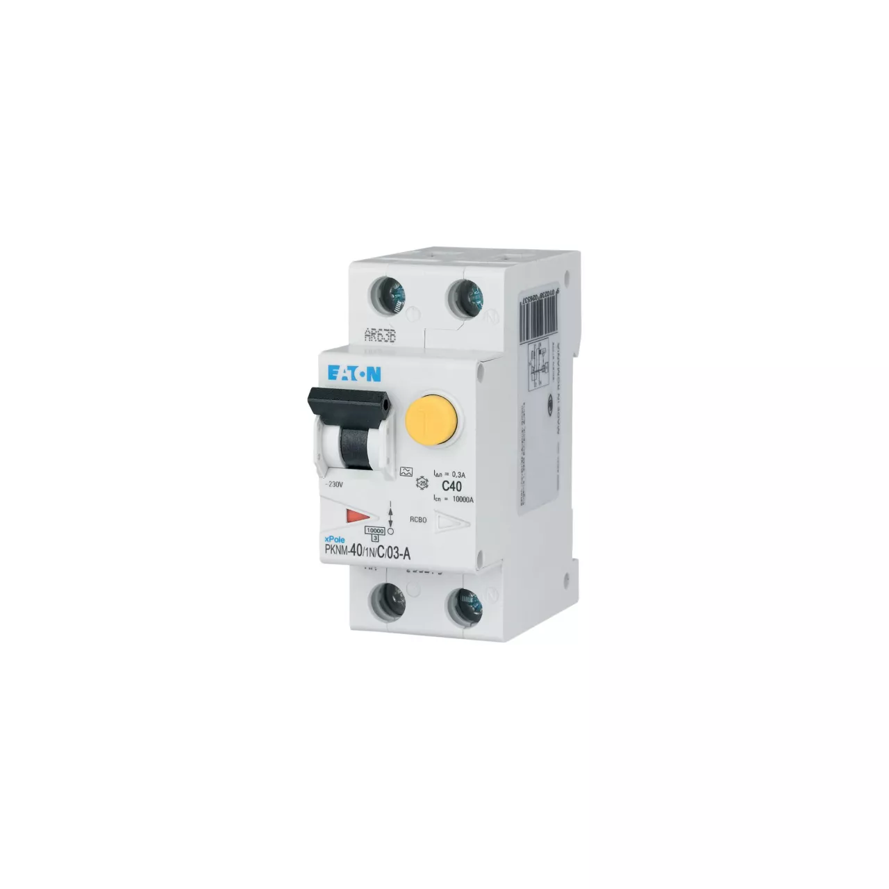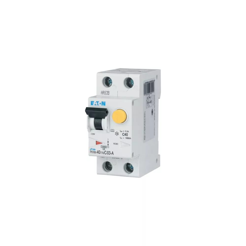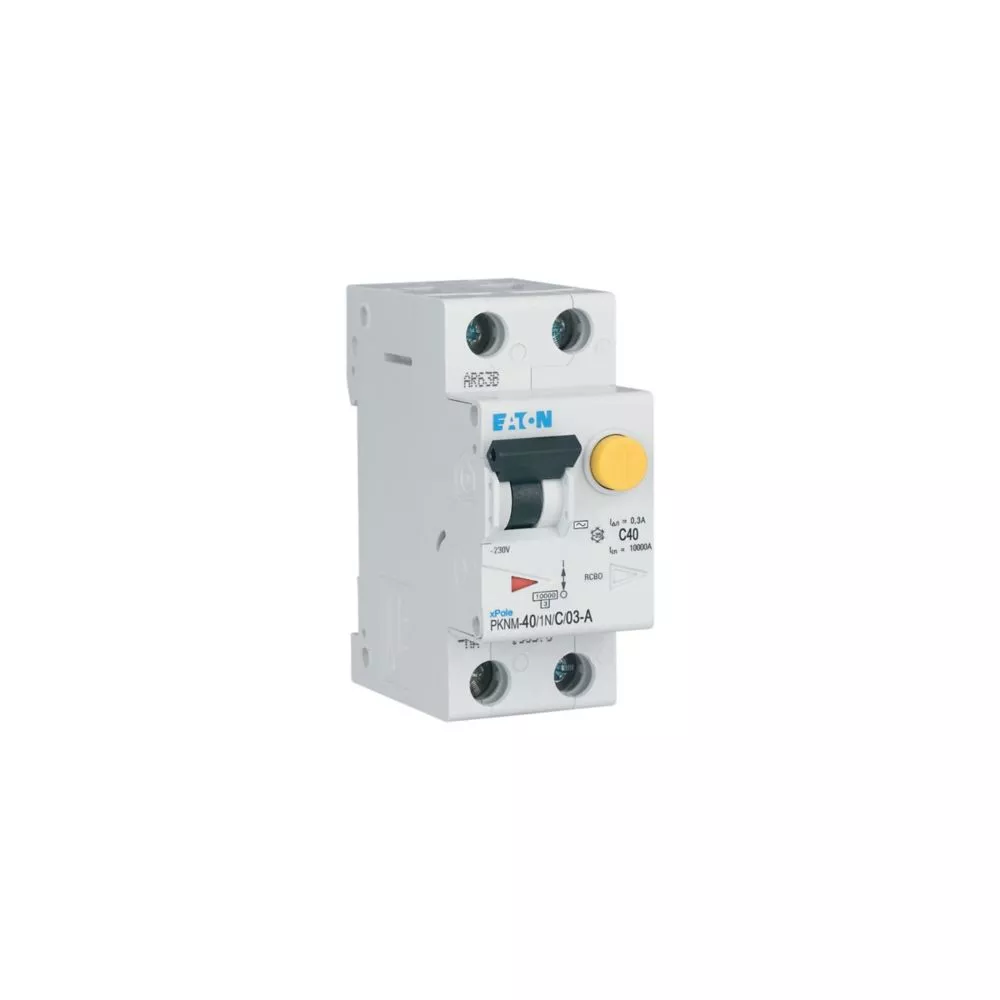 RCBO (wyłącznik różnicowoprądowy z członem nadprądowym) PKNM, 1-biegunowy+N, prąd znamionowy In: 40 A, znamionowy prąd różnicowy IΔN: 0,3 A, znamionowa zdolność łączeniowa zgodnie z normą IEC/EN 61009: 10 kA, aparatura modułowa do rozdziału energii