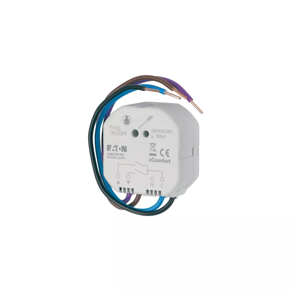 Wichtig!: Das ist ein Jalousieaktor der ersten Generation und wir empfehlen Ihnen, stattdessen einen schlanken Jalousieaktor (CJAU-01/04) zu verwenden, der einen niedrigen Bereitschaftsstrom benötigt und der auch mit lokalen Eingängen (CJAUE-01/04-I) und einem Stecker (CJAE-01/01) verfügbar ist. Der Jalousieaktor empfängt und steuert Rollläden und Jalousieantriebe mit 230V-Motoren mit integrierten Endlagenschalter. In diesem Jalousieaktor sind 2 Sicherheitsfunktionen möglich (z. B. Sicherheitsposition während Wind und/oder Regen. Aussperrschutz – wenn die Terassentür offen ist, darf diese Rollade/Jalousie nicht schließen). Hinweis: mehrere Beschattungsmotoren dürfen nicht gleichzeitig auf einem Jalousieaktor angeschaltet werden, ohne ein