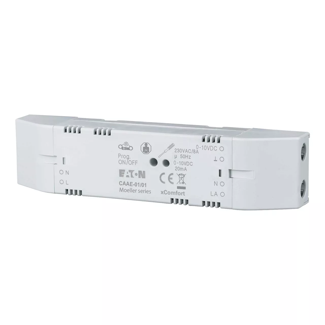 De analoge actor ontvangt, schakelt een relais in en levert de uitgangsspanning 0-10 VDC voor eindapparaten zoals een frequentieregelaar, dimmer, enz. De voeding wordt via het net verzorgd. Het apparaat wordt gemonteerd in een wandinbouwdoos, boven het verlaagd plafond of rechtstreeks in het apparaat dat moet worden bediend.