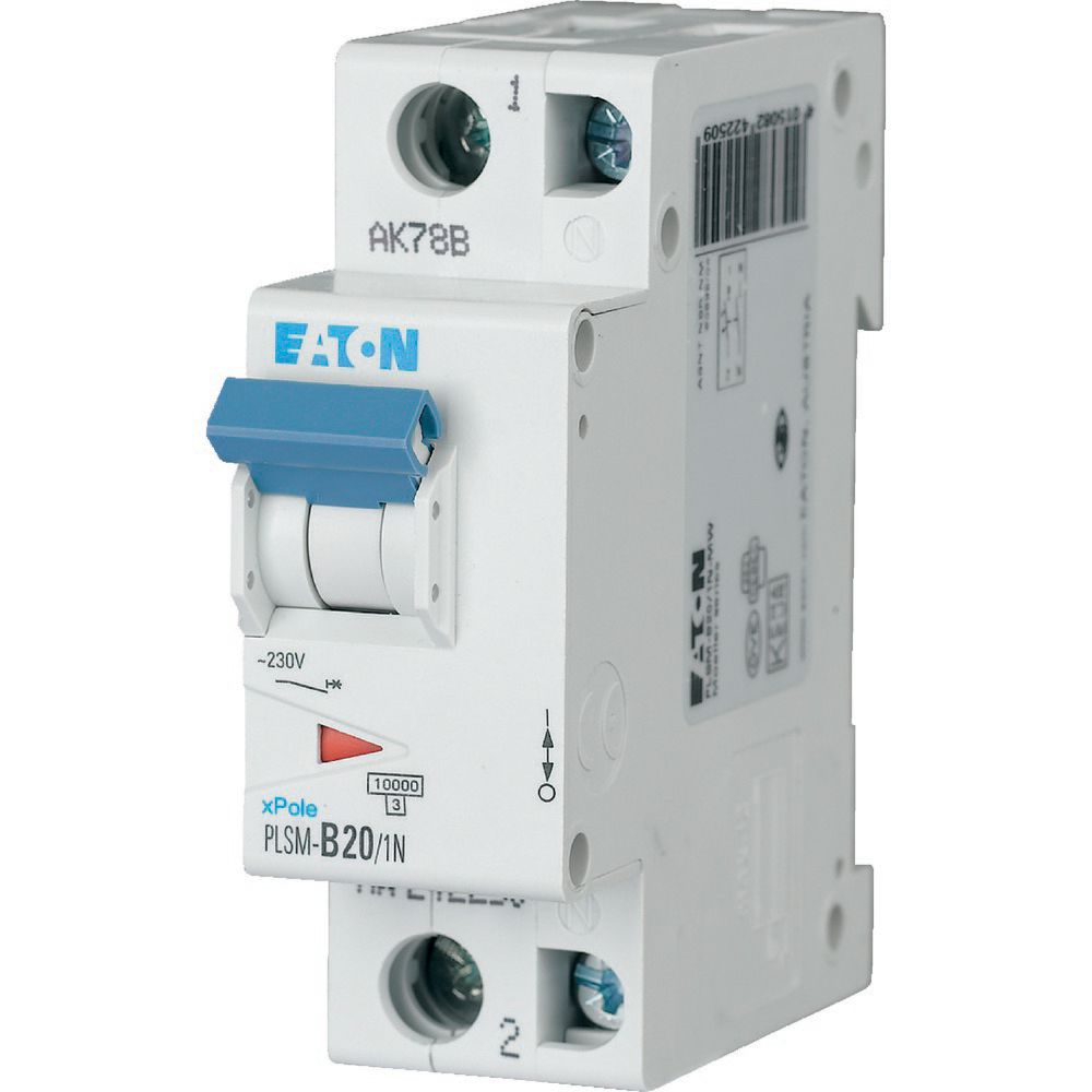 Installatieautomaat (MCB), PLSM, 1-polig + N, afschakelkarakteristiek: B, nominale stroom In: 20 A, nominaal schakelvermogen volgens IEC/EN 60898-1: 10 kA, Schakelapparatuur voor woningen en bedrijfstoepassingen
