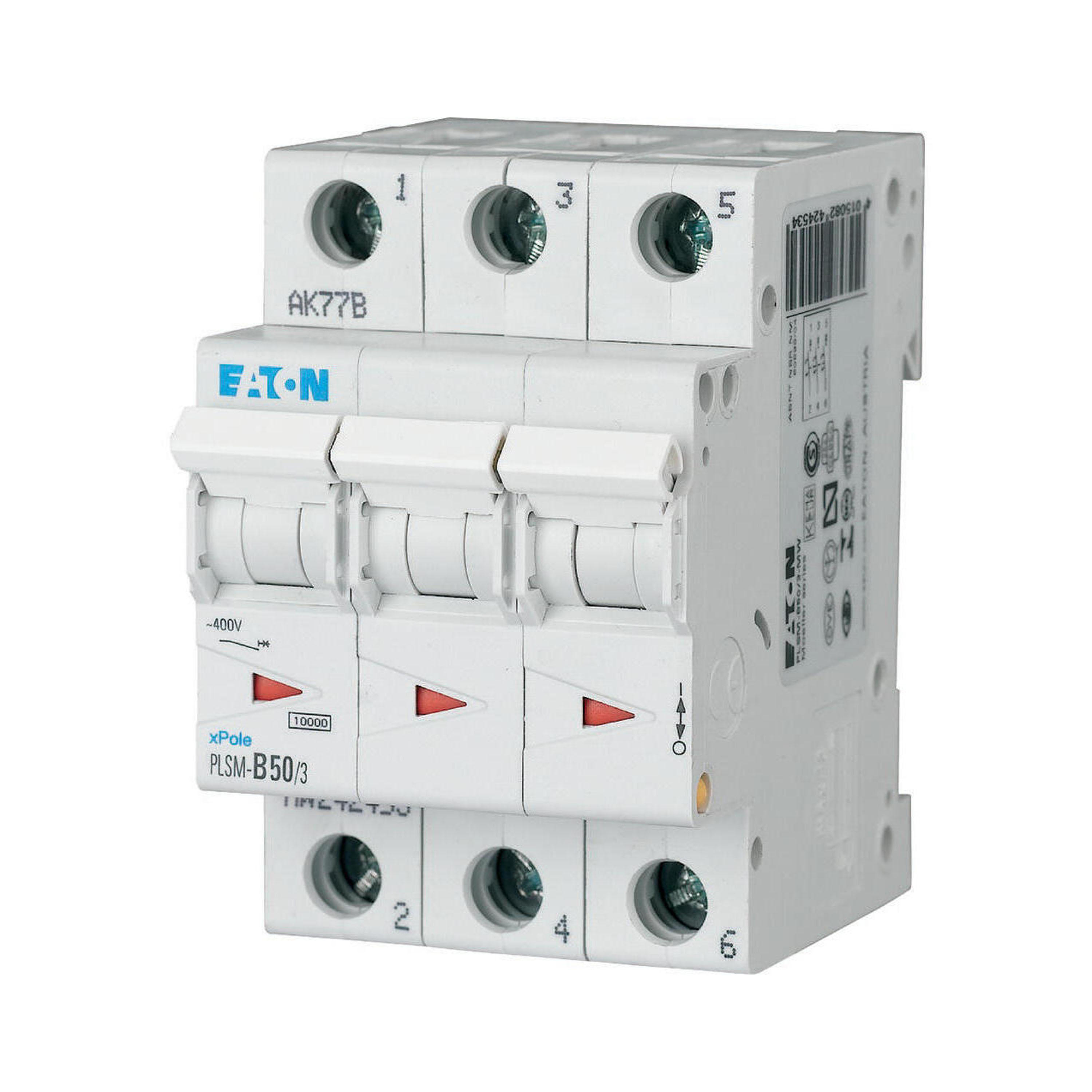 Installatieautomaat (MCB), PLSM, 3-polig, afschakelkarakteristiek: B, nominale stroom In: 50 A, nominaal schakelvermogen volgens IEC/EN 60898-1: 10 kA, Componenten voor residentiële en bedrijfstoepassingen