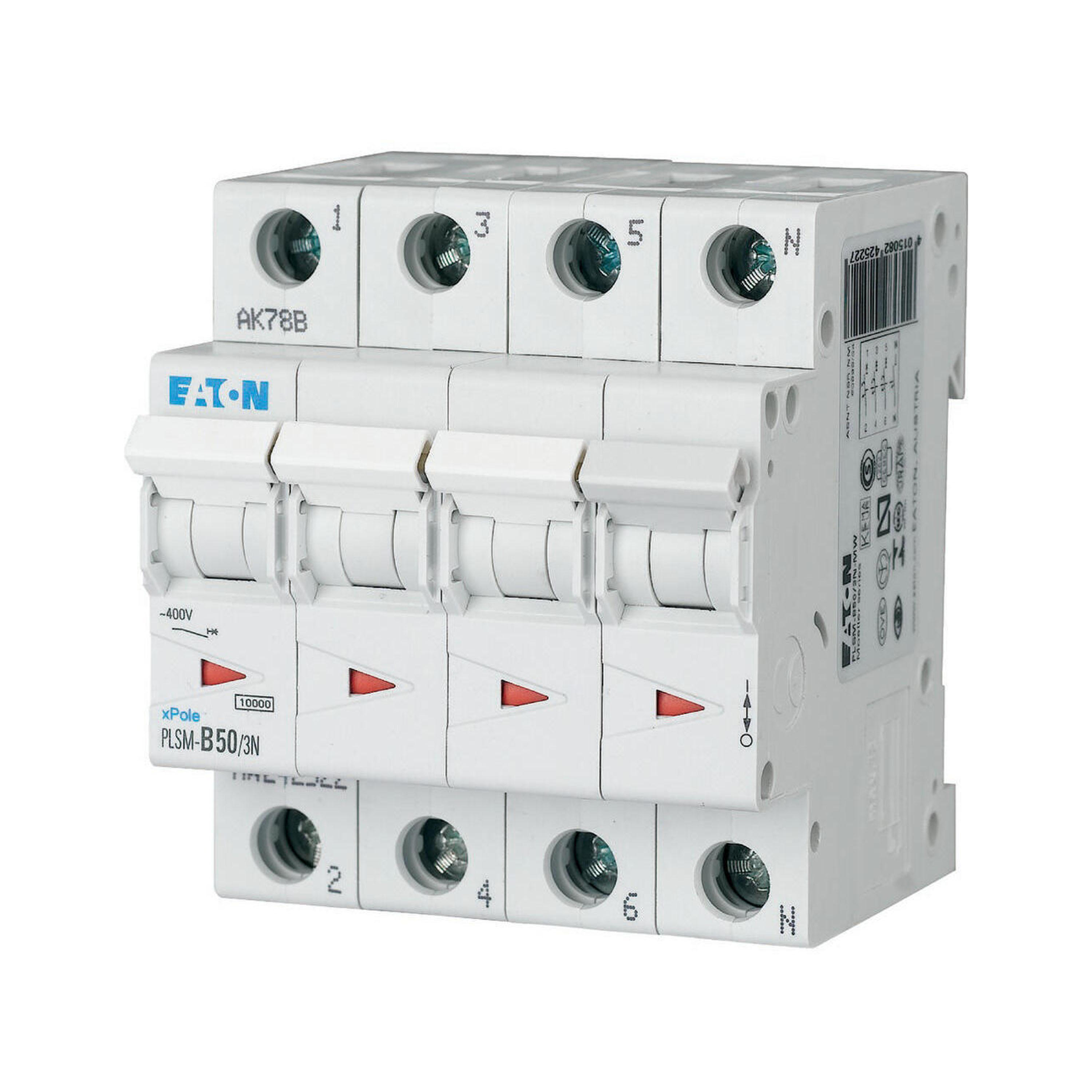Installatieautomaat (MCB), PLSM, 3-polig+N, afschakelkarakteristiek: B, nominale stroom In: 50 A, nominaal schakelvermogen volgens IEC/EN 60898-1: 10 kA, Componenten voor residentiële en bedrijfstoepassingen