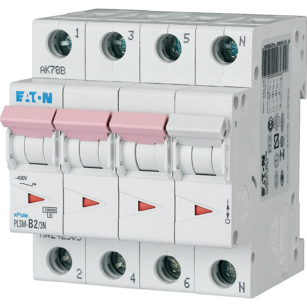 Installatieautomaat (MCB), PLSM, 3-polig+N, afschakelkarakteristiek: C, nominale stroom In: 2 A, nominaal schakelvermogen volgens IEC/EN 60898-1: 10 kA, Schakelapparatuur voor woningen en bedrijfstoepassingen