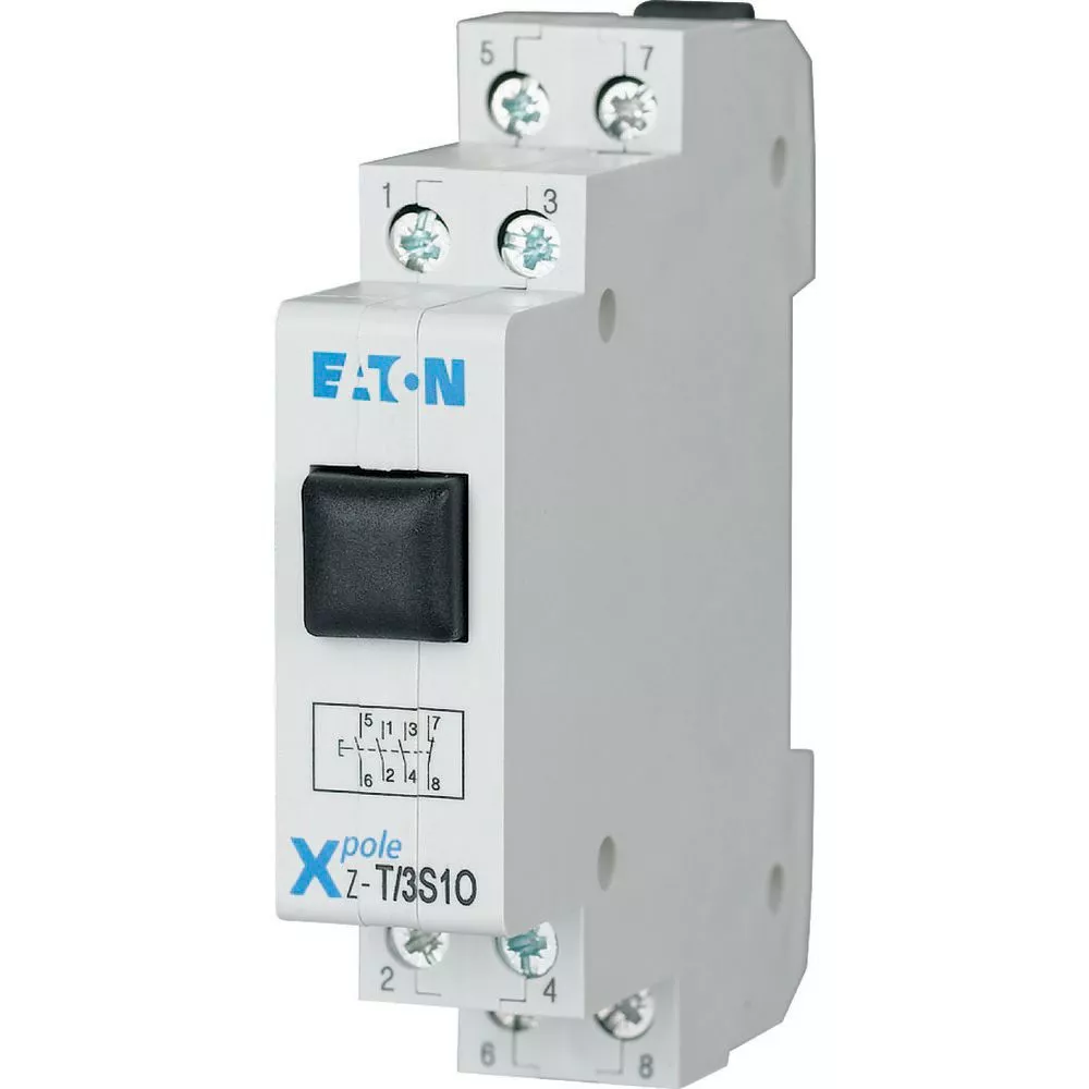 Pulsdrukker, functie: 3 no + 1 nc, nominale bedrijfsstroom 16 A, nominale spanning 400 VAC, kortsluitafschakelvermogen 10 kA, kleur van pulsdrukker: zwart, standaardafmeting voorkant 45 mm, montagebreedte 1 MU (17,5 mm), DIN-rail montage, klemdoorsnede 1-10 mm², type volgens IEC 60669, VDE 0632