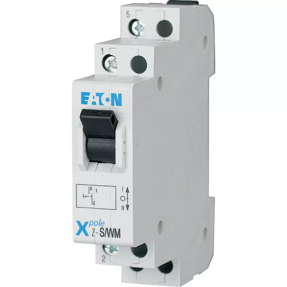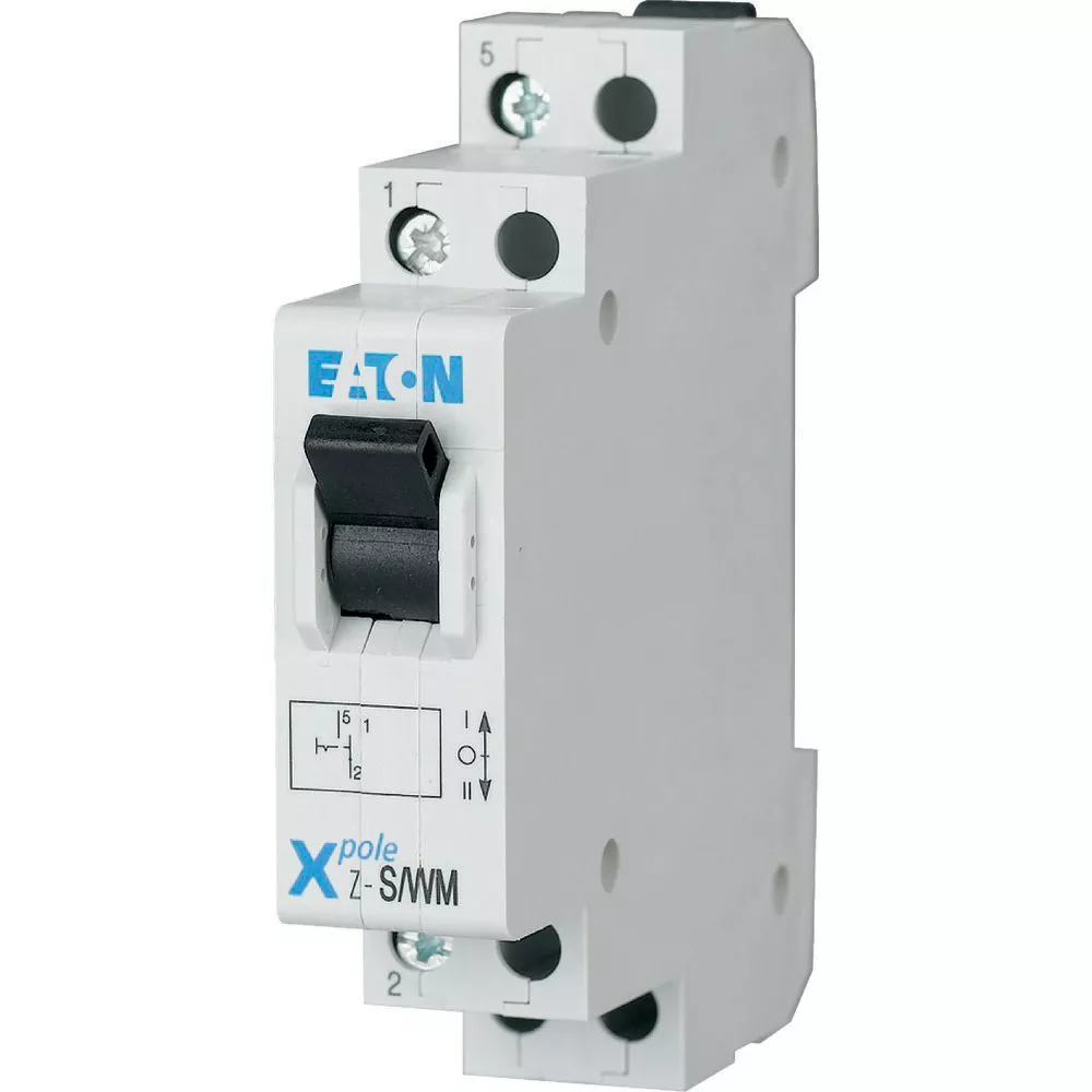 Omschakelaar, functie: 1 W, I-O-II, nominale bedrijfsstroom 16 A, nominale spanning 230/400 V AC, kortsluitafschakelvermogen 10 kA, standaardafmeting voorkant 45 mm, montagebreedte 1 MU (17,5 mm), DIN-rail montage, klemdoorsnede 1-10 mm², type volgens IEC 60669, VDE 0632