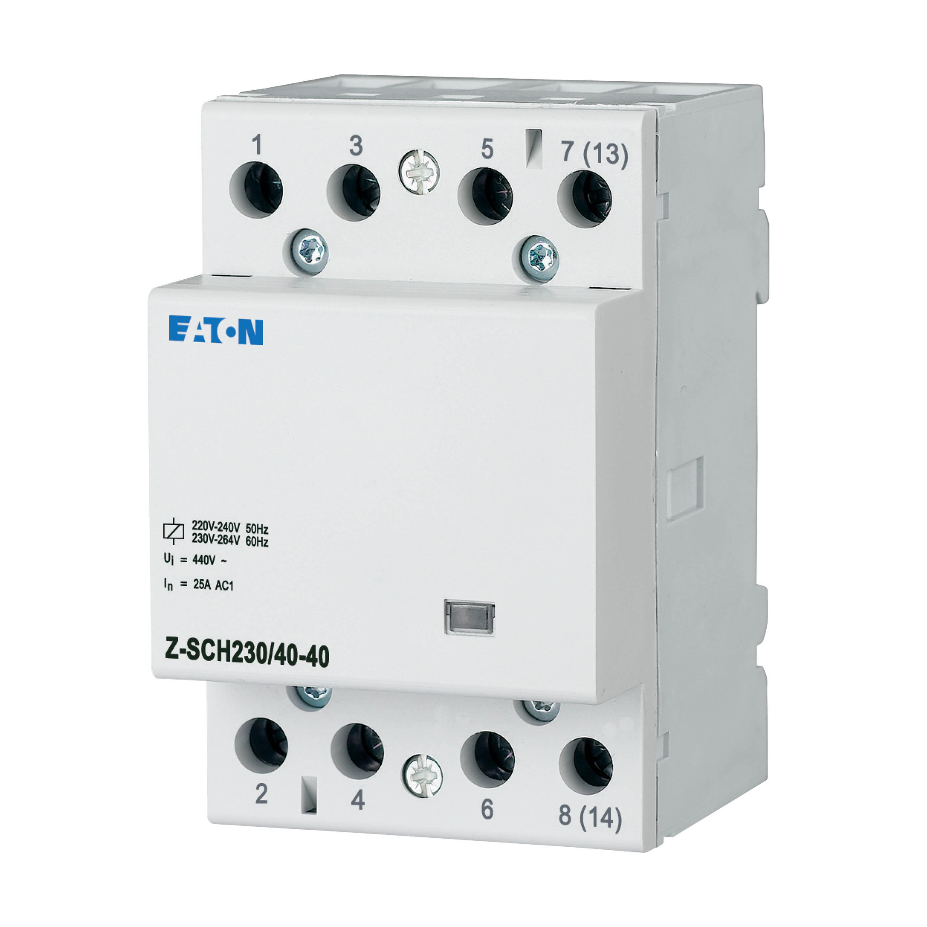 Installatie magneetschakelaar, nominale spanning stuurcircuit 230 V AC, nominale bedrijfsstroom bij AC1 40 A, functie: 4 no, details volgens IEC 61095, EN 61095, VDE 0660, IEC 60947-4-1_x, EN 60947-4-1, VDE, standaardafmeting voorkant 45 mm, montagebreedte 3 MU (52,5 mm), DIN-rail montage