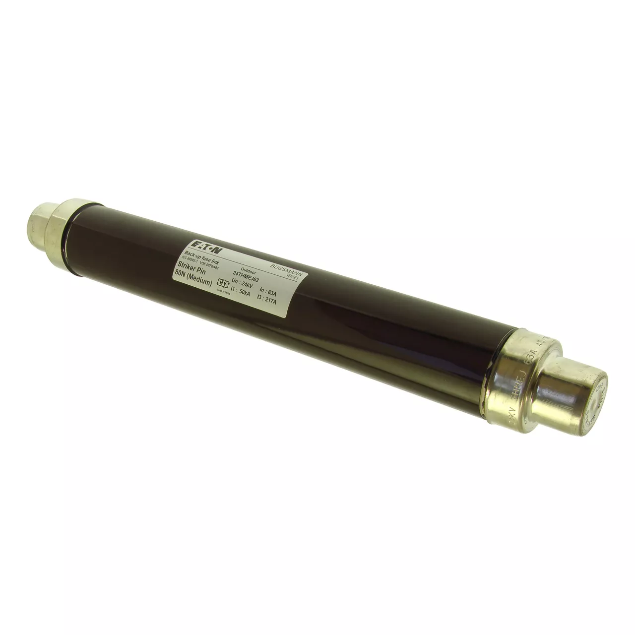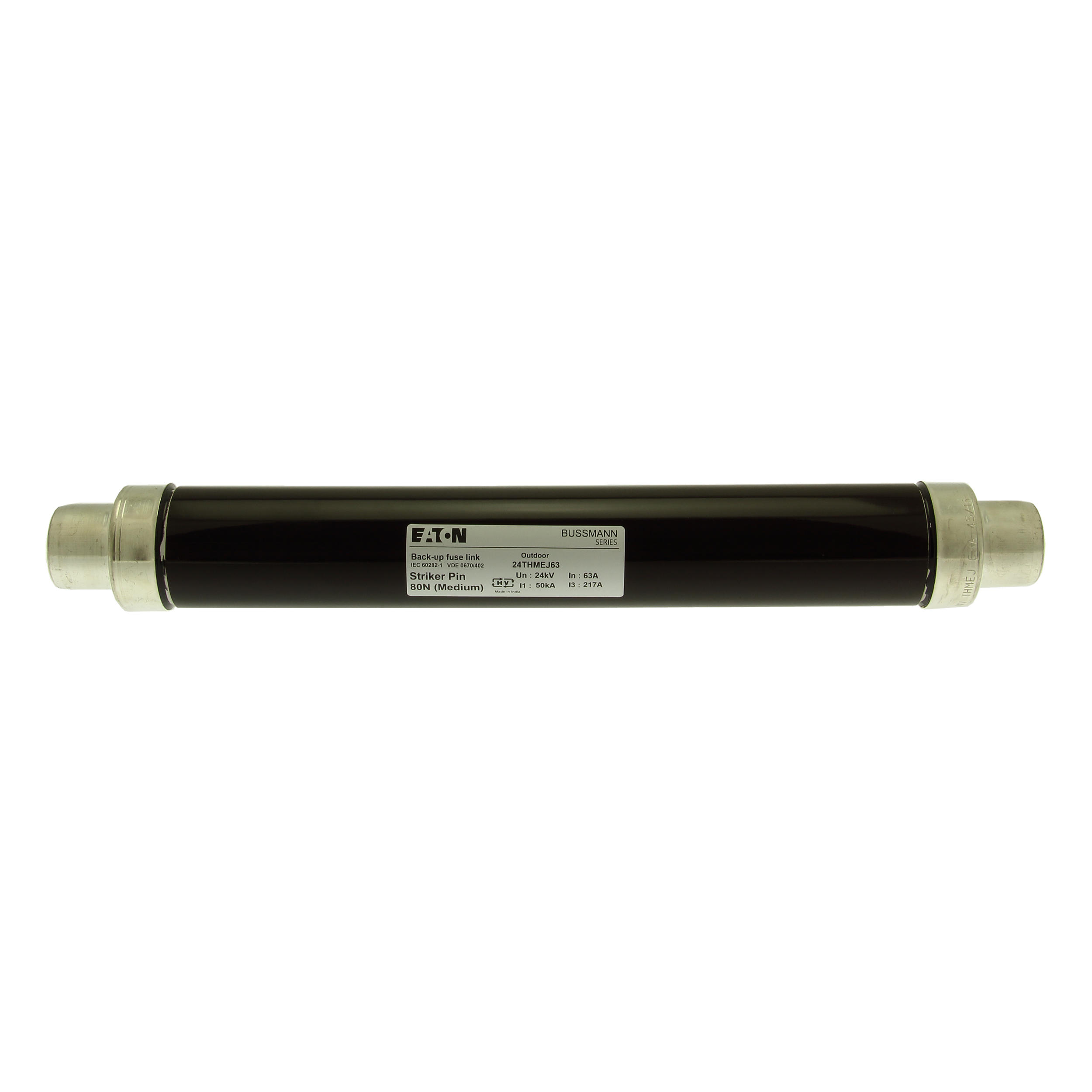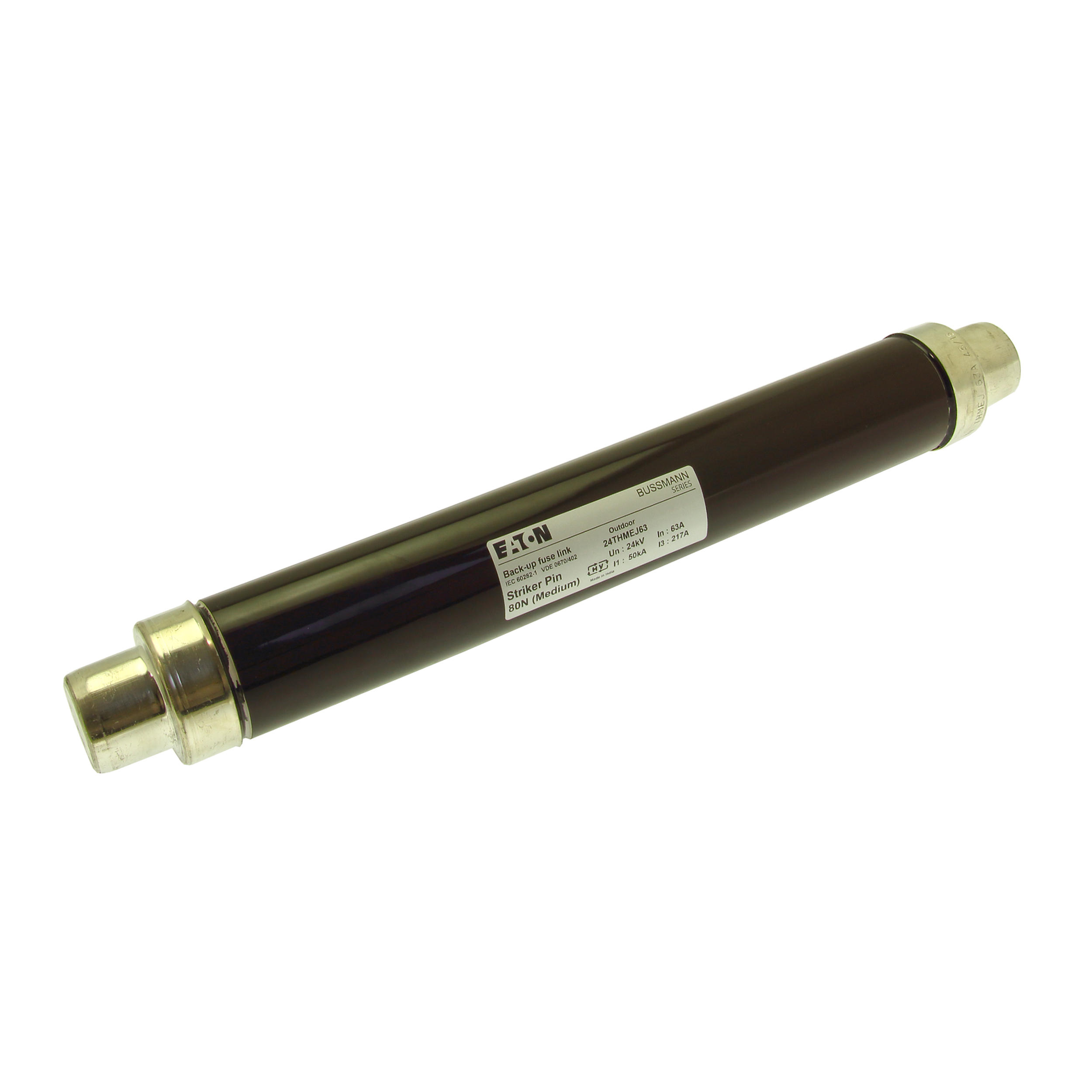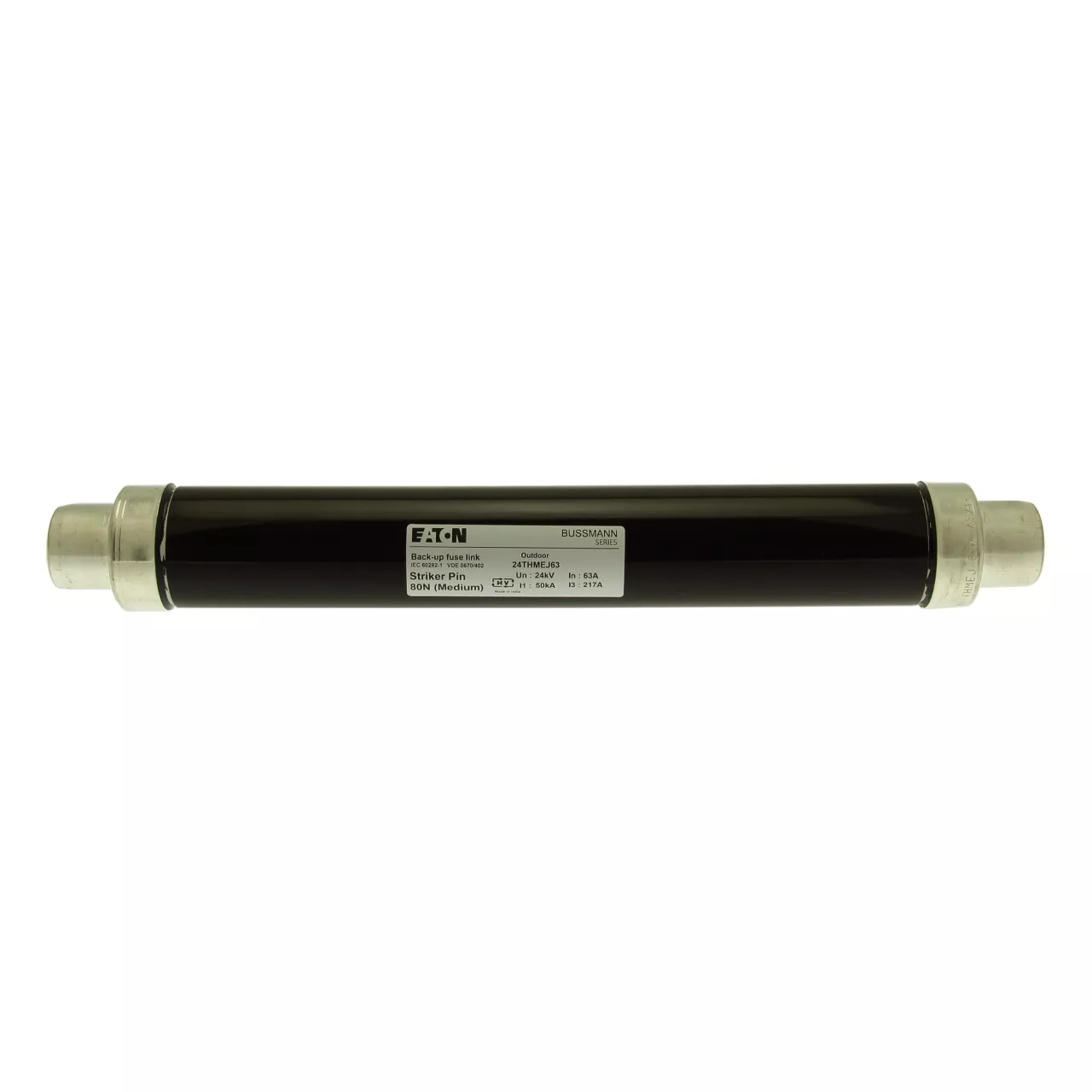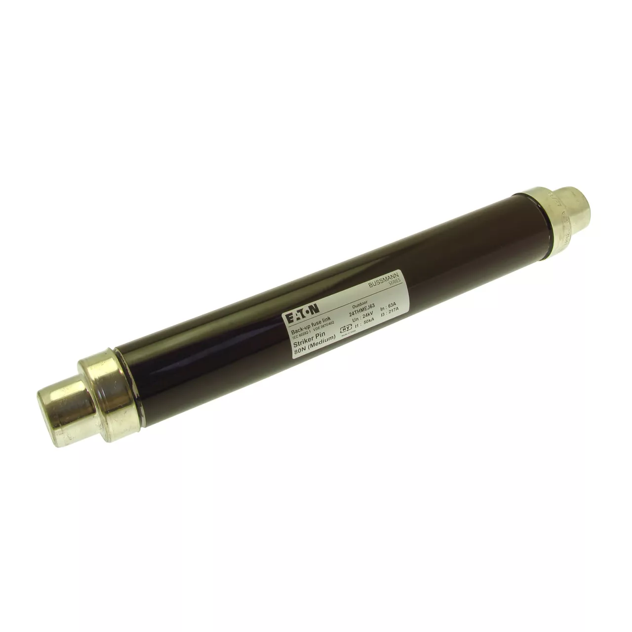 Sicherung, Sicherungseinsatz, Mittelspannung, 63 A, AC 24 kV, 2,5 Zoll, 64 x 442 mm, Pufferung, DIN, mit Schlagmelder, Transformatorschutz, Einsatz im Innen- oder Außenbereich, DIN 43625, VDE 0670 Teil 4, VDE 0670 Teil 402, IEC 60282-1, Ausschaltvermögen 50 kA