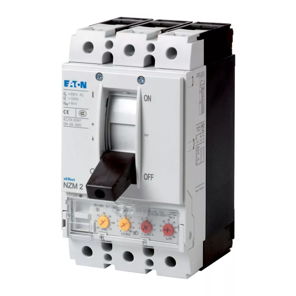 Vermogensautomaat NZM2, 3-polig, Schakelvermogen 400/415 V 50 Hz( Icu ): 150 kA, Nominale bedrijfsstroom = nominale ononderbroken stroom Nominale bedrijfsstroom = nominale ononderbroken stroom (ln = lu): 160 A, Installatietype: Vast, Schroefaansluiting, Standaard/goedkeuring: IEC, Beschermingsfunctie: Systemen, kabel, selectiviteit en generatorbeveiliging