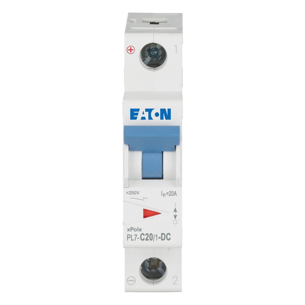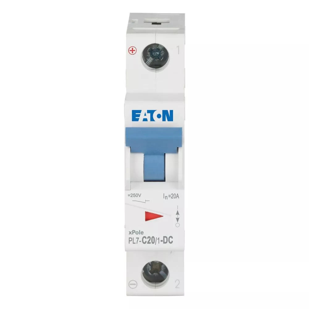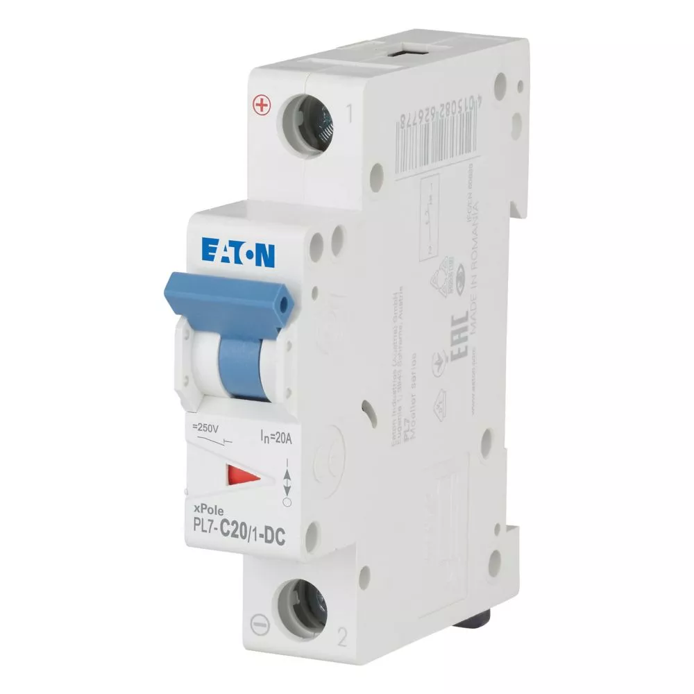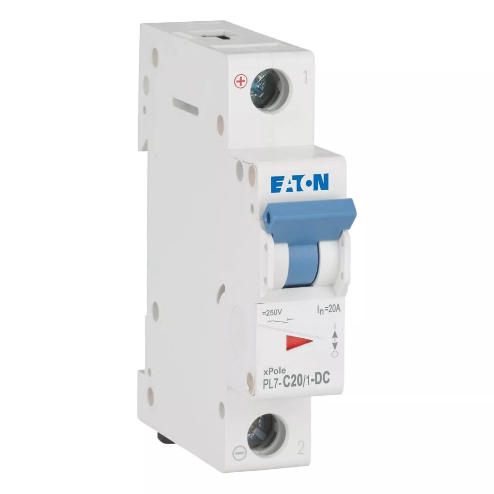 Leitungsschutzschalter (MCB), PL7, 1-polig, Auslösecharakteristik: C, Bemessungsstrom Ein: 20 A, Bemessungsschaltvermögen nach IEC/EN 60947-2: 10 kA, Schaltgeräte für DC-Anwendungen