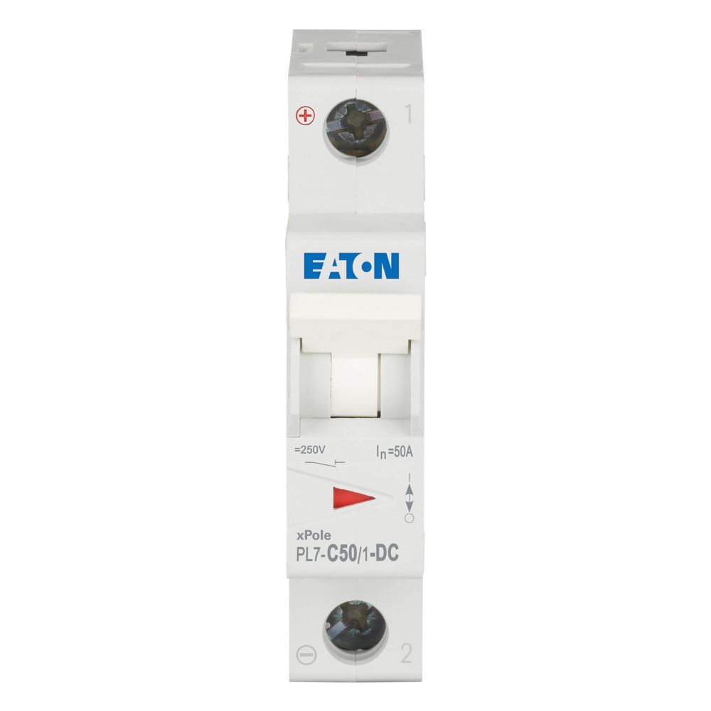 Leitungsschutzschalter (MCB), PL7, 1-polig, Auslösecharakteristik: C, Bemessungsstrom Ein: 50 A, Bemessungsschaltvermögen nach IEC/EN 60947-2: 10 kA, Schaltgeräte für DC-Anwendungen