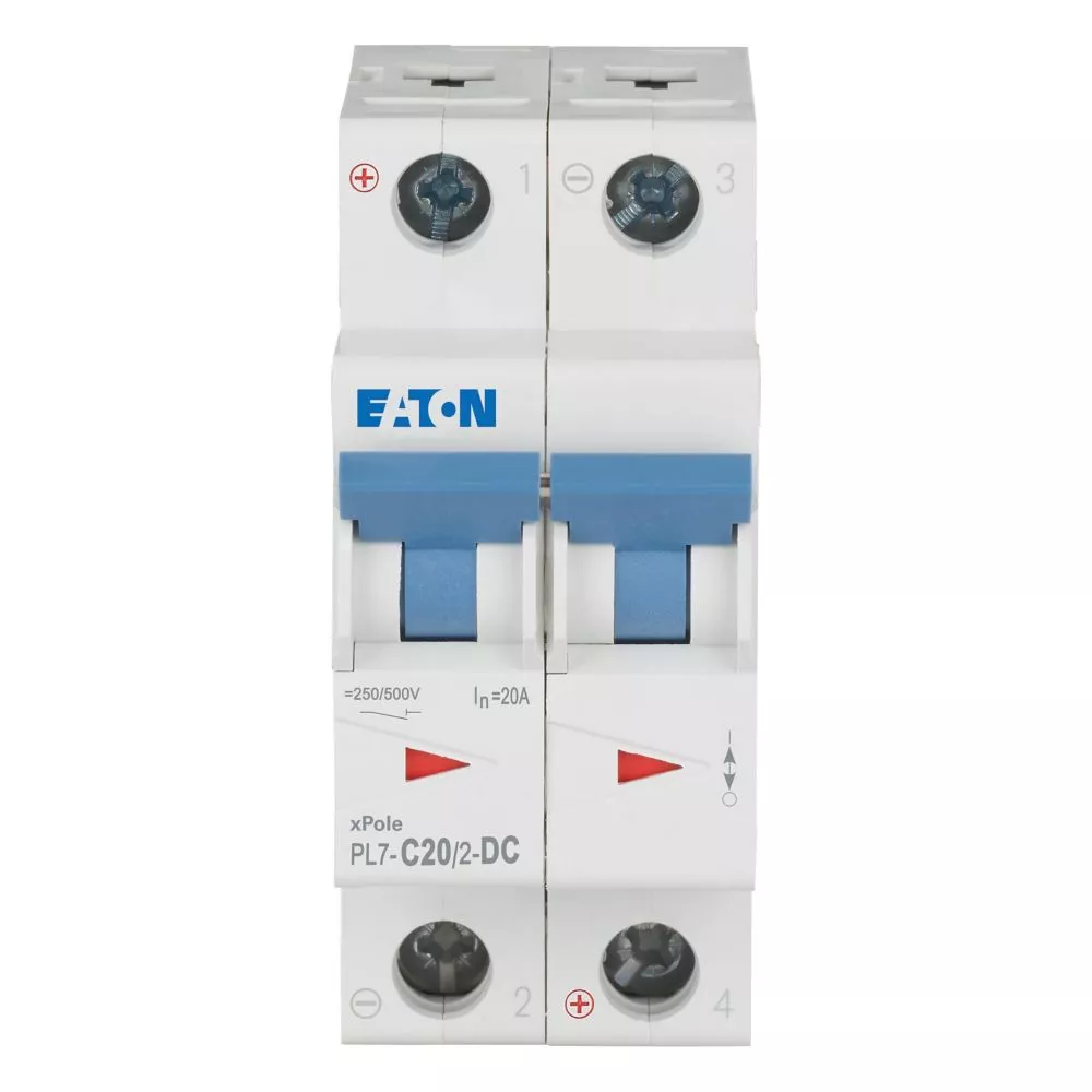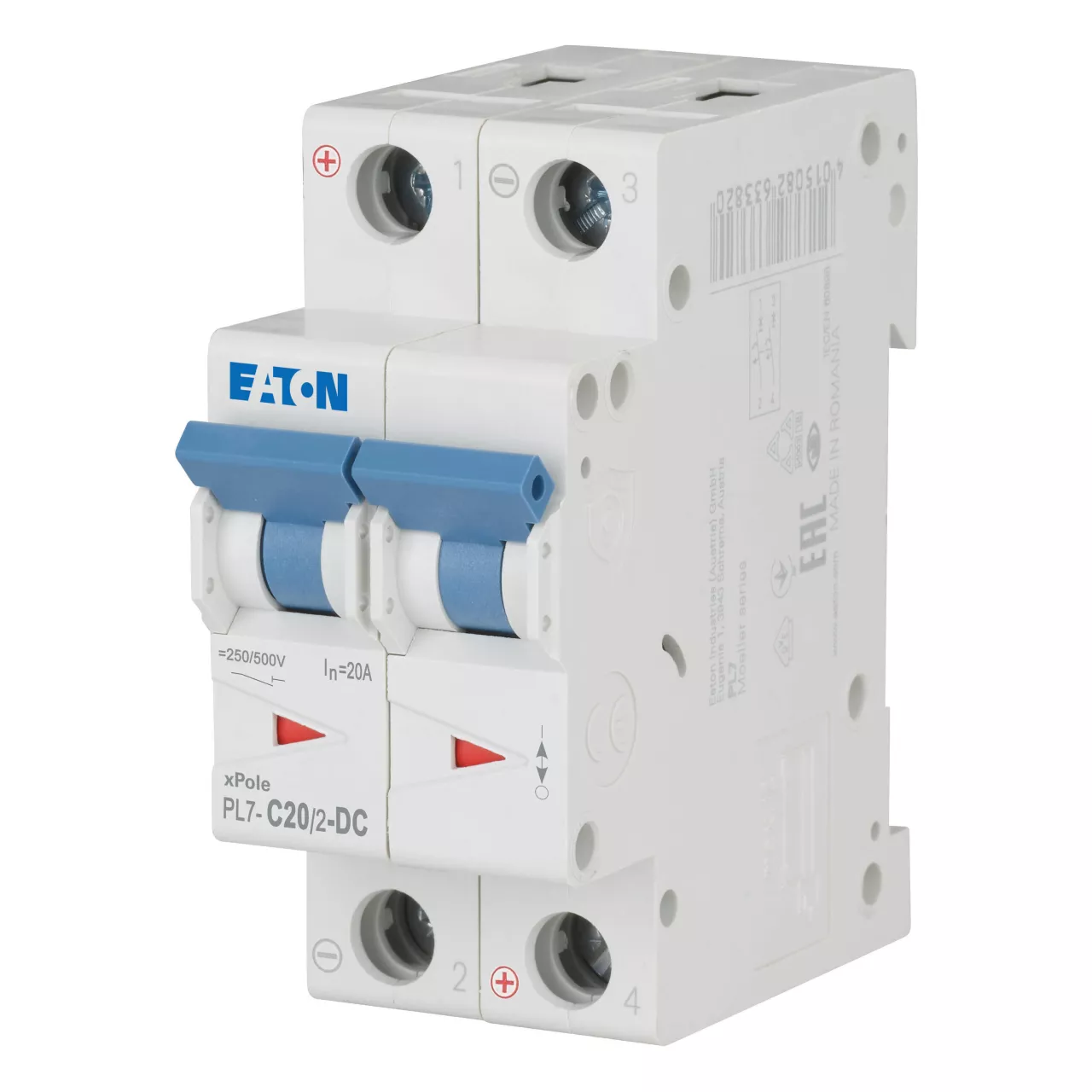 Leitungsschutzschalter (MCB), PL7, 2-polig, Auslösecharakteristik: C, Bemessungsstrom Ein: 20 A, Bemessungsschaltvermögen nach IEC/EN 60947-2: 10 kA, Schaltgeräte für DC-Anwendungen