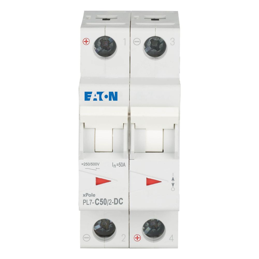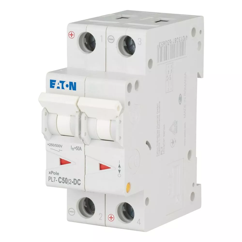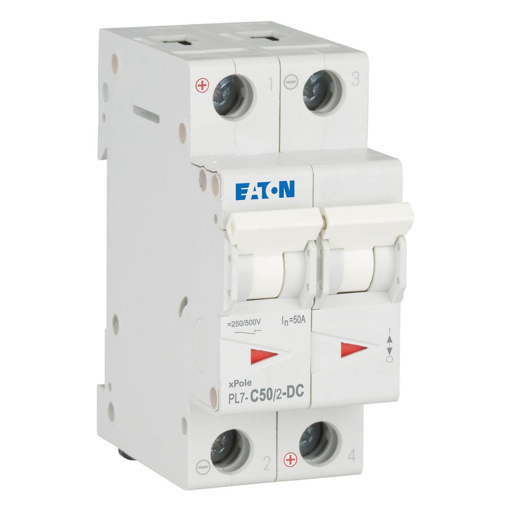 Leitungsschutzschalter (MCB), PL7, 2-polig, Auslösecharakteristik: C, Bemessungsstrom Ein: 50 A, Bemessungsschaltvermögen nach IEC/EN 60947-2: 10 kA, Schaltgeräte für DC-Anwendungen