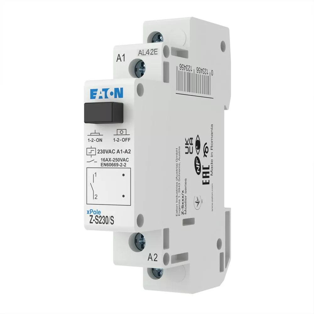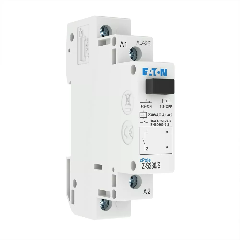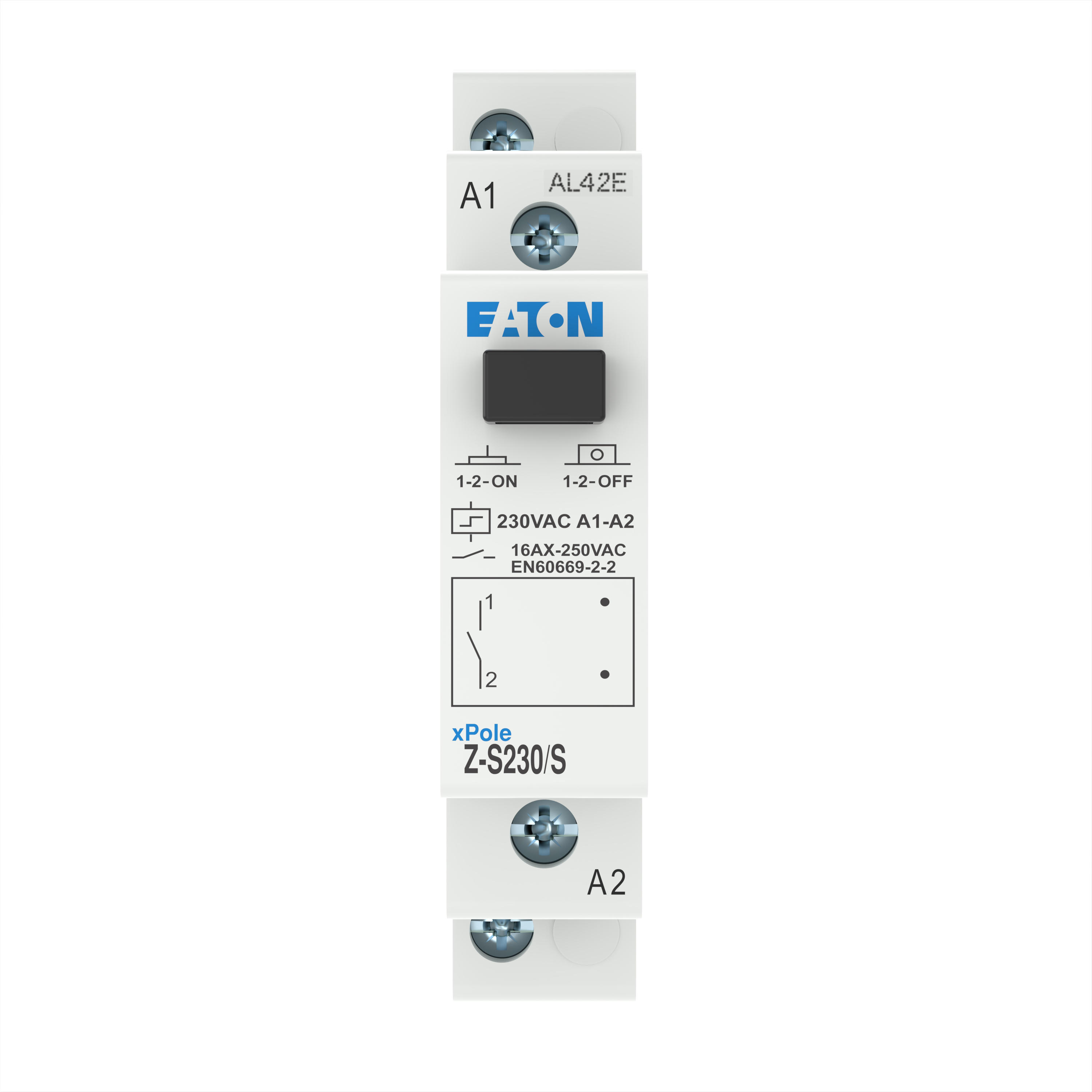 Stromstoßschalter, Steuerspannung 230 V 50 Hz, Funktion: 1 S, Bemessungsbetriebsstrom bei 250 V AC gemäß IEC/EN 60669-2-2: 16 A, Kappenmaß 45 mm, Montagebreite 1 SU (17,5 mm), Hutschienenmontage, Klemmenquerschnitt 0,5 bis 10 mm² eindrähtig und flexibel/0,5 bis 6 mm² flexibel mit Aderendhülse