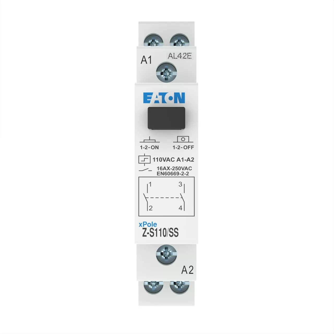 Stromstoßschalter, Steuerspannung 110 V 50 Hz, Funktion: 2 S, Bemessungsbetriebsstrom bei 250 V AC gemäß IEC/EN 60669-2-2: 16 A, Kappenmaß 45 mm, Montagebreite 1 SU (17,5 mm), Hutschienenmontage, Klemmenquerschnitt 0,5 bis 10 mm² eindrähtig und flexibel/0,5 bis 6 mm² flexibel mit Aderendhülse