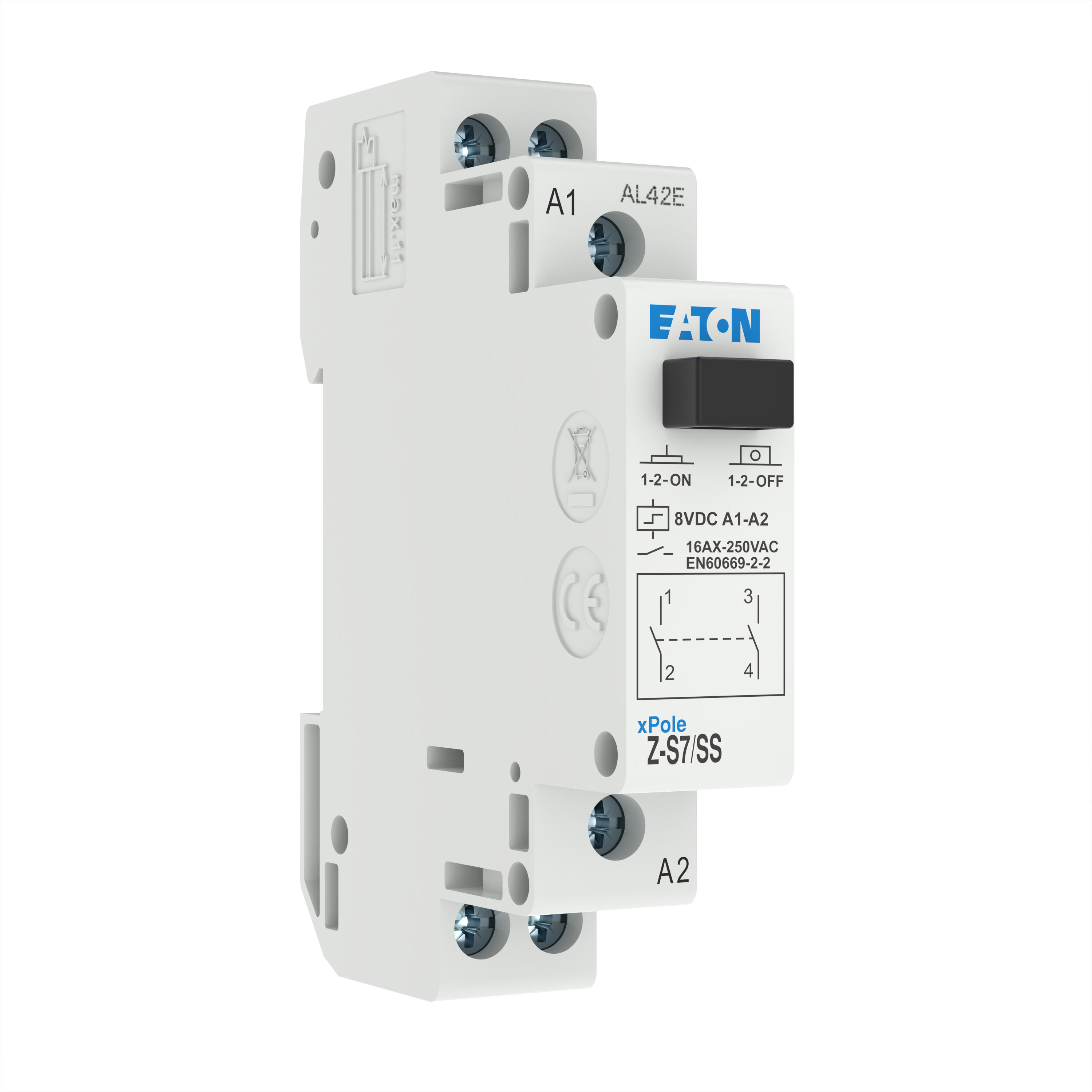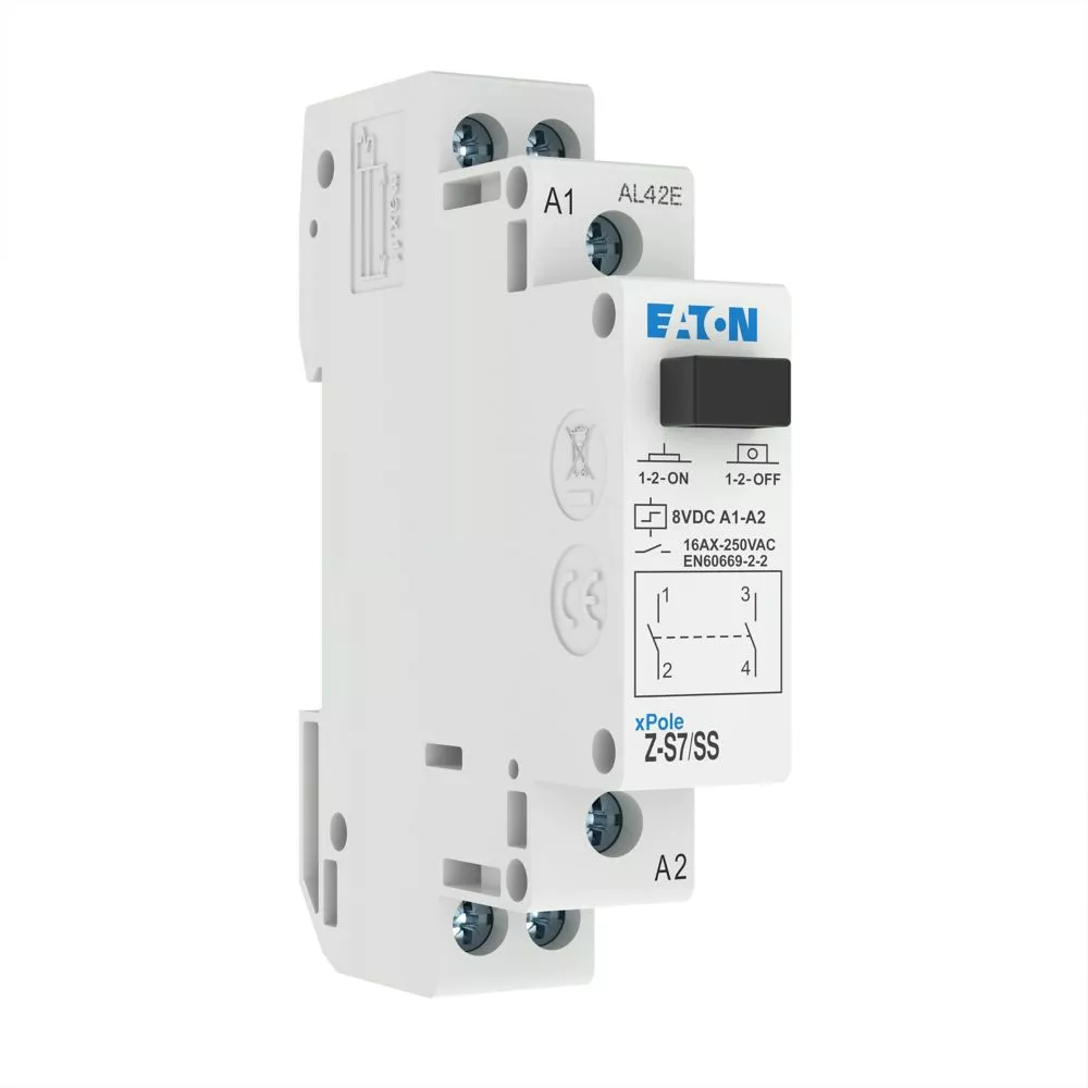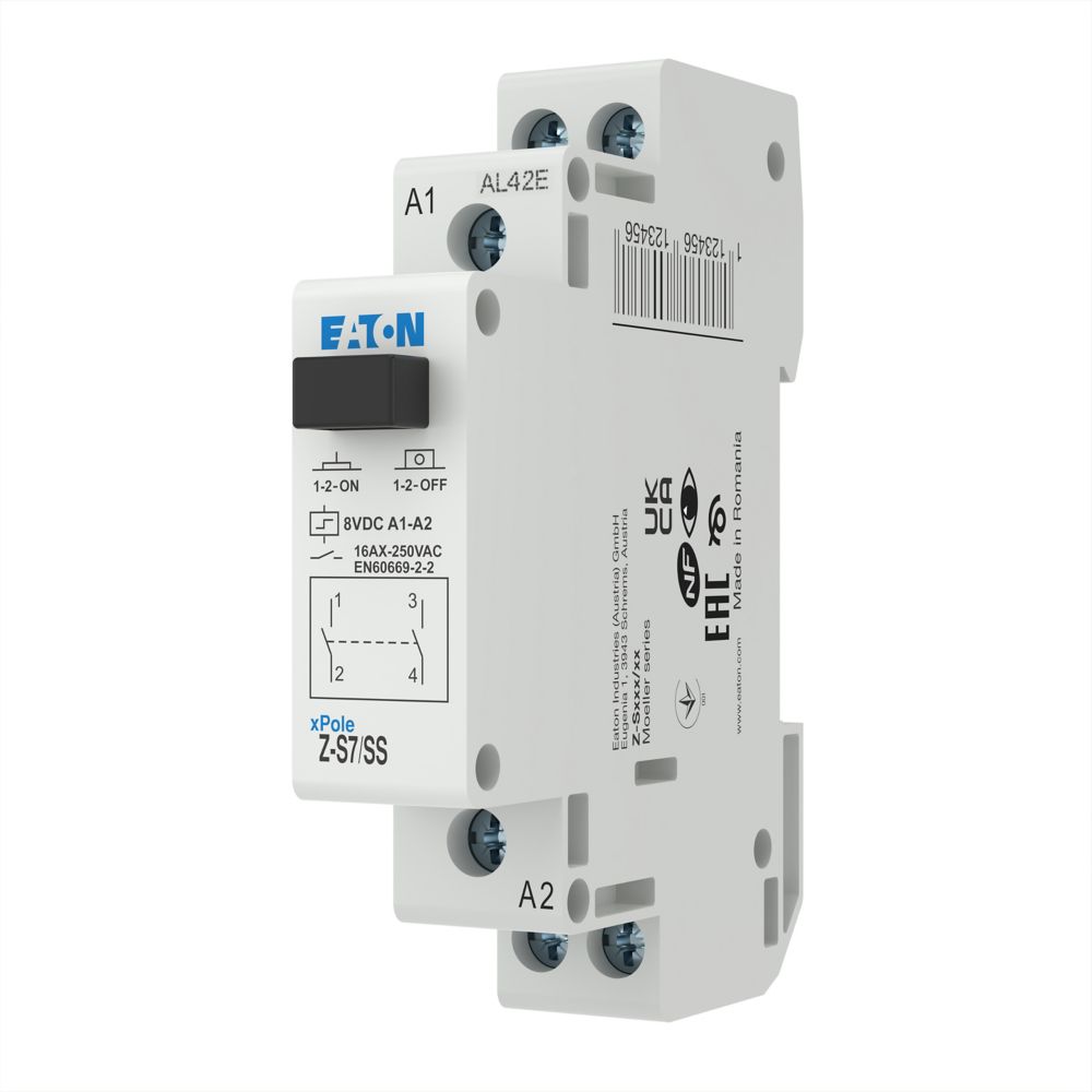 Stromstoßschalter, Steuerspannung 8 V DC, Funktion: 2 S, Bemessungsbetriebsstrom bei 250 V AC gemäß IEC/EN 60669-2-2: 16 A, Kappenmaß 45 mm, Montagebreite 1 SU (17,5 mm), Hutschienenmontage, Klemmenquerschnitt 0,5 bis 10 mm² eindrähtig und flexibel/0,5 bis 6 mm² flexibel mit Aderendhülse