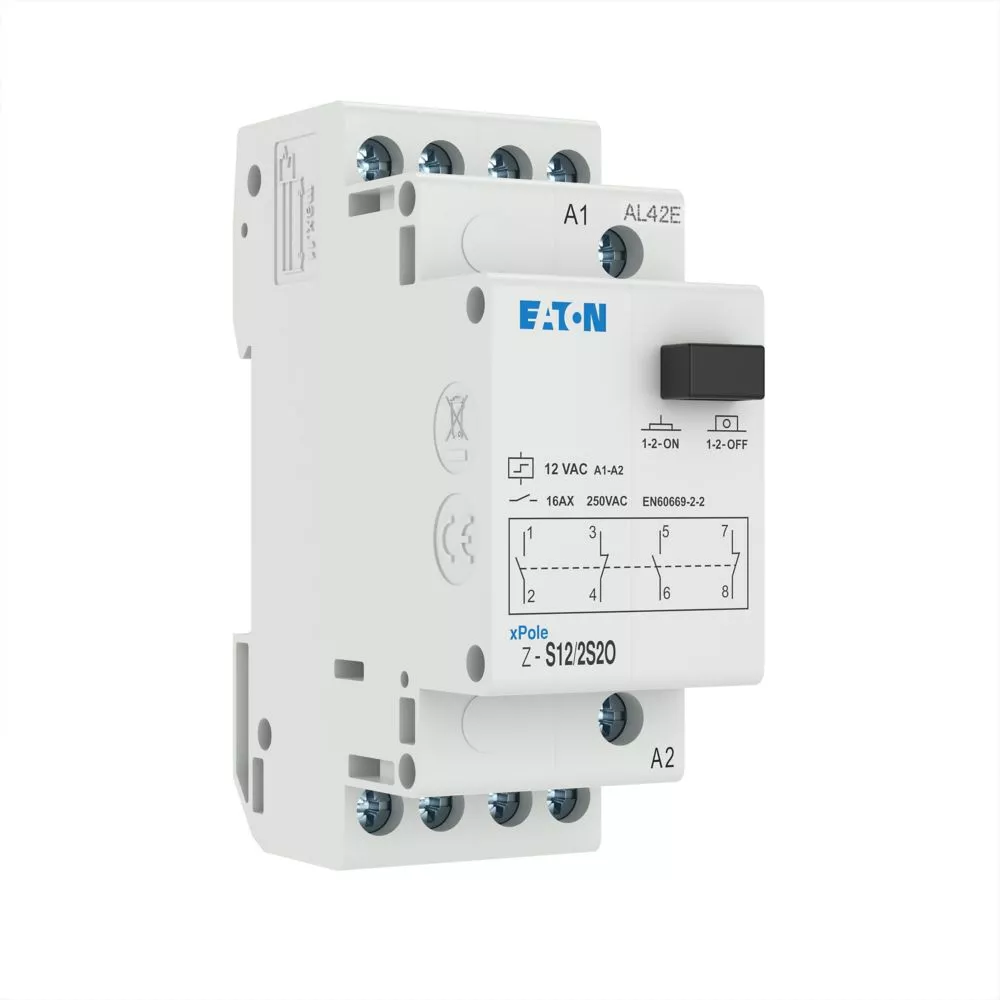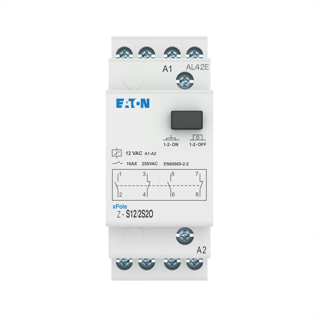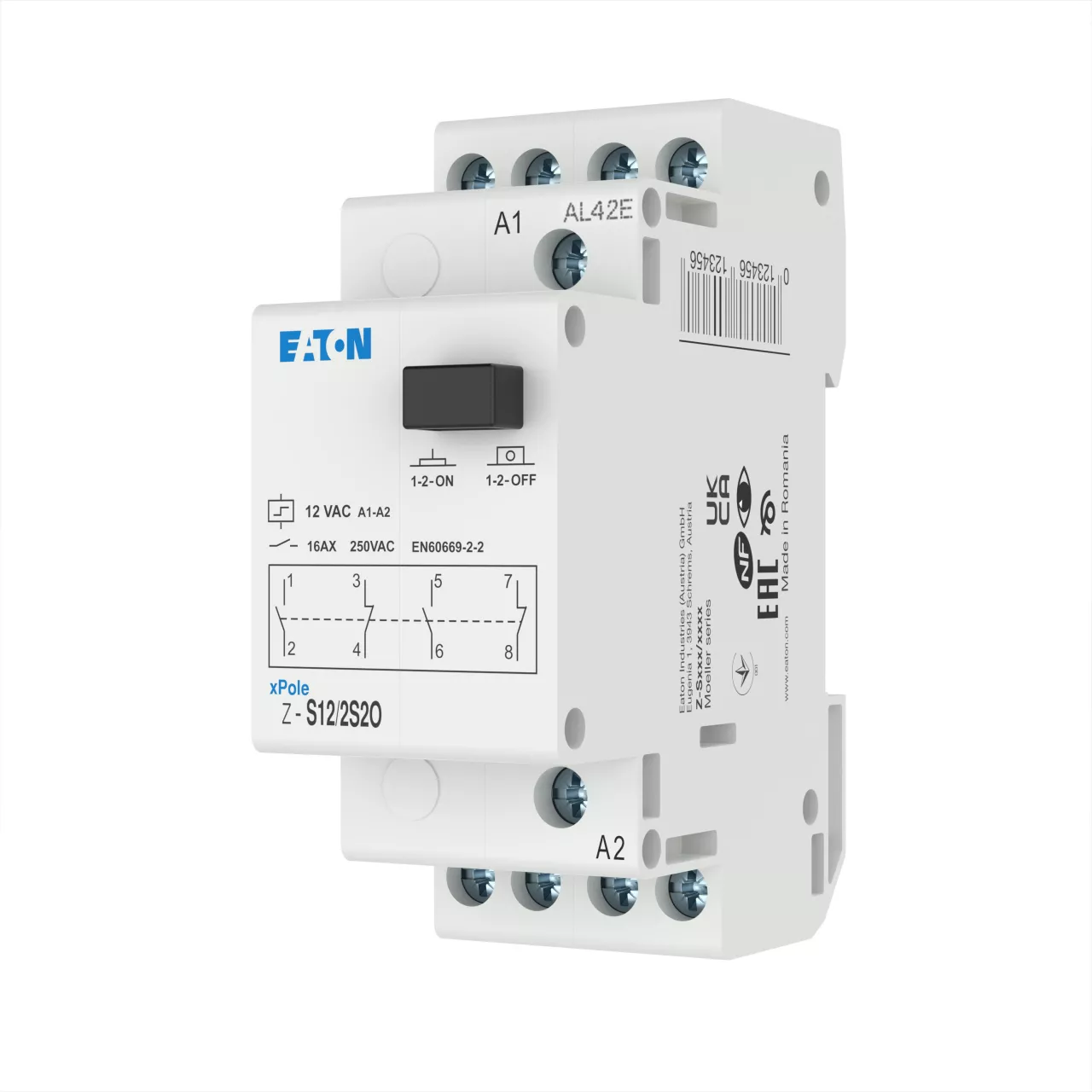 Stromstoßschalter, Steuerspannung 12 V 50 Hz, Funktion: 2 S und 2 Ö, Bemessungsbetriebsstrom bei 250 V AC gemäß IEC/EN 60669-2-2: 16 A, Kappenmaß 45 mm, Montagebreite 2 SU (35 mm), Hutschienenmontage, Klemmenquerschnitt 0,5 bis 10 mm² eindrähtig und flexibel/0,5 bis 6 mm² flexibel mit Aderendhülse