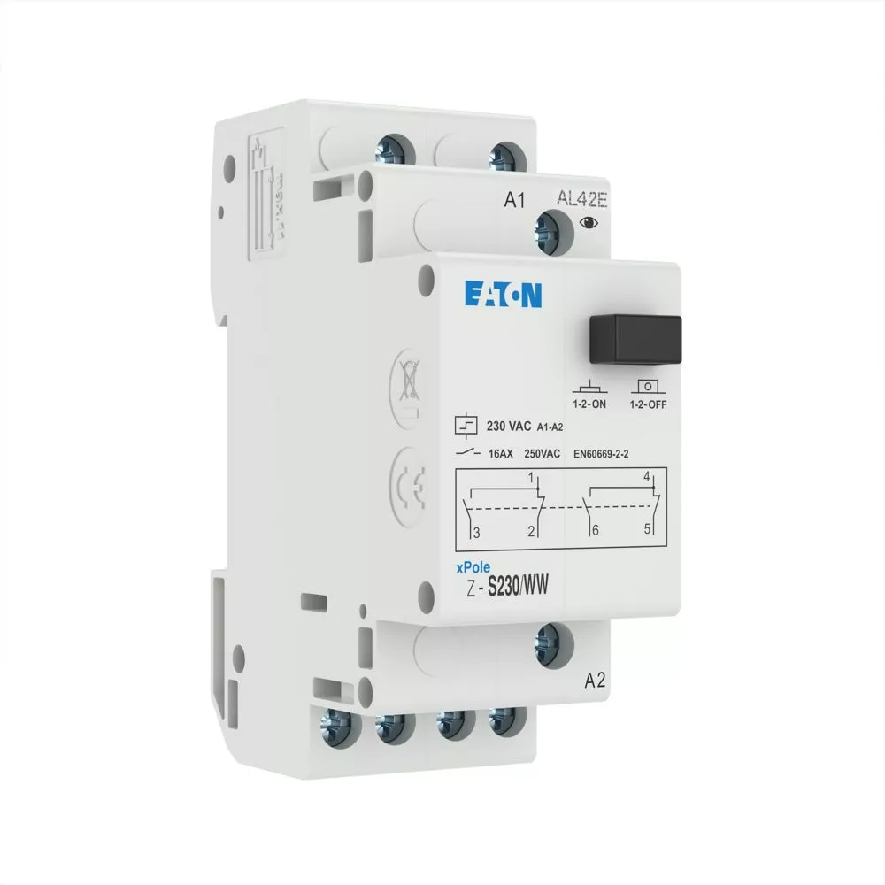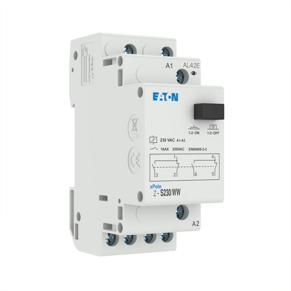 Stromstoßschalter, Steuerspannung 230 V 50 Hz, Funktion: 2 Umschaltkontakte, Bemessungsbetriebsstrom bei 250 V AC gemäß IEC/EN 60669-2-2: 16 A, Kappenmaß 45 mm, Montagebreite 2 SU (35 mm), Hutschienenmontage, Klemmenquerschnitt 0,5 bis 10 mm² eindrähtig und flexibel/0,5 bis 6 mm² flexibel mit Aderendhülse