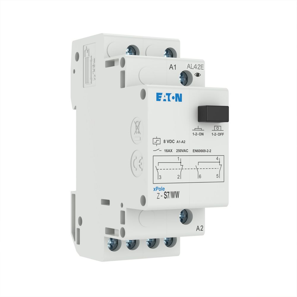 Stromstoßschalter, Steuerspannung 8 V DC, Funktion: 2 Umschaltkontakt, Bemessungsbetriebsstrom bei 250 V AC gemäß IEC/EN 60669-2-2: 16 A, Kappenmaß 45 mm, Montagebreite 2 SU (35 mm), Hutschienenmontage, Klemmenquerschnitt 0,5 bis 10 mm² eindrähtig und flexibel/0,5 bis 6 mm² flexibel mit Aderendhülse