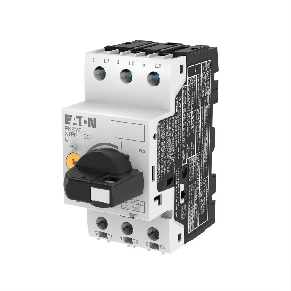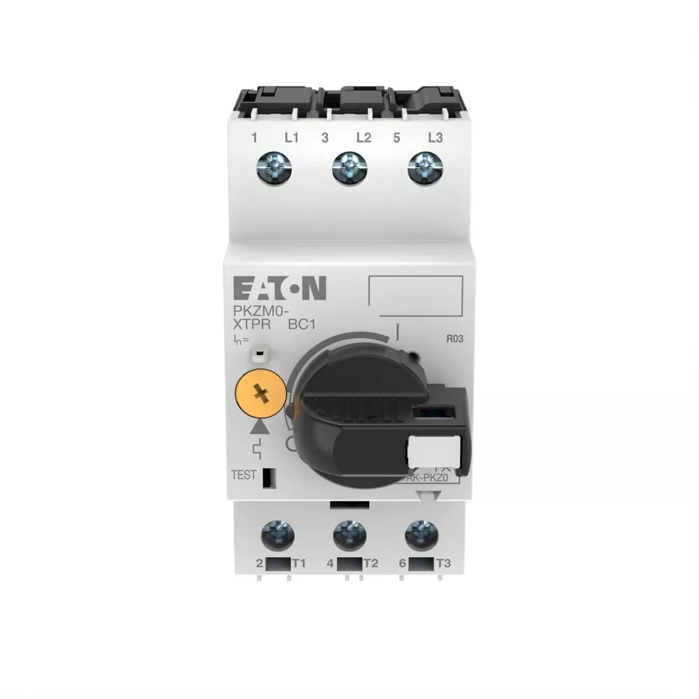 Motorschutzschalter mit abschließbarem Drehknebel nach IEC/EN60947, 3-polig Baugröße PKZM0, mit einstellbaren Überlast- und unverzögertem Kurzschlußauslöser, phasenausfallempfindlich, Schraub und Schnappmontage, mit Schraubklemmen, Kappeneinbaumaß 45mm, Bemessungsbetriebsspannung Ue 690V, Schutzart IP20, fingersicher nach VDE 0106 T. 100, Zubehör: Hilfsschalter, Spannungsauslöser, Schalter Modul, Clipsplatte