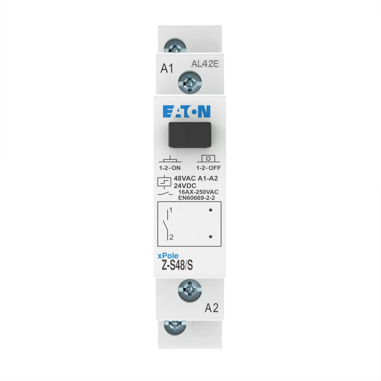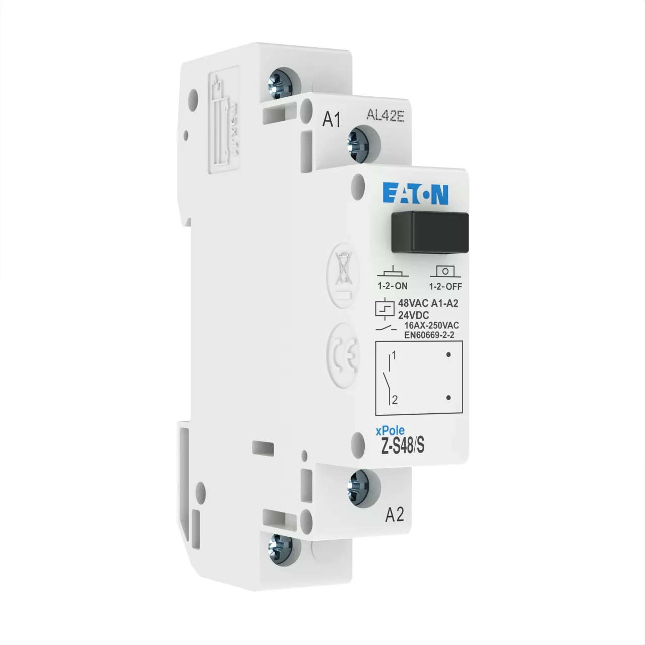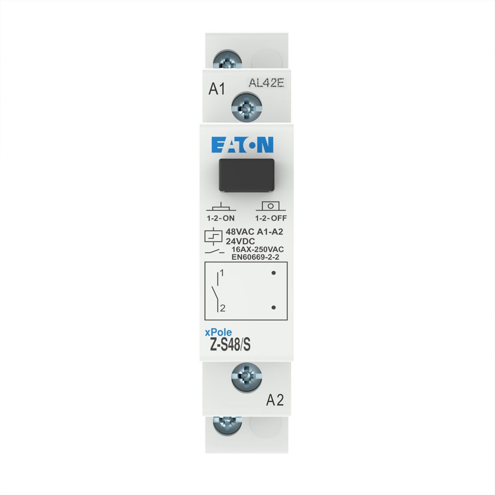 Stromstoßschalter, Steuerspannung 48 V AC / 24 V DC, Funktion: 1 S, Bemessungsbetriebsstrom bei 250 V AC gemäß IEC/EN 60669-2-2: 16 A, Kappenmaß 45 mm, Montagebreite 1 SU (17,5 mm), Hutschienenmontage, Klemmenquerschnitt 0,5 bis 10 mm² eindrähtig und flexibel/0,5 bis 6 mm² flexibel mit Aderendhülse