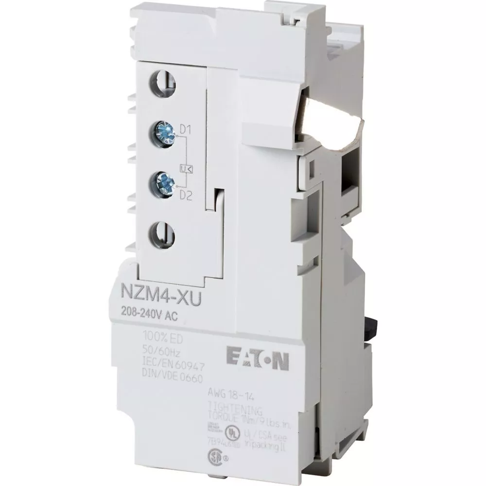 Optionele accessoires voor de vermogensschakelaars uit de serie NZM bieden een uitgebreid assortiment toepassingsopties voor gebruik wereldwijd. De montage is altijd flexibel en eenvoudig dankzij de modulaire functiegroepen. Opmerkingen: onvertraagde uitschakeling van NZM-vermogensschakelaar of N-lastscheider wanneer de stuurspanning daalt tot onder 35-70% US. Te gebruiken bij noodstopapparaten in combinatie met een noodstopknop. Wanneer de onderspanningslosser spanningsloos is, onbedoeld contact met de hoofdcontacten van de schakelaar wordt tijdens inschakelingspogingen op veilige wijze voorkomen