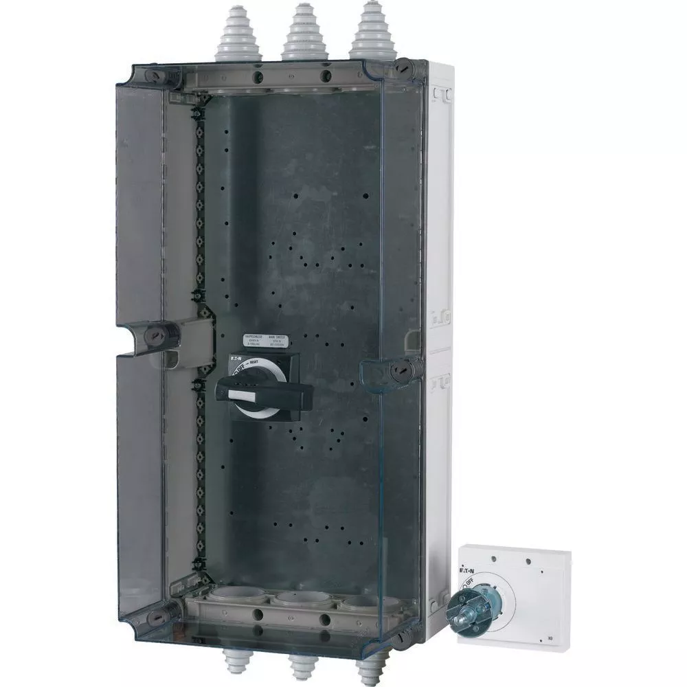 Isolierstoffgehäuse Ci, Schutzart IP65, HxBxT=750x375x275mm, für NZM Baugröße 3, Schutzklasse 2, schlagfestes Polycarbonat, Schalter-Türkupplungsdrehgriff schwarz inklusive, Montageplatte vorgebohrt für Schalter und optionale PE/N-Klemmen, Gehäuseabdeckung vorbereitet für Drehgriff, Kappe transparent rauchgrau, Laschen für die Wandmontage, einschließlich Kabeleinführungsflansch oben und unten sowie Kabeleinführungstülle.