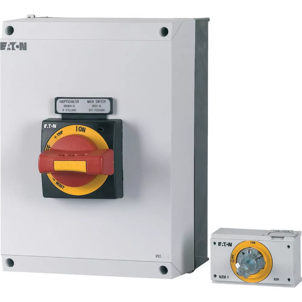 Isolierstoffgehäuse Ci, Schutzart IP65, HxBxT=280x200x160mm, für NZM Baugröße 1, Schutzklasse 2, schlagfestes Polycarbonat, Schalter-Türkupplungsdrehgriff in Rot/Gelb inklusive, Lochplatte für Schalter und optionale PE/N-Klemmen, Gehäusedeckel vorbereitet für Drehgriff, undurchsichtiger Deckel, Wandbefestigungswinkel, inklusive Kabeleinführungsflansche oben und unten.