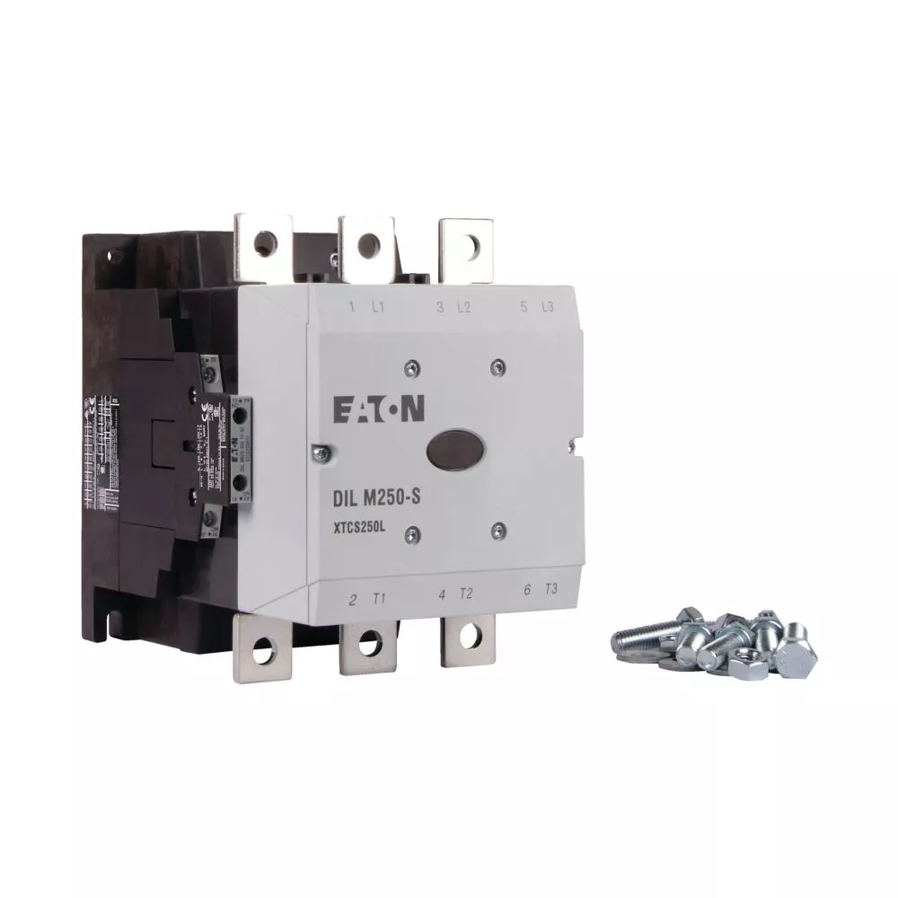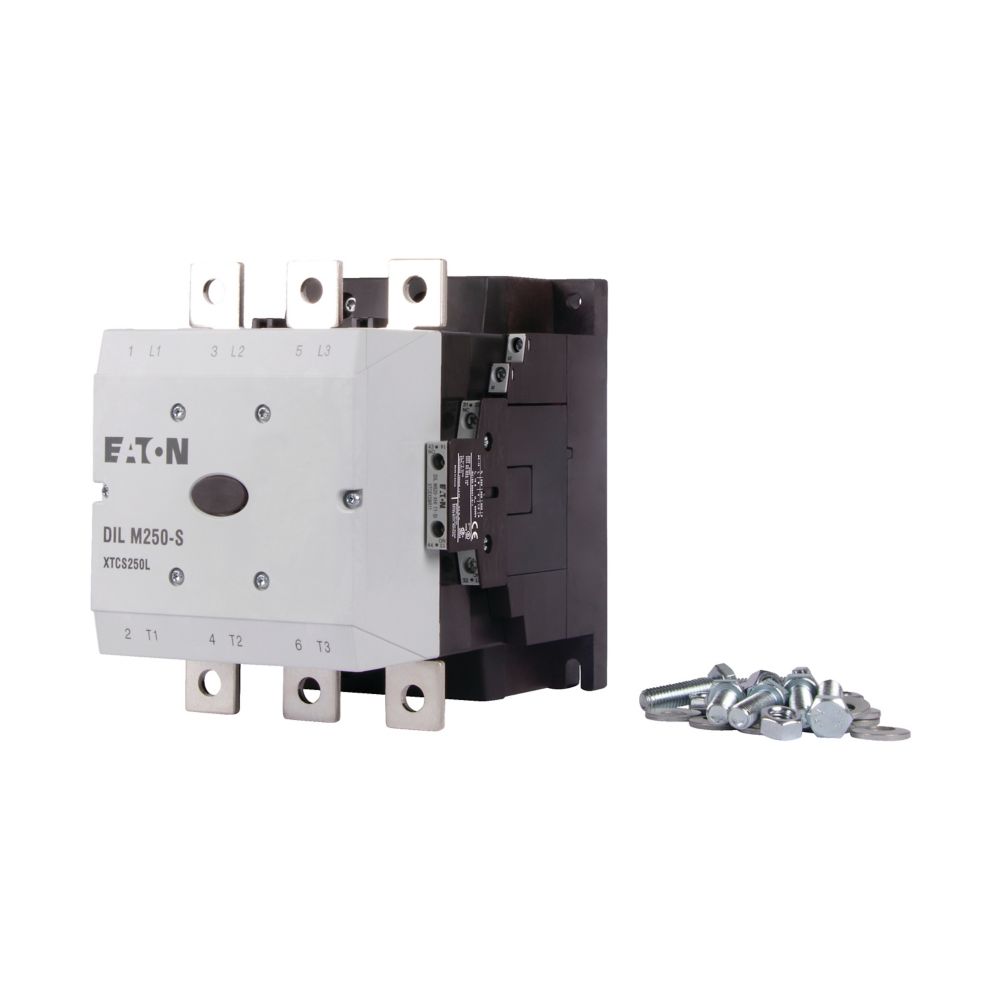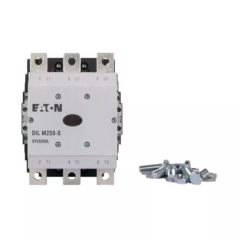 Stycznik, Zastosowanie: Styczniki do silników, urządzenia standardowe powyżej 170 A, kategoria użytkowa: AC-1: Obciążenia nieindukcyjne lub obciążenia o małej indukcyjności, piece oporowe, NAC-3: Standardowe silniki indukcyjne AC: rozruch, wyłączanie w trakcie pracy, AC-4: Standardowe silniki indukcyjne AC: rozruch, hamowanie przeciwprądowe, nawrót, impulsowanie, Sposób podłączenia: Podłączenie na śrubę, Znamionowy prąd pracy AC-3, 380 V 400 V: Ie= 250 A, Znamionowy prąd pracy AC-1 Konwencjonalny prąd termiczny, 3-biegunowy, 50–60 Hz Bez obudowy przy 40°C: Ith =Ie= 430 A, w obudowie: Ith = 300 A, Znamionowy prąd pracy AC-1 Konwencjonalny prąd termiczny
