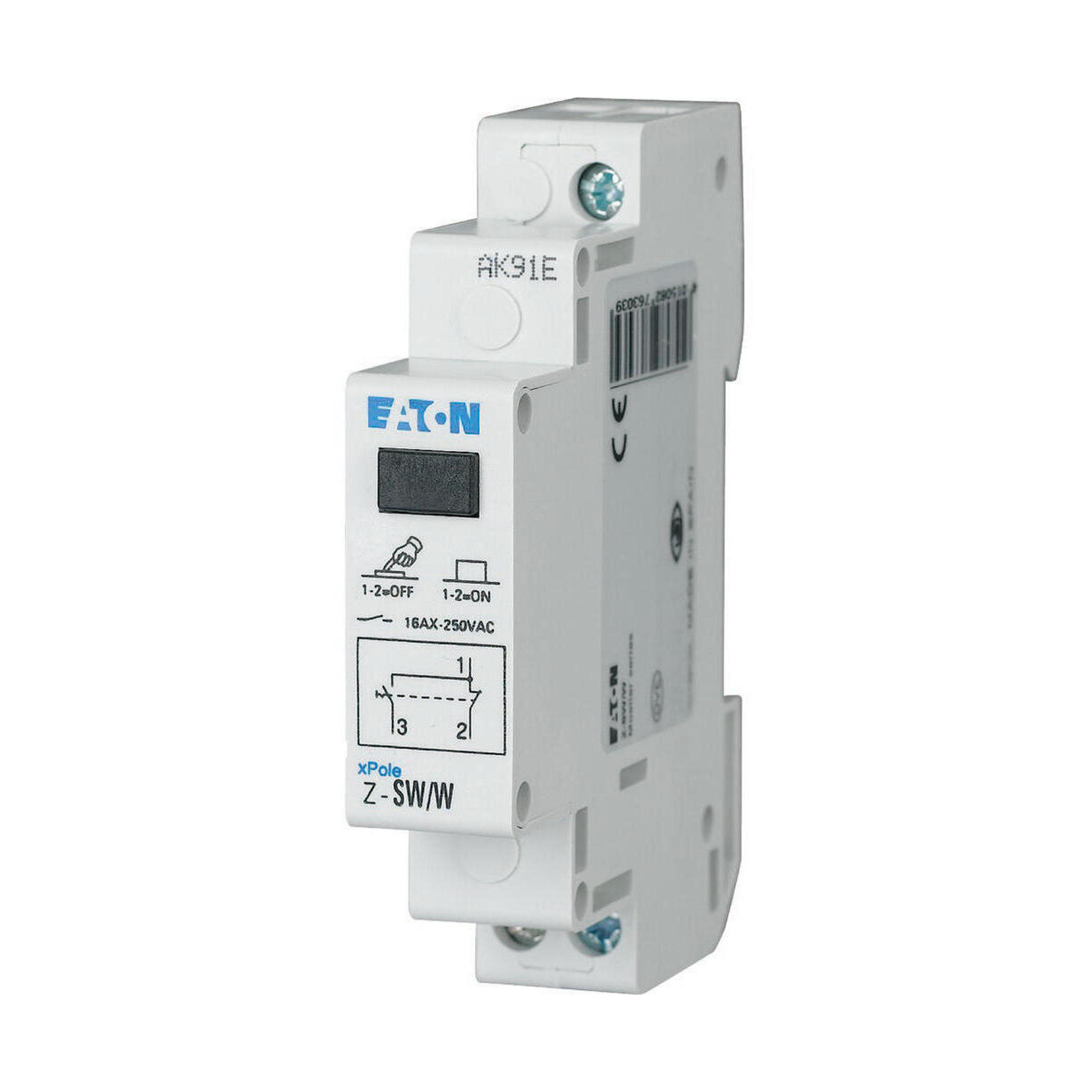 Schakelaar, functie: 1 wisselcontact, nominale bedrijfsstroom 16 A, nominale spanning 250 V AC, kleur van drukknop zwart, standaardafmeting voorkant 45 mm, montagebreedte 1 MU (17,5 mm), DIN-rail montage, klemdoorsnede 1-10 mm², type volgens IEC/EN 60669, VDE 0632