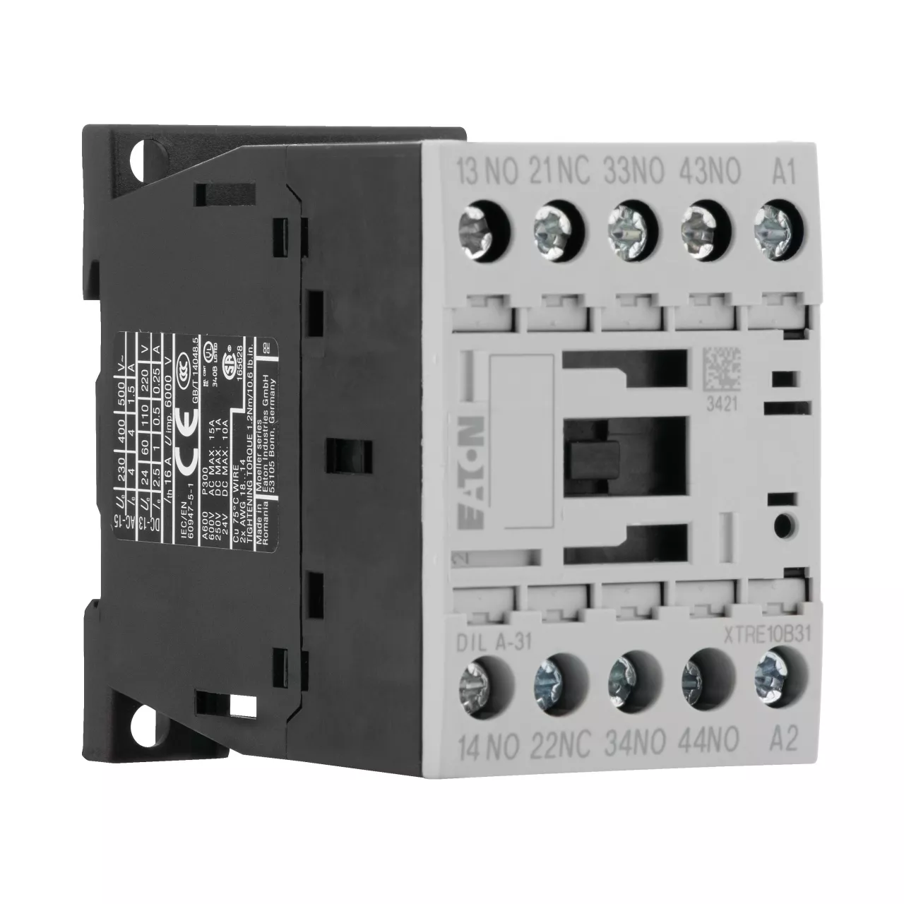 Hulprelais, assortiment: DILA relais, toepassing: magneetschakelaar, beschrijving: Basisapparaten met positieve bedieningscontacten, aansluittechniek: schroefklemmen, nominale bedrijfsstroom AC-15 220 V 230 V 240 V: Ie= 4 A, 380 V 400 V 415 V: Ie= 4 A, contacten no = normaal open: 3 no, contacten nc = normaal gesloten: 1 nc, codenummer en versie van combinatie specifiek nummer: 31E, kan gecombineerd worden met een hulpcontactmodule: DILA-XHI(V)…, stuurspanning: 230 V 50 Hz, 240 V 60 Hz, spanning AC/DC: AC-bedrijf, beschermingsgraad: IP20, instructies: contactnummers volgens EN 50011, markeringen op spoelklemmen volgens EN 50005
